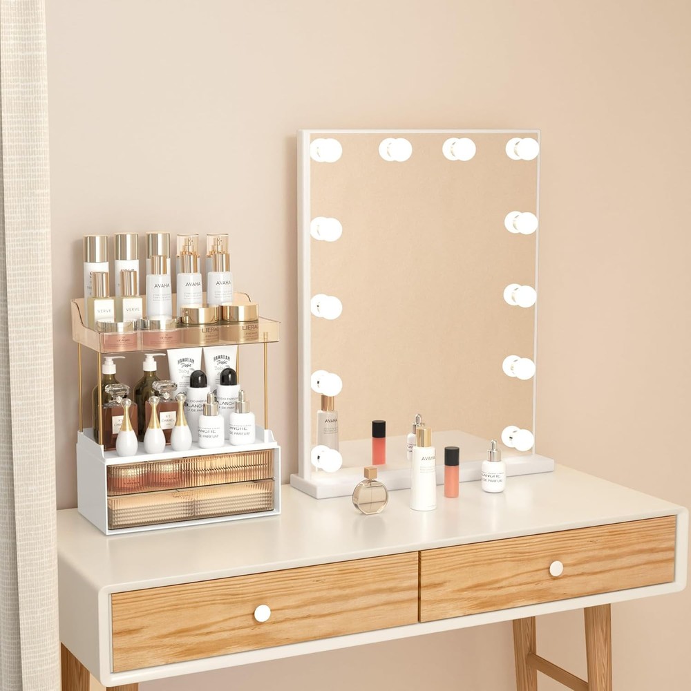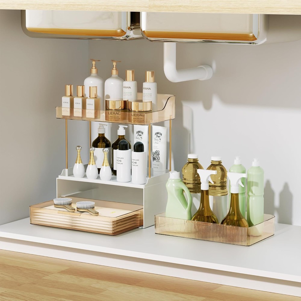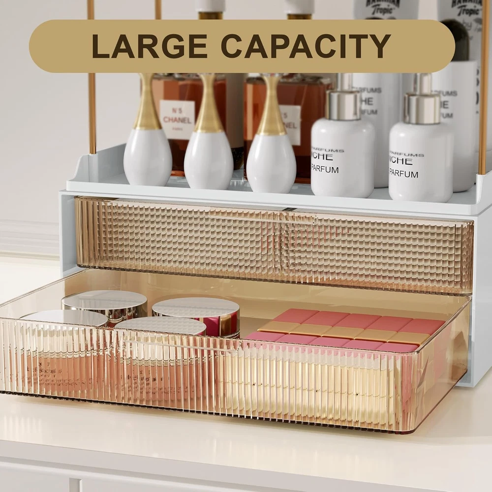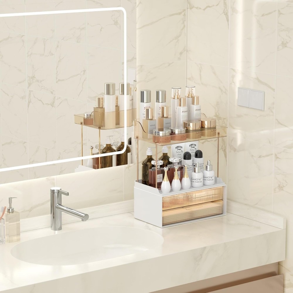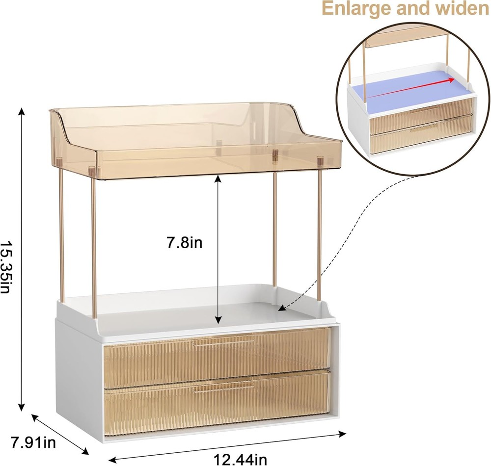Bathroom Counter Organizer with 2-Drawer, 3 Tier Makeup Amber Description Features: VERSATILE AND STYLISH: It's the perfect combination of function and style, it comes in a wide range of colors, fitting seamlessly with your bathroom decor while providing double drawers to hide away all your toiletries and essentials. Adds a modern, organized touch to any bathroom without taking up too much space. IDEAL FOR STORAGE SPACE:Not only for beauty and cleaning products in the bathroom, but also for spice jars in the kitchen. Transparent design allows you to see at a glance, easy to find what you need, for you to create a more tidy and organised living space. GREAT GIFT FOR MOTHER/DAUGHTER: As the best gift for Christmas, New Year, Mother's Day, first day of school. Makes a great gift for a teenage, young lady or grown woman to help them organize their items better. EASE TO ASSEMBLE: Just need 5 minutes you'll get a 3-layer makeup shelf. Made of sturdy plastic, lightweight and less fragile. No tools needed. Holding some makeup, nail polish, lipsticks, hair treatments, skincare, etc that can all be organized & stored on this 3 tiered piece. LARGE CAPACITY STORAGE SPACE: The top is perfect for daily items and tall bottles, with a little edge to stop things from sliding out. The double drawers are great for hiding away items you want to keep out of sight, making the most of the space. Product Details: Specific Uses For Product: Cosmetics Material: Acrylic Special Feature: Stackable Color: Amber Brand: DOADW Finish Type: Brushed Product Dimensions: 3"D x 8"W x 6"H Number of Items: 1 Manufacturer: DOADW Part Number: 3476 Item Weight: 4.53 pounds Country of Origin: China Item model number: 3476 Finish: Brushed Special Features: Stackable Included Components: / Batteries Included?: No Batteries Required?: No Specific Uses For Product: Cosmetics Material: Acrylic Special Feature: Stackable Color: Amber Brand: DOADW Finish Type: Brushed Product Dimensions: 3"D x 8"W x 6"H Number of Items: 1 Manufacturer: DOADW Mounting TypeUnit Count: Tabletop Mount1.0 Count Handling We will ship all orders within 3 business day of payment. Delivery We take pride in offering fast and reliable delivery for your orders! We are committed to getting your products to you as quickly as possible. Generally, we would like to inform you that all orders will be delivered to you within 1-3 business days after processing.However, in some cases, delivery times may vary depending on the buyer's location. Especially in remote or rural areas, the expected delivery time may be extended. In such situations, we do our best to ensure that your order reaches you as quickly as possible.If there are any delays, we will be happy to contact you to explain the situation. Our goal is to enhance your satisfaction with our fast delivery times. We work diligently to ensure that your order arrives safely.Trust us and enjoy our speedy delivery! Return Policy All items qualify for returns within 30 days of receipt. Buyer is responsible for return shipping on any item that is not damaged. Feedback We take our reputation seriously, we buy and sell online, so we understand the value of trust. If you are unsatisfied with your order, please contact us and we will work with you to resolve it to your satisfaction.