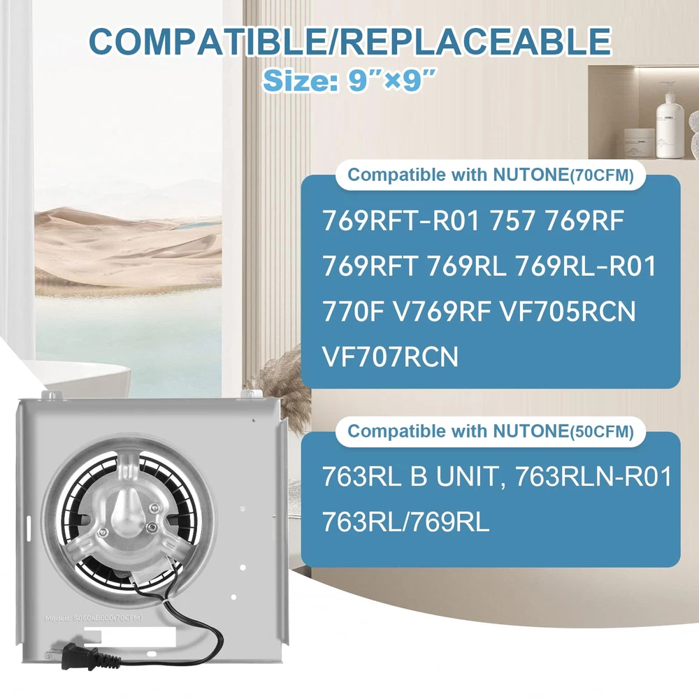 【Compatible with Nutone models】: Compatible with Nutone 769RL B unit bathroom fan, 763RL "A" unit, 769RL, 769RL-R01,769RF, 769RFT, 769RFT-R01, 757, VF707RC. Fully compatible with NuTone fan motors and other fan components of the same size (9"x 9" blades). After testing, the fan power unit assembly is only 2.0 Sones, 70CFM, ensuring you have a quiet and comfortable environment. 【 Upgraded Material 】 : The S0504B000 motor is made of pure copper material, which significantly improves work efficiency, extends service life, and directly enhances the durability and stability of the product, bringing you a true upgrade experience. 【 Quality Assurance 】 Adhering to the concept of putting customers first and trusting product quality, we provide you with a free replacement service for non-human damage within 3 years. This product has satisfactory wind power, low noise, providing you with a more comfortable use experience. If you encounter any problems during use, please contact us and we will provide you with a satisfactory solution. 【Easy Installation】When the electric fan stops working or makes an abnormal buzzing sound, you don't need to spend a lot of money to buy a new replacement fan, nor do you need to cut the ceiling. You only need to use a screwdriver to remove the faulty motor and replace it with a new replacement fan motor, even beginners can get a comfortable new fan in just 10 minutes. 【 Keep Clean and Refreshing 】 With 70CFM super strong wind power, you can have a dry and comfortable room. If the bathroom is filled with steam in daily life and the air in the room is humid, this 769rl b unit replacement motor fan will be your top choice, accelerating air circulation and ensuring you have a clean and dry air quality.