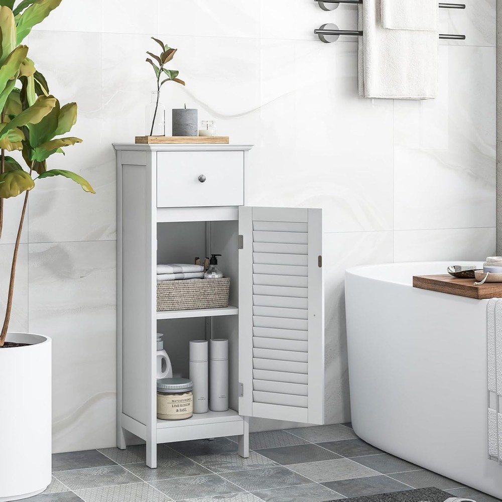 Product Description Description Sicked of staying in a disordered room? Our exquisite and practical bathroom floor cabinet would be one of the rightest choice for you to start to own a tidy and clean room. Constructed of superior wood, together coated with selected painting material, this bathroom storage cabinet can withstand the humidity, especially suitable for bathroom or toilet use. With its chic and elegant appearance, it can also be used as a side cabinet to whether place it in the living room nor kitchen, adding a touch of elegance without any doubt! In addition, it is easy for you to clean it with a damp cloth due to the smooth lacquered surface. Just bring this storage cabinet home now! You won’t be regretted! Feature Minimalist yet practical design, matching most home decor Ample storage space, ideal for storing bath essentials, first aid kit, soaps, etc. Constructed of superior P2 MDF, assuring durability, stability, great load-bearing capacity Adjustable inner shelf for flexibility, storing things of different heights freely Shutter door design for extra air circulation to better store your belongings Lacquered surface designed to withstand the humidity, making it suitable for bathrooms Ideal for bathroom, living room, kitchen, entryway, hotel, inns Easy to assemble with detailed instruction and enclosed hardware set Specification Color: White Material: P2 MDF Overall dimension:13" x 12" x 34.5" (L x W x H) Feet height: 3" Drawer dimension: 10" x 6" (L x W) Net weight: 20 lbs Top board weight capacity: 20 lbs Shelf maximum weight capacity: 7 lbs Drawer weight capacity: 5 lbs Package includes: 1 x Bathroom floor cabinet On Aug 14, 2025 at 20:07:43 PDT, seller added the following information: