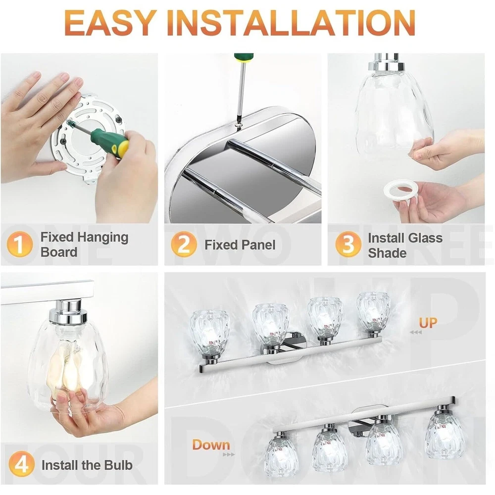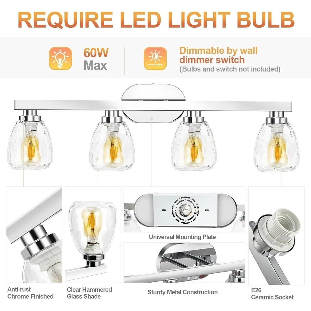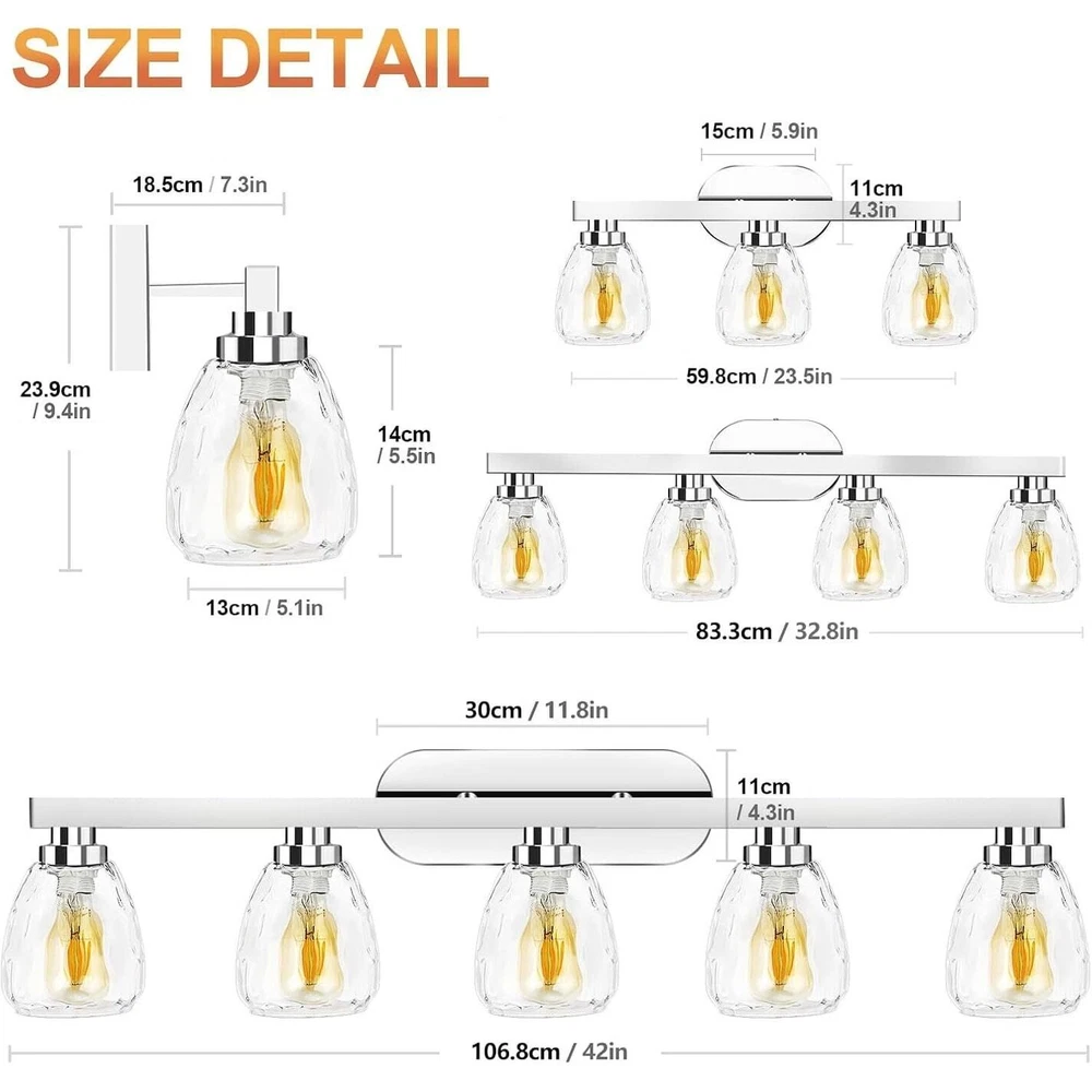 Sturdy and Stylish Construction: These bathroom light fixtures feature a robust chrome metal construction, complemented by a clear hammered glass shade. The geometric oval back and chrome finish sconce arms enhance both durability and visual appeal, making them an excellent choice for your home lighting and decor.Elegant Textured Glass Shade: The clear hammered glass shade adds a sophisticated texture and elegance to your bathroom and vanity areas. Its design allows it to seamlessly blend with various decor styles, including minimalist, modern, vintage, rural farmhouse, and industrial aesthetics.Versatile Mounting Options: Designed for flexibility, this chrome bath wall sconce can be mounted in either the up or down position. Constructed from premium iron with a bright chrome finish, it is Free Shipping Over $49.99* Details Bathroom Light Fixtures, with Hammered Glass Shade(without Bulb) Product Description: Sturdy and Stylish ConstructionThese bathroom light fixtures feature a robust chrome metal construction, complemented by a clear hammered glass shade. The geometric oval back and chrome finish sconce arms enhance both durability and visual appeal, making them an excellent choice for your home lighting and decor. Elegant Textured Glass ShadeThe clear hammered glass shade adds a sophisticated texture and elegance to your bathroom and vanity areas. Its design allows it to seamlessly blend with various decor styles, including minimalist, modern, vintage, rural farmhouse, and industrial aesthetics. Versatile Mounting OptionsDesigned for flexibility, this chrome bath wall sconce can be mounted in either the up or down position. Constructed from premium iron with a bright chrome finish, it is breakage-proof and rust-proof, ensuring that it maintains its stylish appearance for years to come while adding charm to your home. E26 US Standard SocketThe 3-bulb bathroom light fixtures accommodate any LED, CFL, or incandescent bulbs with an E26 base, with a maximum wattage of less than 60W per bulb. These vanity lights are fully dimmable when paired with dimmable bulbs and a compatible dimmer switch (bulbs and dimmer switch not included), allowing for customizable lighting. Wide Application RangeEasy to install and versatile in design, these modern bathroom lights can be widely used in various settings, including bathrooms, vanity areas, makeup rooms, mirror cabinets, dressing tables, kitchens, bedrooms, living rooms, studies, foyers, and hallways, making them a functional addition to any space in your home.