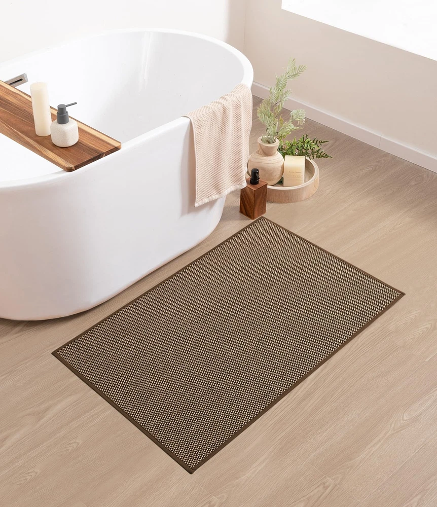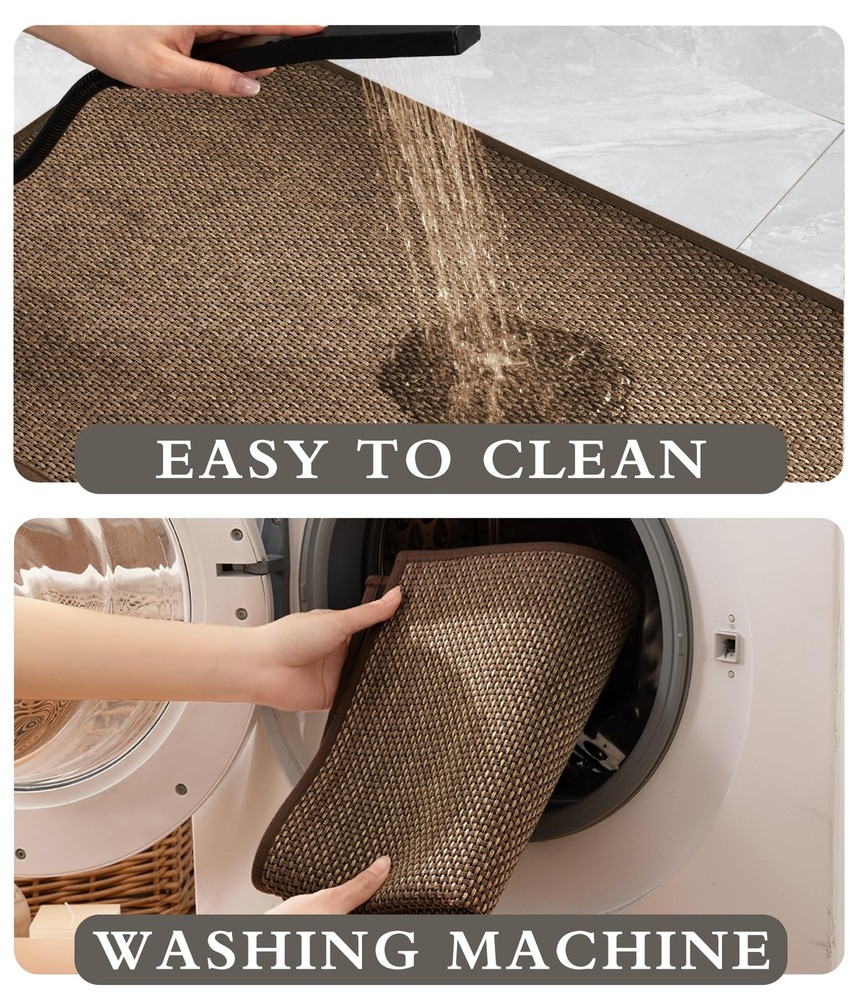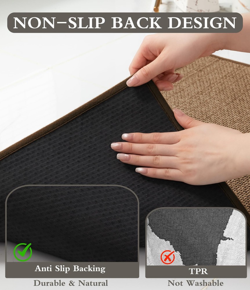 Bathroom Rugs Mat 25x36- Large Brown Non Slip Bath Mat Quick Dry Absorbent, Thin Bathroom Rugs Fit Under Door, Neutral Easy Jute Brown 25"x36" Bathroom Rugs Mat: This bath mat is made of soft easy jute material, retaining linen's beauty while improving slip resistance. It enhances bathroom decor with its natural charm. Bathroom Mat Quick Dry: This bath mat is made of ultra-thin and absorbent material, dries quickly after absorbing water. Its lightweight and compact design helps keep the bathroom floor dry. Non Slip Bath Mat : The non-slip rubber backing of the bath mat firmly grips ceramic and wooden floors, ensuring stability and safety in wet areas. Easy to Clean: The bath mat absorbs water and dries quickly when aired. Surface hair and dirt can be easily swept off or rinsed away. Thin Bathroom Rugs Fit Under Door : This ultra-thin bathroom mat fits perfectly under doors, preventing water from spreading and ensuring smooth door closure.