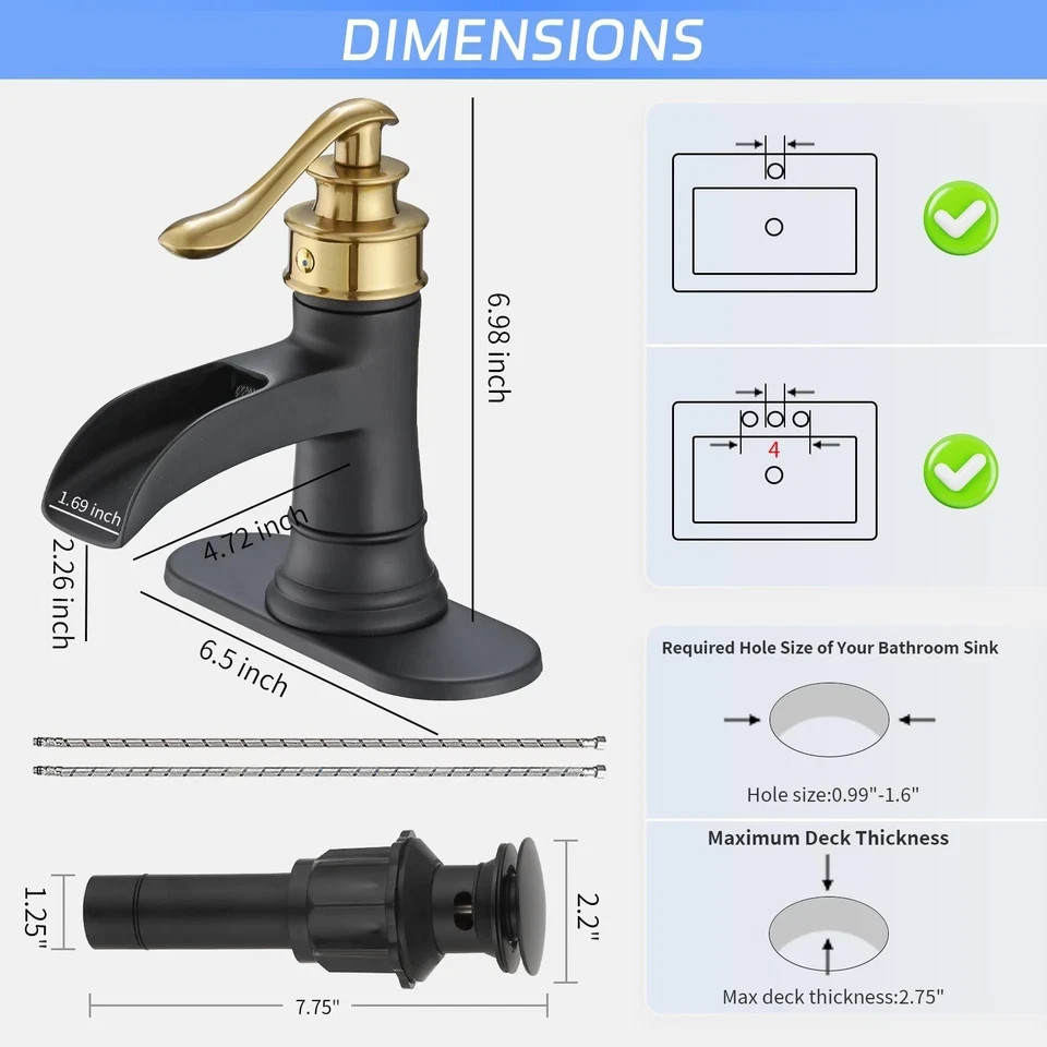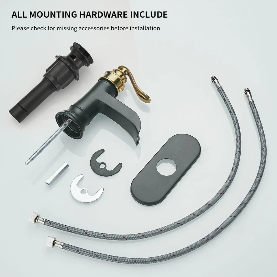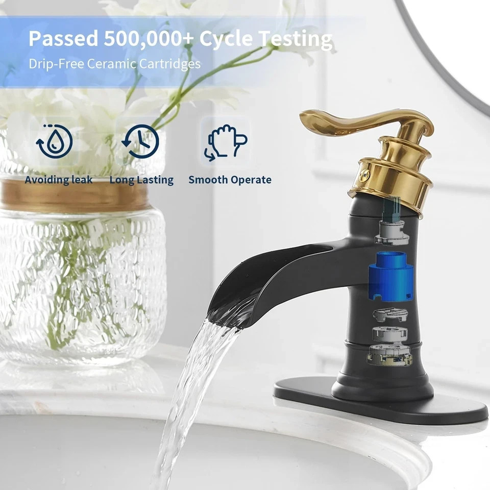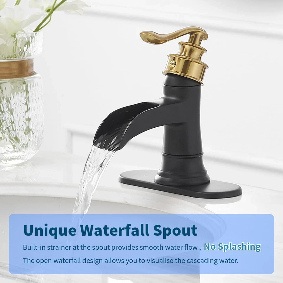 Size: Single Hole Bathroom Faucet Brand BWE Recommended Uses For Product Bathroom Mounting Type Deck Mount Finish Type matte black and gold Material Brass Color Black & Gold Number of Handles 1 Included Components Installation Hardware, faucet, hose Hole Count 1 Special Feature waterfall spout About this item Easy to Install: With a single hole deck mount, this bathroom sink faucet can be easily installed on any sink or countertop. Waterfall Design: The waterfall spout design delivers a gentle, cascading flow of water, making it a stylish and functional addition to any bathroom. High Quality-Solid brass bathroom faucet heavy duty material construction for reliable and durable.The cartridge adopts ceramic sealing technology,reduce leaking points and provide smooth water flow. Hassle-Free Maintenance: The finish is easy to clean and resists tarnishing, ensuring your faucet looks great for years to come. Smooth Operation: The single handle design allows for easy and precise temperature and water flow control, making it an ideal choice for daily use in any bathroom.