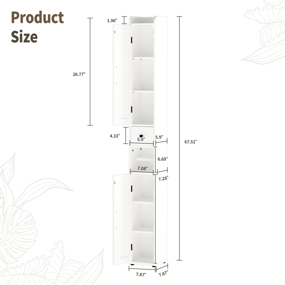 Product Description Product Features: Ultra-Slim Design, Space-Saving With a width of only 7.87 inches, this cabinet is specially designed for tight spaces. Perfect for corners in bathrooms, kitchens, or bedrooms, it maximizes space utilization and improves storage efficiency. Built-In Toilet Paper Holder, Practical & Convenient Features an integrated toilet paper roll holder—ideal for storing toilet paper, towels, and daily essentials. A versatile all-in-one cabinet that enhances everyday convenience. Adjustable Shelves, Flexible Storage The internal shelves are height-adjustable, making it easy to accommodate tall bottles, spare towels, and items of various sizes. Designed to meet diverse storage needs. Reversible Cabinet Door, Flexible Installation The cabinet door can be installed to open from either the left or right side, allowing for flexible placement to suit different room layouts and maximize usability. Sturdy & Durable, Safe to Use Made of high-quality MDF for reliable strength and longevity. Includes an anti-tip safety kit for added stability. Magnetic door closure ensures smooth and secure operation. Product Specifications: Dimensions: 7.87"D x 7.87"W x 67.51"H Product Weight (lbs.): 23.37 Package Size: 37.6"L x 9.84"W x 5.91"H Package Weight (lbs.): 28 Material: Premium MDF (Medium-Density Fiberboard) Color: White Assembly: Self-assembly required; instruction manual and hardware included On Aug 8, 2025 at 05:05:48 PDT, seller added the following information: