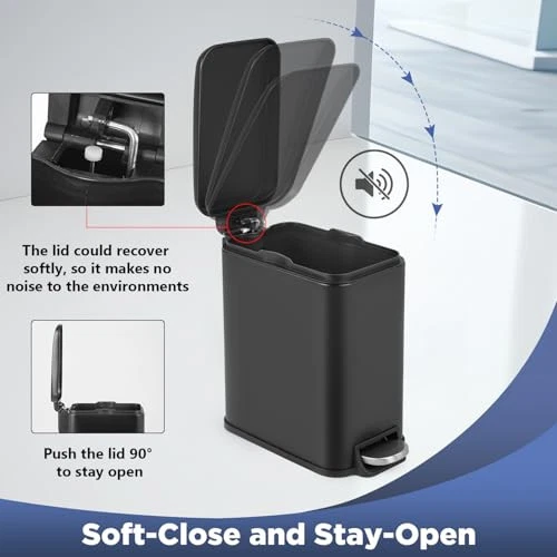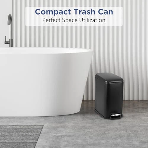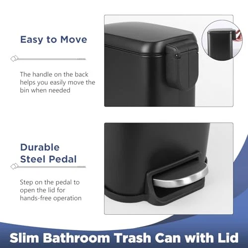 Return Policy Fast Delivery Trusted seller Bathroom Trash Can with a Lid 1.3 Gallon (5 L) Small Trash Bin Step Pedal Garbage Can with Removable Bucket Slim for Small Spaces for Bathroom,Bedroom,Kitchen,Office (2, Black) Product Description Soft Close and Keep Open: The lid can be easily restored, so it will not affect the environment. Push the lid to 90 ° to keep it open.This trash bin features a lid that closes quietly and gently without slamming shut. Additionally, you can keep the lid open for easy waste disposal when needed. High-class Materials: Anti water and rust stainless steel bucket and tightly sealed lid keep the interior dry, easy to clean, and odorless.The interior is a detachable plastic inner bucket.Featuring a stainless steel bin and a tightly sealed lid, this small trash can is resistant to rust and water. Removable Bucket & Handy Handle: The handle on the back can help you easily move the trash can when needed.The removable inner bucket makes switching bags a breeze simply lift the removable inner bucket out using the inner handles to easily clean or empty it. Durable Steel Pedals: Step on the pedal to open the lid for hands-free operation.The lid of the garbage can can be operated by the step pedal, allowing for quick waste disposal without having to touch the bin. After-sale Service: This trash can places great emphasis on customer satisfaction and provides high-quality after-sales service to address any issues, doubts, or technical problems that may arise after purchg the trash can. A dedicated support team is always ready to provide timely assistance to ensure a seamless ownership experience. Shipping Returns Payment Shipping Shipping is FREE to all addresses other than APO/PO boxes in the lower 48 states. All our stock ships from US-based warehouses. Shipped via USPS or UPS (depending on location and package weight) Unless stated otherwise, all orders will ship within 24-72 hours of your payment being processed. Check our feedback to see the great reviews of FAST shipping we offer. Returns Seller does not accept returns Payment We currently accept payment via eBay managed payments only. Once payment is cleared, we will dispatch your shipment within 1-3 business days. Please refer to the "Shipping" tab for more information regarding shipping speed to your destination.