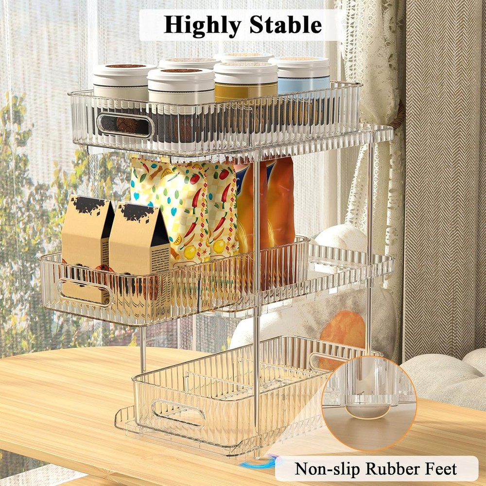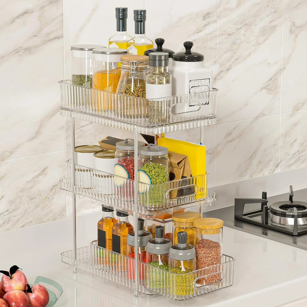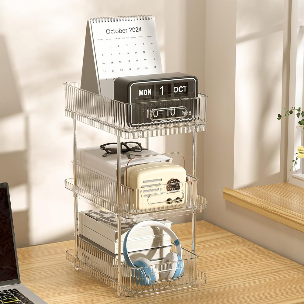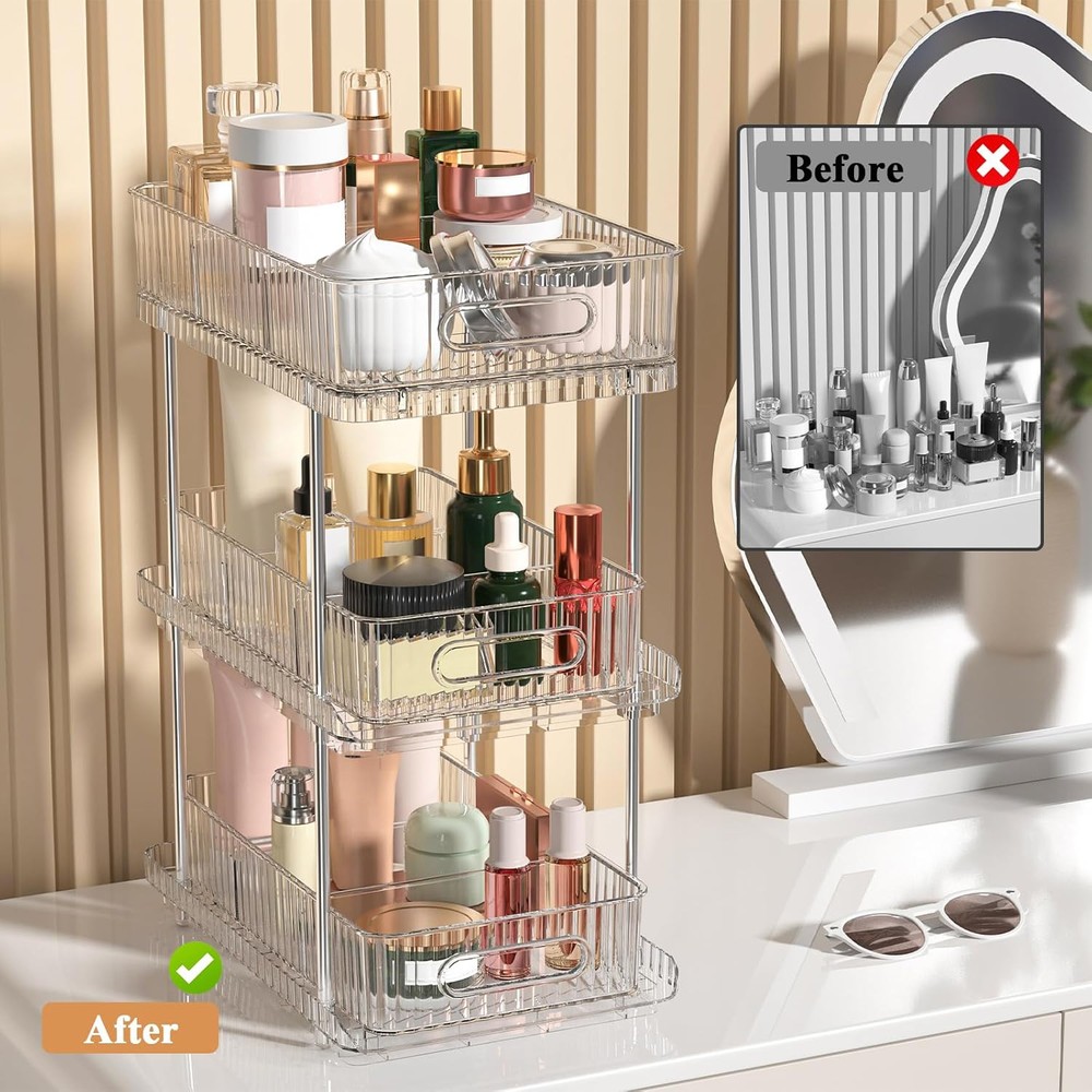Bathroom Vanity Countertop Organizer: 3-Tier 7.4" x 11.8" x 15.7", Clear Description Features: Efficient Storage Solution: This Bathroom Countertop Organizer offer a convenient and space-saving solution for organizing your bathroom essentials. You can customize the compartments to fit different items, maximizing every inch of storage space Versatile Functionality: This multi-purpose organizer holds everything from cleaning supplies to toiletries. Its clear design is easy to see, so you can quickly find what you need without having to rummage through cluttered cabinets Easy Access and Retrieval: The pull-out feature of this 3-tier organizer ensures easy access to stored items. No more bending or reaching deep into cabinets. Simply slide out the organizer and grab what you need effortlessly, saving you time and effort Sturdy Construction: The bathroom tray is thickened PET materials, is built to last. The sturdy construction can withstand daily use and heavy items, ensuring long-lasting. Say goodbye to flimsy organizers that break easily Maximize Space: Easy Access Slide-Out Design for Quick Reach to Everyday Essentials With this pull out cabinet organizer. Utilize the often underutilized area under your sink and transform it into a well-organized storage space Product Details: Room Type: Bathroom Number of Shelves: 1 Special Feature: Drawer Style: Vintage Finish Type: Polished Brand: Fowooyeen Product Care Instructions: Wipe with Damp Cloth Size: 7.4" x 11.8" x 15.7" Assembly Required: Yes Recommended Uses For Product: Storage Number of Items: 1 Manufacturer: Fowooyeen Item Weight: 3.43 Pounds Furniture Finish: Stainless Steel Tube Installation Type: Countertop Specific Uses For Product: Cosmetics Unit Count: 1.0 Count Product Name: Storage Organizer Item Weight: 3.43 pounds Product Dimensions: 7.44 x 11.83 x 15.68 inches Country of Origin: China Color: Clear Finish: Polished Pattern: Solid Item Package Quantity: 1 Special Features: Drawer Batteries Included?: No Batteries Required?: No Room Type: Bathroom Number of Shelves: 1 Special Feature: Drawer Style: Vintage Finish Type: Polished Brand: Fowooyeen Product Care Instructions: Wipe with Damp Cloth Size: 7.4" x 11.8" x 15.7" Assembly Required: Yes Recommended Uses For Product: Storage MaterialMounting Type: PolyethyleneTabletop Mount Shelf TypeShape: Pull-Out ShelfRectangular Handling We will ship all orders within 3 business day of payment. Delivery We take pride in offering fast and reliable delivery for your orders! We are committed to getting your products to you as quickly as possible. Generally, we would like to inform you that all orders will be delivered to you within 1-3 business days after processing.However, in some cases, delivery times may vary depending on the buyer's location. Especially in remote or rural areas, the expected delivery time may be extended. In such situations, we do our best to ensure that your order reaches you as quickly as possible.If there are any delays, we will be happy to contact you to explain the situation. Our goal is to enhance your satisfaction with our fast delivery times. We work diligently to ensure that your order arrives safely.Trust us and enjoy our speedy delivery! Return Policy All items qualify for returns within 30 days of receipt. Buyer is responsible for return shipping on any item that is not damaged. Feedback We take our reputation seriously, we buy and sell online, so we understand the value of trust. If you are unsatisfied with your order, please contact us and we will work with you to resolve it to your satisfaction.