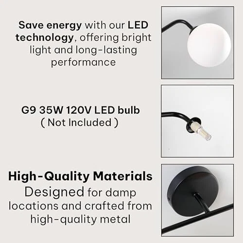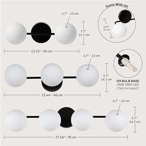Return Policy Fast Delivery Trusted seller Bathroom Vanity Light Fixtures: Modern 15.35" x 5.7" x 9.76", 2-Light Wall Sconce Globe G9 LED Bulb Lighting, Black - Wall Mounted Light Fixtures for Bathroom, Hallway, Rooms, and More Product Description MODERN LUXE DESIGN: Illuminate your space with our modern, elegantly designed 2-light wall sconce vanity lights, complete with a black finished lamp body and milky glass lampshades. Designed to enhance your bathroom vanity and other rooms, these lights add a touch of sophistication to your space. ENDURING QUALITY: These bathroom light fixtures are crafted with sturdy metal and high-quality glass, ensuring durability and reliability. Its milky glass shade not only adds to its strength but also renders the light waterproof and dustproof, making it suitable for wet areas like bathrooms, laundry rooms, and more. EASY SET-UP: All necessary installation mounting units are included. Just connect the wires and reattach the G9 LED-based bulbs and shade. Customize the fixture's orientation to your preference, perfect for vanity lighting fixtures. VERSATILE STYLE: Whether modern or rustic, our wall light fixtures offer the perfect sizes to complement any style of decor. It's an ideal choice for various spaces including bathrooms, dressing tables, mirror cabinets, vanity tables, art displays, dining rooms, kitchens, powder rooms, foyers, or hallways. AVAILABILITY: Our vanity wall light fixture offers an array of options. Choose from three elegant colors: Black, Gold, and Silver, and select from three sizes: 2-light, 3-light, or 4-light configurations. Tailor your lighting to suit your style and needs with ease. Shipping Returns Payment Shipping Shipping is FREE to all addresses other than APO/PO boxes in the lower 48 states. All our stock ships from US-based warehouses. Shipped via USPS or UPS (depending on location and package weight) Unless stated otherwise, all orders will ship within 24-72 hours of your payment being processed. Check our feedback to see the great reviews of FAST shipping we offer. Returns Seller does not accept returns Payment We currently accept payment via eBay managed payments only. Once payment is cleared, we will dispatch your shipment within 1-3 business days. Please refer to the "Shipping" tab for more information regarding shipping speed to your destination.