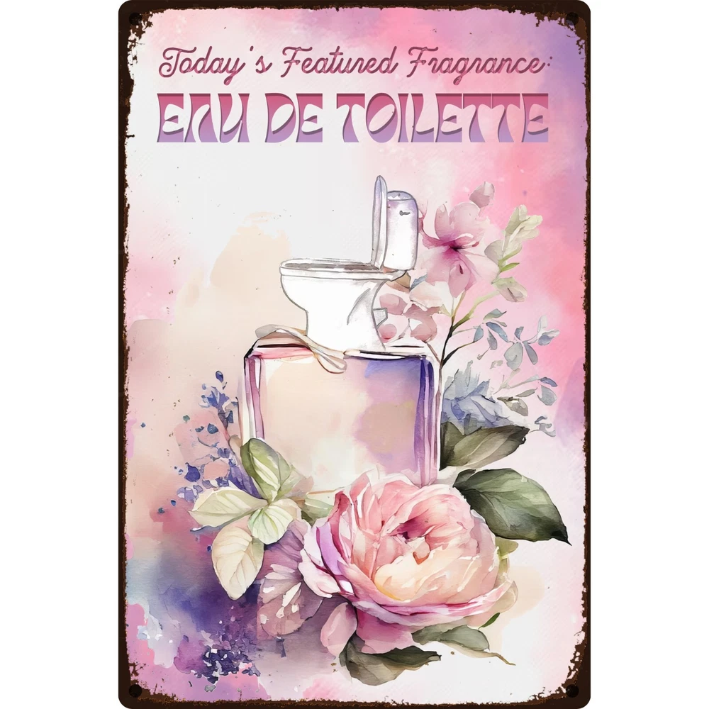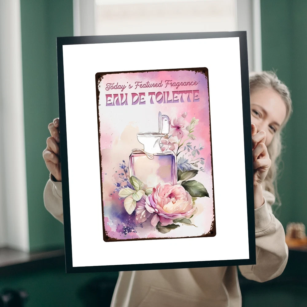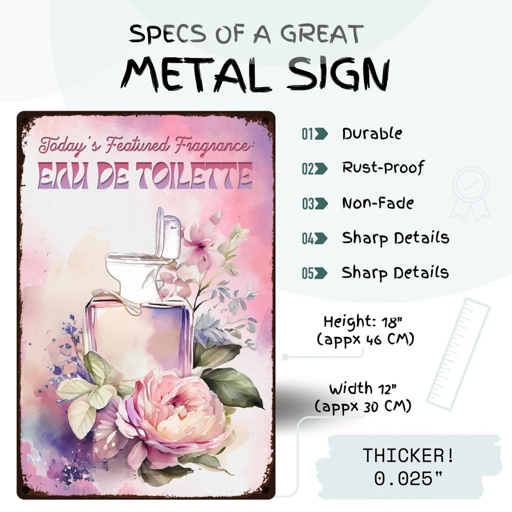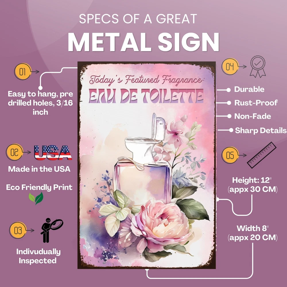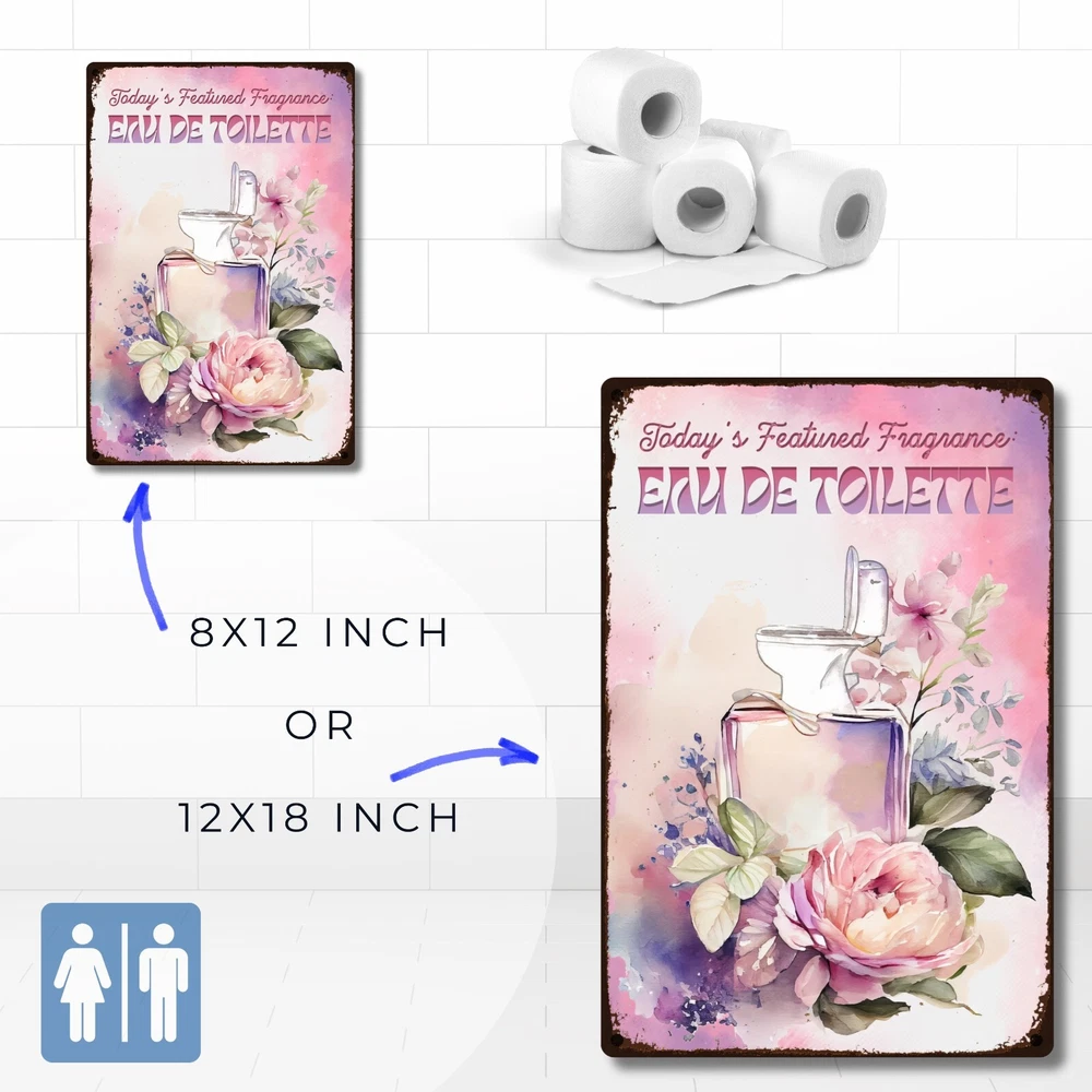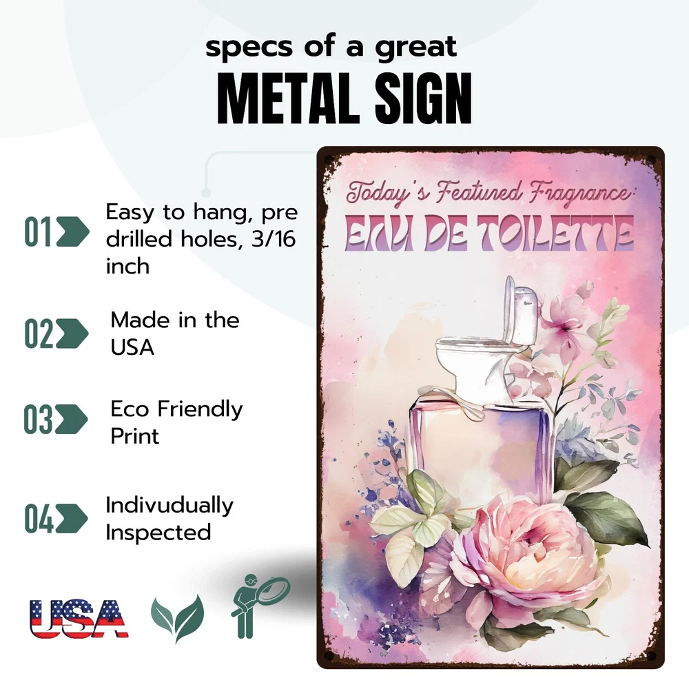 Funny, vintage metal tin sign for bathroom walls, flower sign wall art for bathroom decoration. The fragrance of the day: eau de toilette. Unique wall decor for bathroom: Enhance your space with MetalliSign's deluxe collection of witty and durable home decor, vintage metal signs and cool wall art masterfully crafted to bring both humor and elegance to your bathroom wall decor. Each sign, sized at a 8 x 12 or 12 x 18 inches, is not just a piece of bathroom decor but an expression of personality, meticulously printed in the USA on thick, high-grade aluminum plates, ensuring robustness that stands the test of time. Our "Funny Bathroom Sign - Eau De Toilette," the perfect antidote to those all-too-common vintage bathroom decor. Bored with the mundane "Are You Pooping" bathroom wall sign? This creatively designed metal wall poster adds a touch of inspiration and a healthy dose of humor to your lavatory or any outdoor space you deem fit. Crafted from durable, rustproof aluminum, this piece defies the elements, promising no fading or deterioration. The eco-friendly inks used are kind to the planet while delivering a clear, lasting image. We invite you to send us photos of these signs in their new homes, offering the opportunity for your decor decisions to inspire others. Features : Perfect Gift Size 18 x 12 inch or 12 x 8 inch, metal tin sign, Rectangular, Vertical Lightweight and versatile, fits bathroom, front door, bedroom, living room, porch Non-fade, high quality sublimation metal posters Pre-drilled 3/16 inch holes for screws or pins Rust-proof laminated aluminum plates, weather-proof and water resistant Individually inspected and made to order in the USA Seamless setup meets superior longevity—our rust free, weather-resistant, durable large signs, wall art and vintage metal signs are a breeze to hang with pre-drilled 3/16 inch holes for screws or pins (not included). Quality for ages - sublimation pressed aluminum metal tin signs, non-fade, anti glare finish, using eco-friendly ink; each unique metal poster is made in the USA and inspected individually. Dedicated customer service for any request, vintage decor design idea, funny sign aesthetics, cool metal wall art decor and general support. We like to talk to our customers in general, so don't hesitate to write.