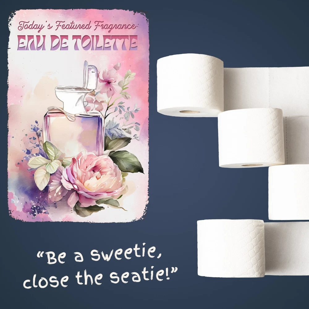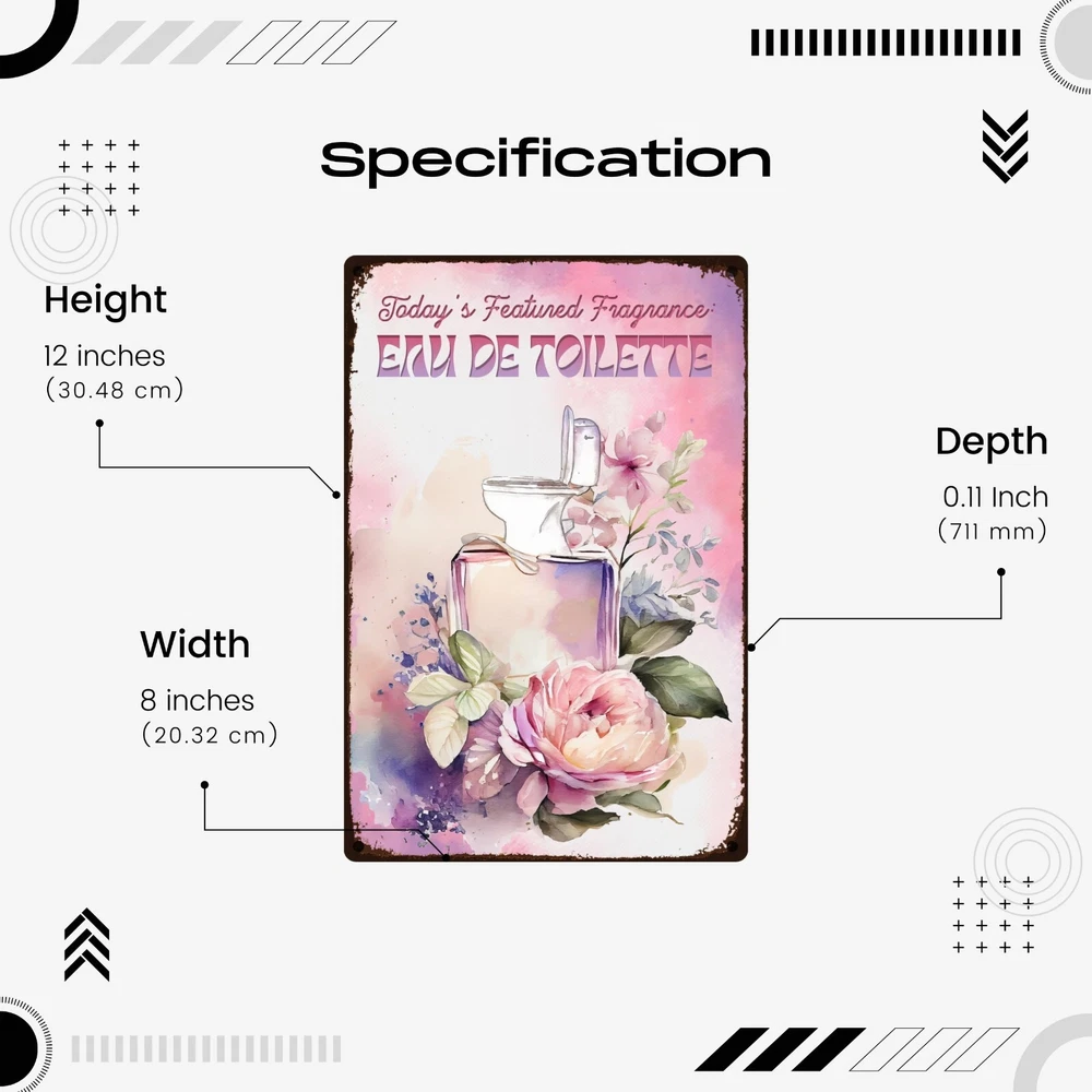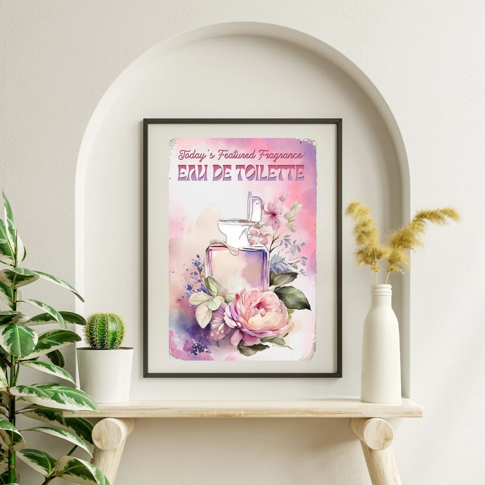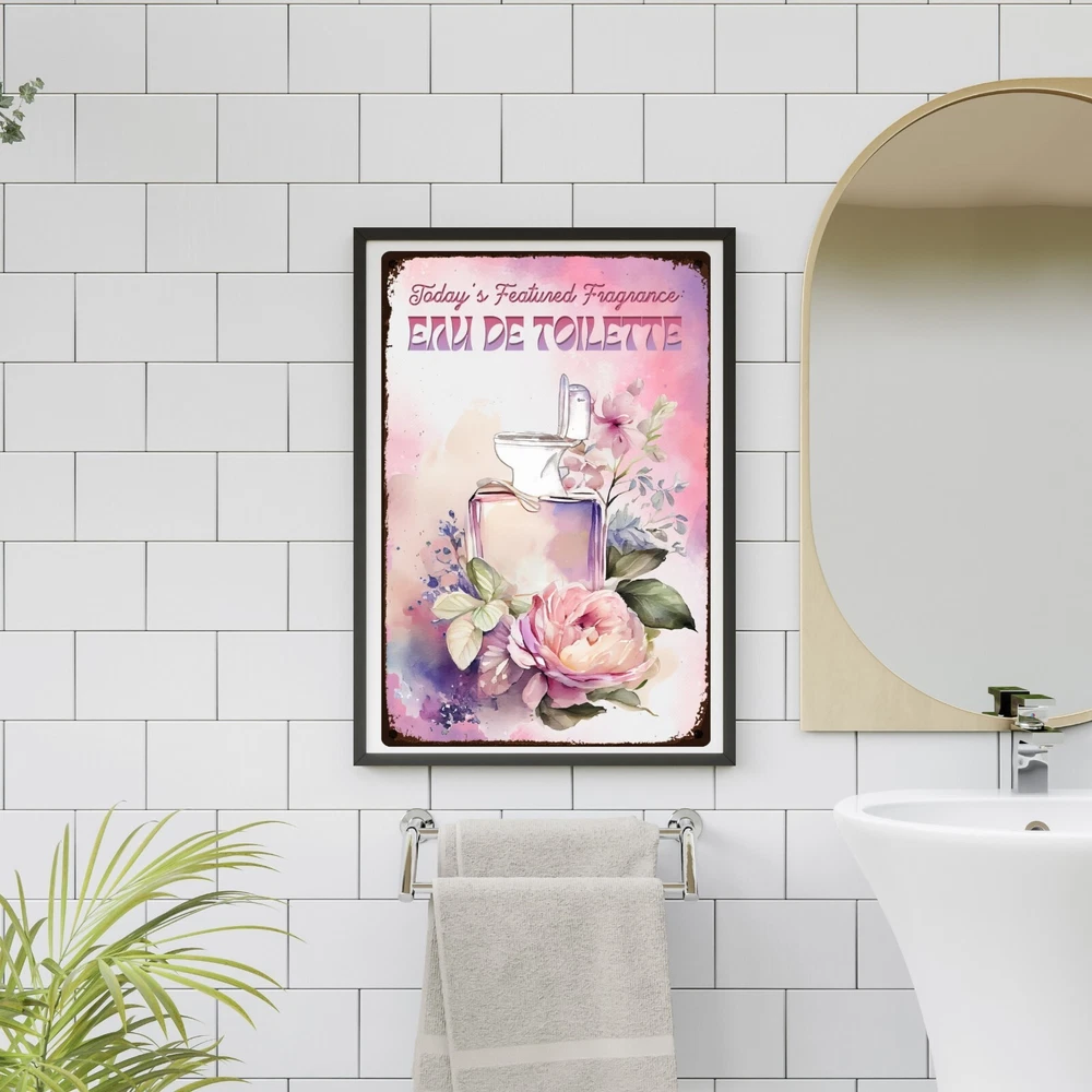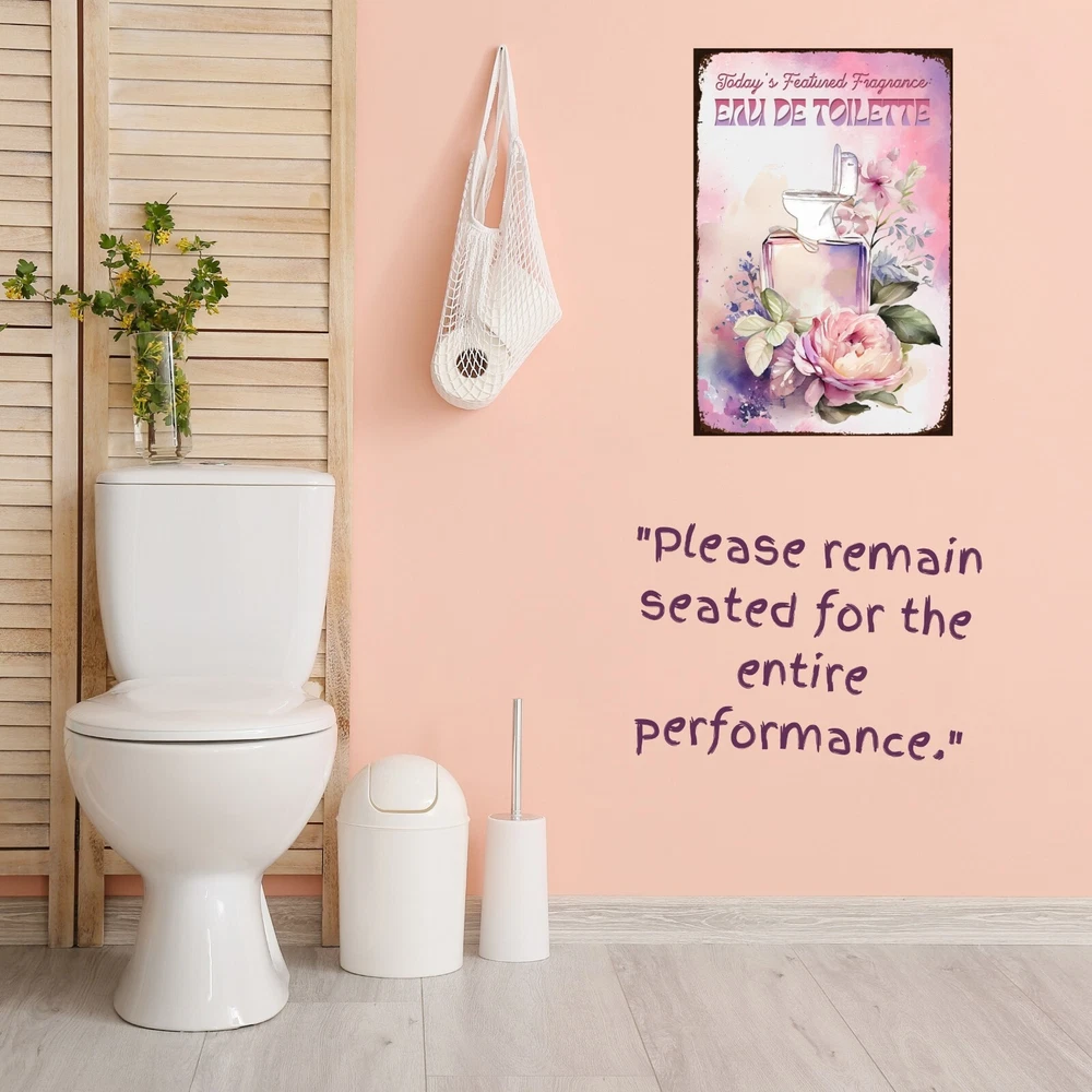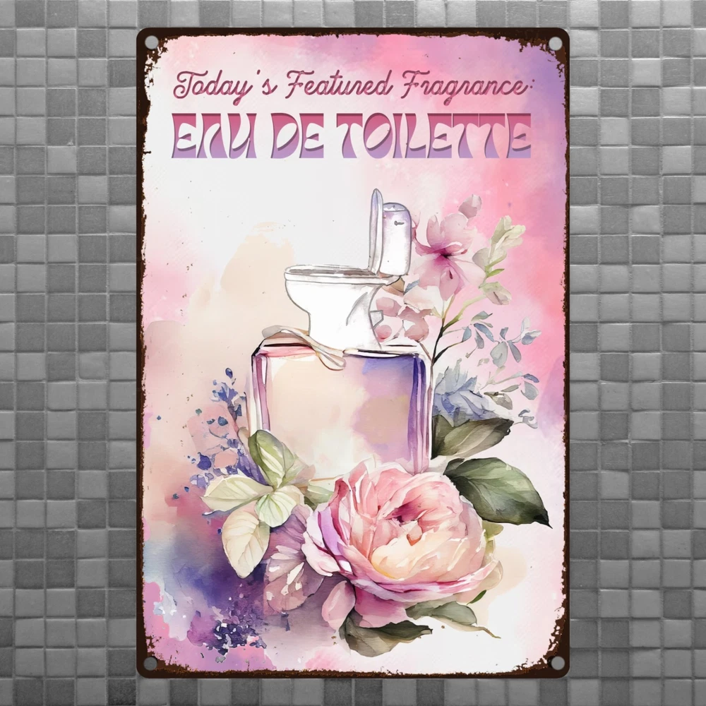 Funny, vintage metal tin sign for bathroom walls, flower sign wall art for bathroom decoration. The fragrance of the day: eau de toilette. Unique wall decor for bathroom: Enhance your space with MetalliSign's deluxe collection of witty and durable home decor, vintage metal signs and cool wall art masterfully crafted to bring both humor and elegance to your bathroom wall decor. Each sign, sized at a 8 x 12 or 12 x 18 inches, is not just a piece of bathroom decor but an expression of personality, meticulously printed in the USA on thick, high-grade aluminum plates, ensuring robustness that stands the test of time. Our "Funny Bathroom Sign - Eau De Toilette," the perfect antidote to those all-too-common vintage bathroom decor. Bored with the mundane "Are You Pooping" bathroom wall sign? This creatively designed metal wall poster adds a touch of inspiration and a healthy dose of humor to your lavatory or any outdoor space you deem fit. Crafted from durable, rustproof aluminum, this piece defies the elements, promising no fading or deterioration. The eco-friendly inks used are kind to the planet while delivering a clear, lasting image. We invite you to send us photos of these signs in their new homes, offering the opportunity for your decor decisions to inspire others. Features : Perfect Gift Size 18 x 12 inch or 12 x 8 inch, metal tin sign, Rectangular, Vertical Lightweight and versatile, fits bathroom, front door, bedroom, living room, porch Non-fade, high quality sublimation metal posters Pre-drilled 3/16 inch holes for screws or pins Rust-proof laminated aluminum plates, weather-proof and water resistant Individually inspected and made to order in the USA Seamless setup meets superior longevity—our rust free, weather-resistant, durable large signs, wall art and vintage metal signs are a breeze to hang with pre-drilled 3/16 inch holes for screws or pins (not included). Quality for ages - sublimation pressed aluminum metal tin signs, non-fade, anti glare finish, using eco-friendly ink; each unique metal poster is made in the USA and inspected individually. Dedicated customer service for any request, vintage decor design idea, funny sign aesthetics, cool metal wall art decor and general support. We like to talk to our customers in general, so don't hesitate to write.