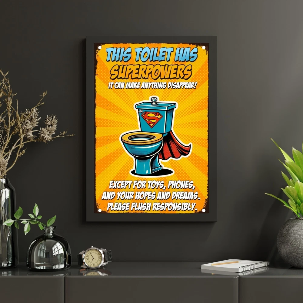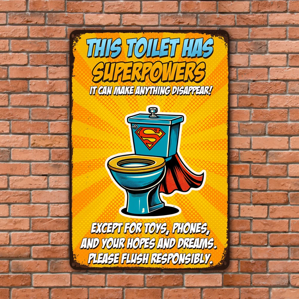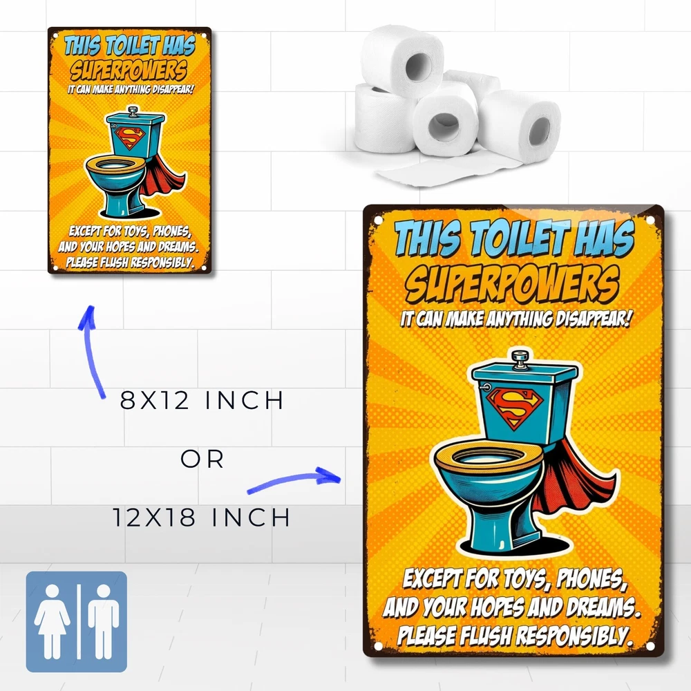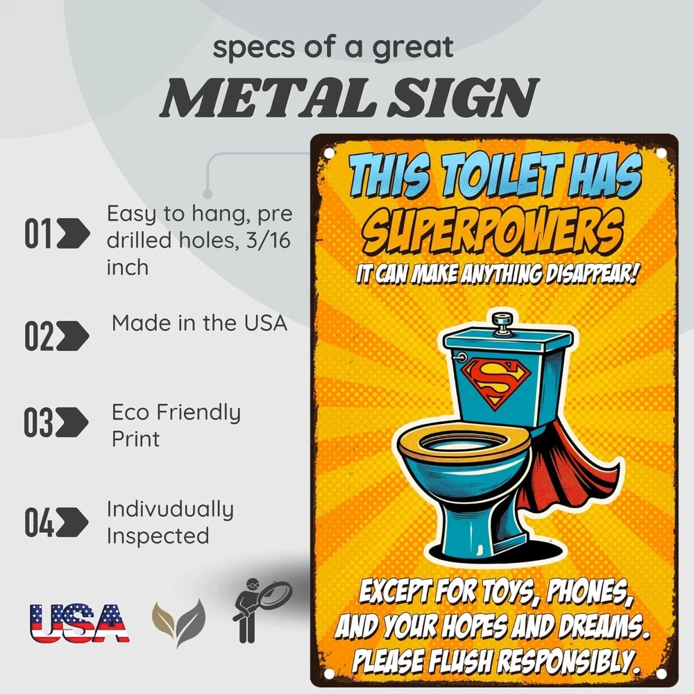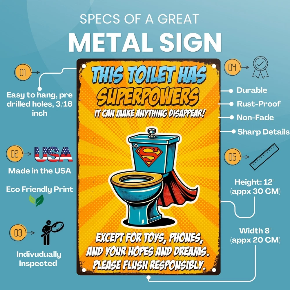 Funny, comics style metal tin sign for bathroom walls, toilet superpowers sign wall art for bathroom decoration. This Toilet Has Magical Powers (it makes everything... gone!) Enhance your toilet room or bathroom wall art with MetalliSign's deluxe collection of witty and durable home decor, vintage metal signs and cool wall art masterfully crafted to bring both humor and elegance to your bathroom wall decor. Each sign, sized at a 8 x 12 or 12 x 18 inches, is not just a piece of bathroom decor but an expression of personality, meticulously printed in the USA on thick, high-grade aluminum plates, ensuring robustness that stands the test of time. Our "Funny Bathroom Sign - This Toilet Has Superpowers," the perfect antidote to those all-too-common vintage bathroom decor. Bored with the mundane "Are You Pooping" bathroom wall sign. This toilet has superpowers and therefore it can make anything disappear, except for toys, phones, hopes and dreams, so flush responsibly! This creatively designed metal wall poster adds a touch of inspiration and a healthy dose of humor to your lavatory or any outdoor space you deem fit. Crafted from durable, rustproof aluminum, this piece defies the elements, promising no fading or deterioration. The eco-friendly inks used are kind to the planet while delivering a clear, lasting image. We invite you to send us photos of these signs in their new homes, offering the opportunity for your decor decisions to inspire others. Features : Perfect Gift Size 18 x 12 inch or 12 x 8 inch, metal tin sign, Rectangular, Vertical Lightweight and versatile, fits bathroom, front door, bedroom, living room, porch Non-fade, high quality sublimation metal posters Pre-drilled 3/16 inch holes for screws or pins Rust-proof laminated aluminum plates, weather-proof and water resistant Individually inspected and made to order in the USA Seamless setup meets superior longevity—our rust free, weather-resistant, durable large signs, wall art and vintage metal signs are a breeze to hang with pre-drilled 3/16 inch holes for screws or pins (not included) Quality for ages - sublimation pressed aluminum metal tin signs, non-fade, anti glare finish, using eco-friendly ink; each unique metal poster is made in the USA and inspected individually Dedicated customer service for any request, vintage decor design idea, funny sign aesthetics, cool metal wall art decor and general support. We like to talk to our customers in general, so don't hesitate to write