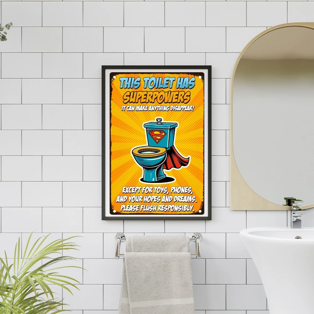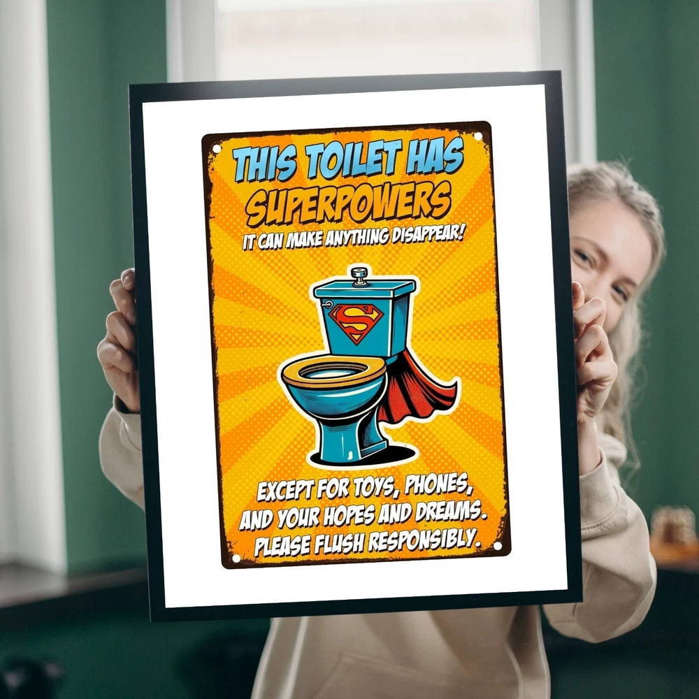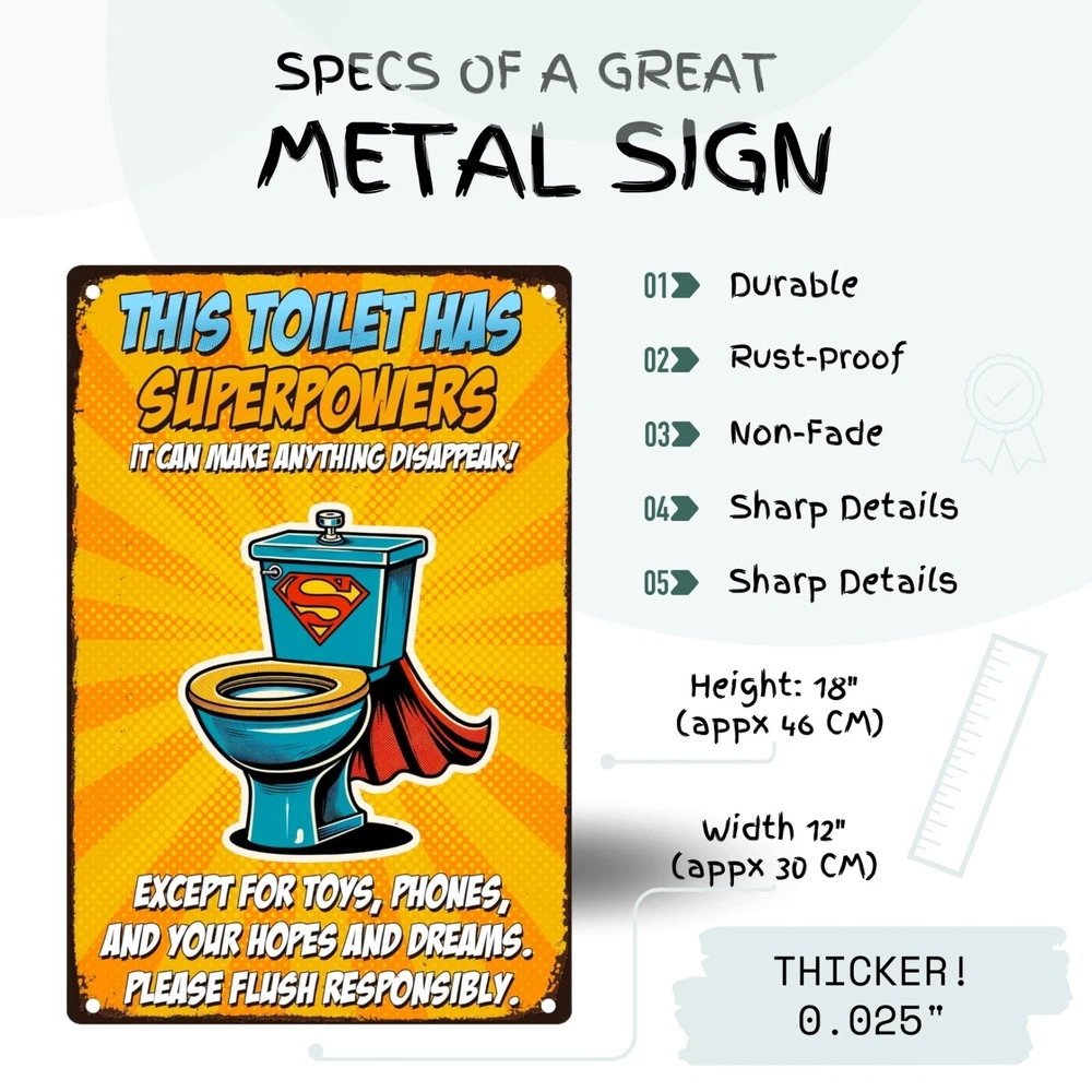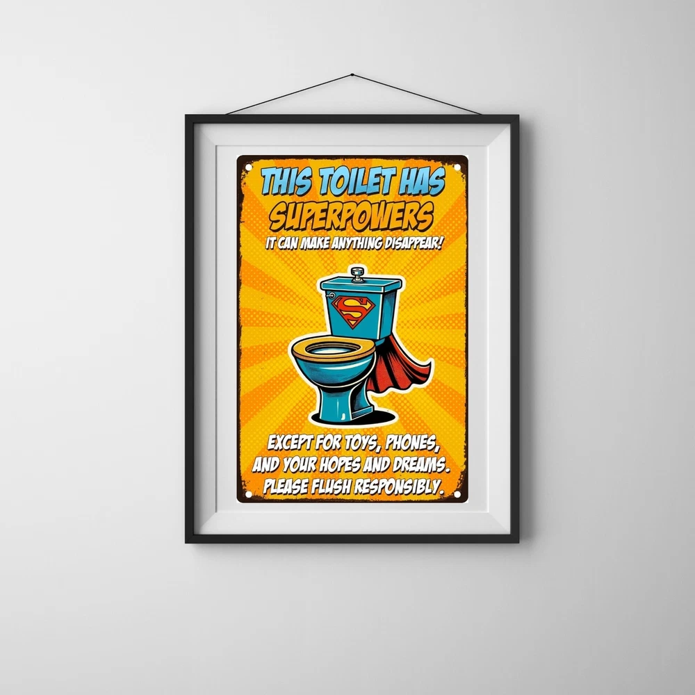 Funny, comics style metal tin sign for bathroom walls, toilet superpowers sign wall art for bathroom decoration. This Toilet Has Magical Powers (it makes everything... gone!) Enhance your toilet room or bathroom wall art with MetalliSign's deluxe collection of witty and durable home decor, vintage metal signs and cool wall art masterfully crafted to bring both humor and elegance to your bathroom wall decor. Each sign, sized at a 8 x 12 or 12 x 18 inches, is not just a piece of bathroom decor but an expression of personality, meticulously printed in the USA on thick, high-grade aluminum plates, ensuring robustness that stands the test of time. Our "Funny Bathroom Sign - This Toilet Has Superpowers," the perfect antidote to those all-too-common vintage bathroom decor. Bored with the mundane "Are You Pooping" bathroom wall sign. This toilet has superpowers and therefore it can make anything disappear, except for toys, phones, hopes and dreams, so flush responsibly! This creatively designed metal wall poster adds a touch of inspiration and a healthy dose of humor to your lavatory or any outdoor space you deem fit. Crafted from durable, rustproof aluminum, this piece defies the elements, promising no fading or deterioration. The eco-friendly inks used are kind to the planet while delivering a clear, lasting image. We invite you to send us photos of these signs in their new homes, offering the opportunity for your decor decisions to inspire others. Features : Perfect Gift Size 18 x 12 inch or 12 x 8 inch, metal tin sign, Rectangular, Vertical Lightweight and versatile, fits bathroom, front door, bedroom, living room, porch Non-fade, high quality sublimation metal posters Pre-drilled 3/16 inch holes for screws or pins Rust-proof laminated aluminum plates, weather-proof and water resistant Individually inspected and made to order in the USA Seamless setup meets superior longevity—our rust free, weather-resistant, durable large signs, wall art and vintage metal signs are a breeze to hang with pre-drilled 3/16 inch holes for screws or pins (not included) Quality for ages - sublimation pressed aluminum metal tin signs, non-fade, anti glare finish, using eco-friendly ink; each unique metal poster is made in the USA and inspected individually Dedicated customer service for any request, vintage decor design idea, funny sign aesthetics, cool metal wall art decor and general support. We like to talk to our customers in general, so don't hesitate to write