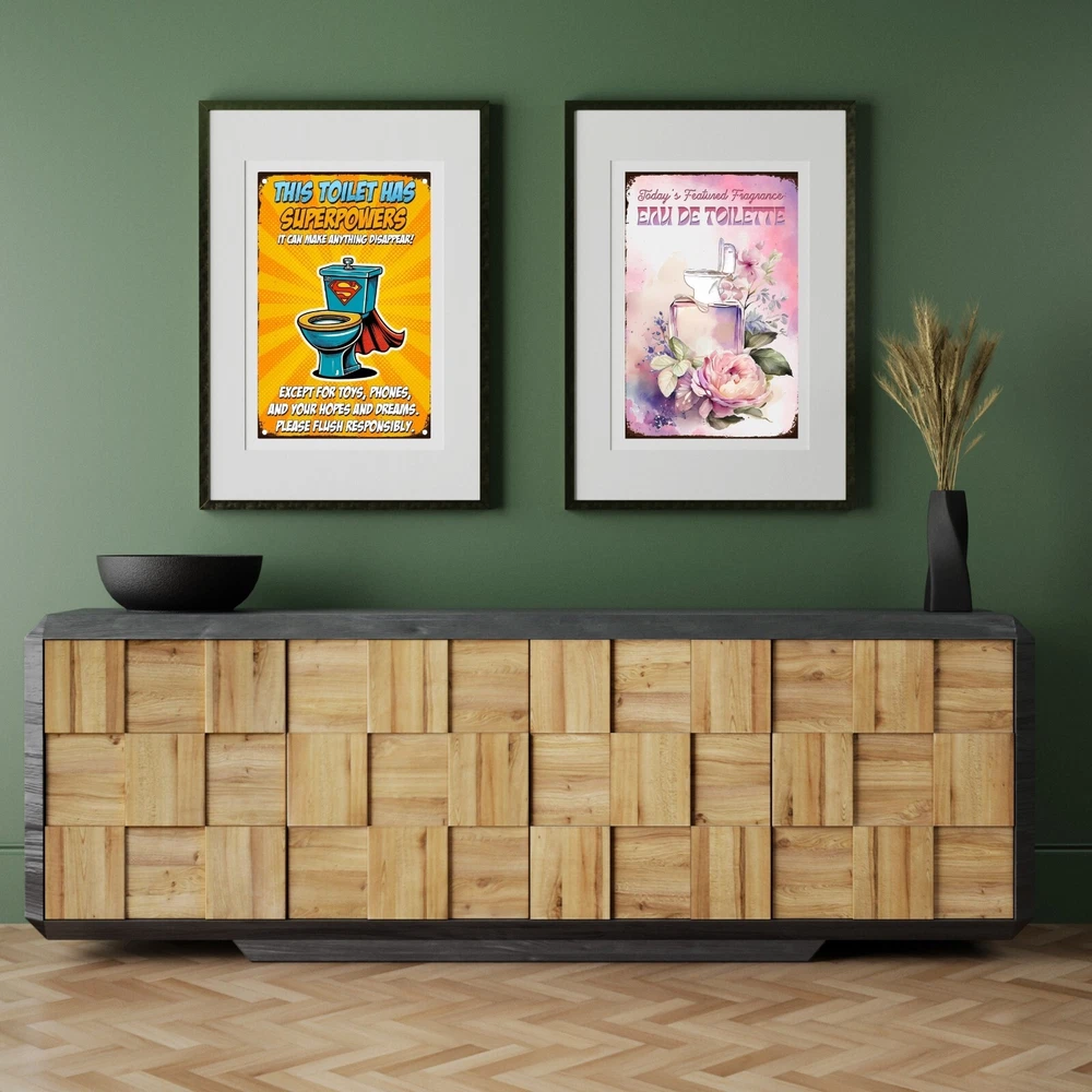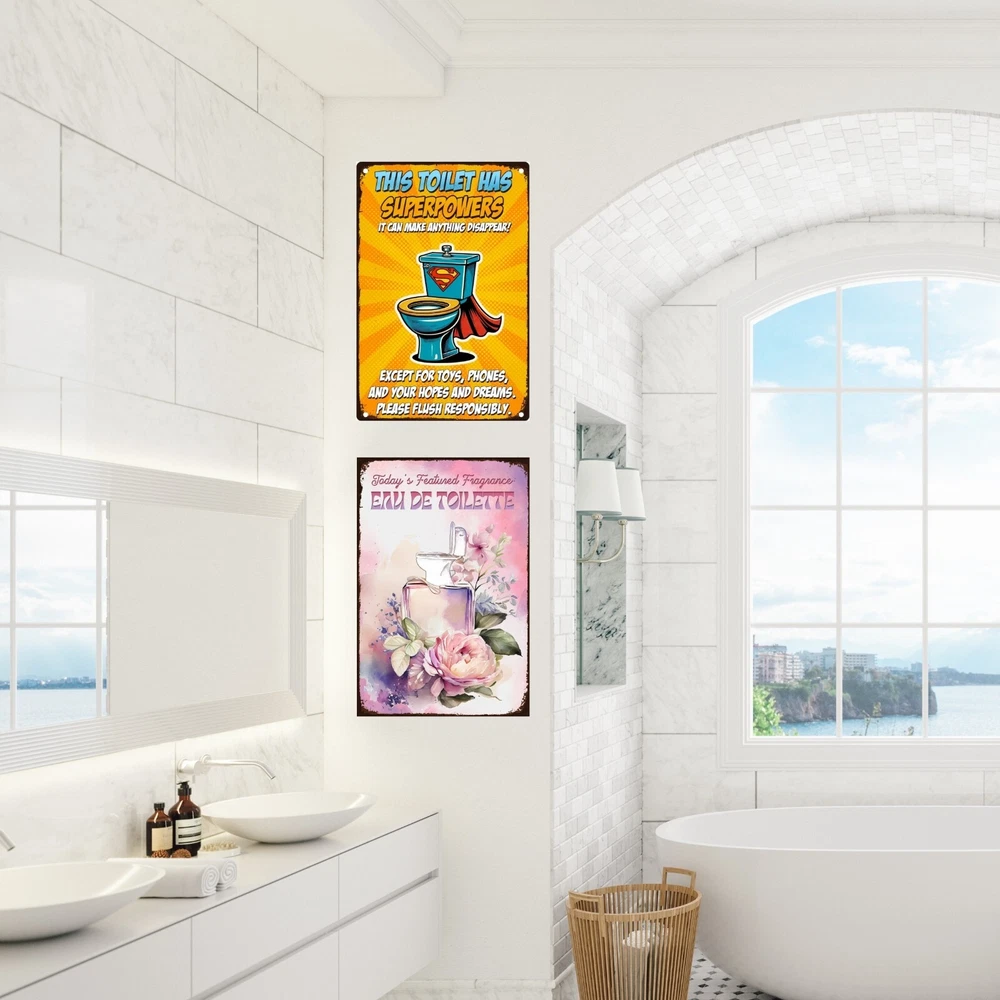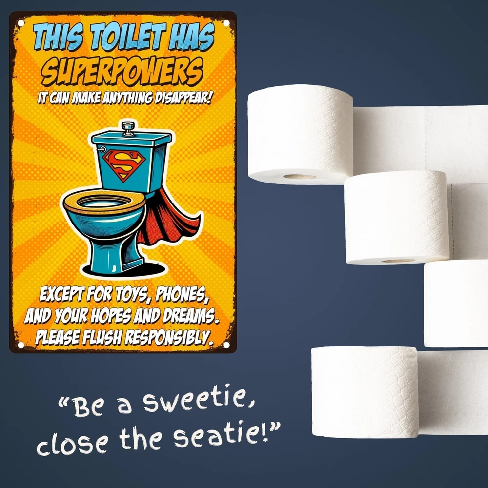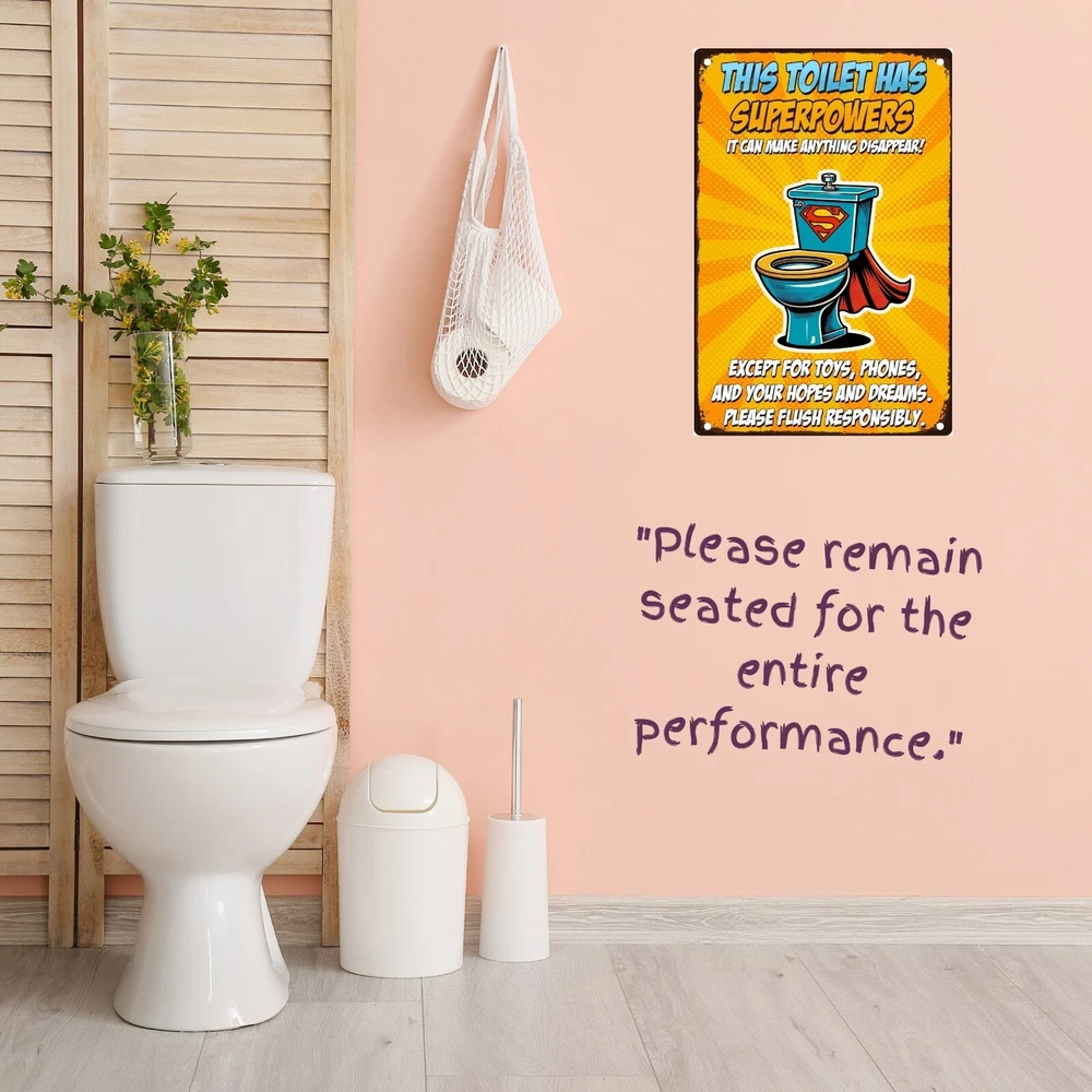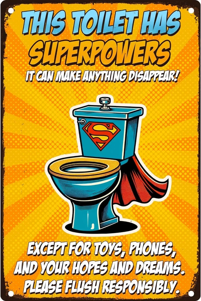 Funny, comics style metal tin sign for bathroom walls, toilet superpowers sign wall art for bathroom decoration. This Toilet Has Magical Powers (it makes everything... gone!) Enhance your toilet room or bathroom wall art with MetalliSign's deluxe collection of witty and durable home decor, vintage metal signs and cool wall art masterfully crafted to bring both humor and elegance to your bathroom wall decor. Each sign, sized at a 8 x 12 or 12 x 18 inches, is not just a piece of bathroom decor but an expression of personality, meticulously printed in the USA on thick, high-grade aluminum plates, ensuring robustness that stands the test of time. Our "Funny Bathroom Sign - This Toilet Has Superpowers," the perfect antidote to those all-too-common vintage bathroom decor. Bored with the mundane "Are You Pooping" bathroom wall sign. This toilet has superpowers and therefore it can make anything disappear, except for toys, phones, hopes and dreams, so flush responsibly! This creatively designed metal wall poster adds a touch of inspiration and a healthy dose of humor to your lavatory or any outdoor space you deem fit. Crafted from durable, rustproof aluminum, this piece defies the elements, promising no fading or deterioration. The eco-friendly inks used are kind to the planet while delivering a clear, lasting image. We invite you to send us photos of these signs in their new homes, offering the opportunity for your decor decisions to inspire others. Features : Perfect Gift Size 18 x 12 inch or 12 x 8 inch, metal tin sign, Rectangular, Vertical Lightweight and versatile, fits bathroom, front door, bedroom, living room, porch Non-fade, high quality sublimation metal posters Pre-drilled 3/16 inch holes for screws or pins Rust-proof laminated aluminum plates, weather-proof and water resistant Individually inspected and made to order in the USA Seamless setup meets superior longevity—our rust free, weather-resistant, durable large signs, wall art and vintage metal signs are a breeze to hang with pre-drilled 3/16 inch holes for screws or pins (not included) Quality for ages - sublimation pressed aluminum metal tin signs, non-fade, anti glare finish, using eco-friendly ink; each unique metal poster is made in the USA and inspected individually Dedicated customer service for any request, vintage decor design idea, funny sign aesthetics, cool metal wall art decor and general support. We like to talk to our customers in general, so don't hesitate to write