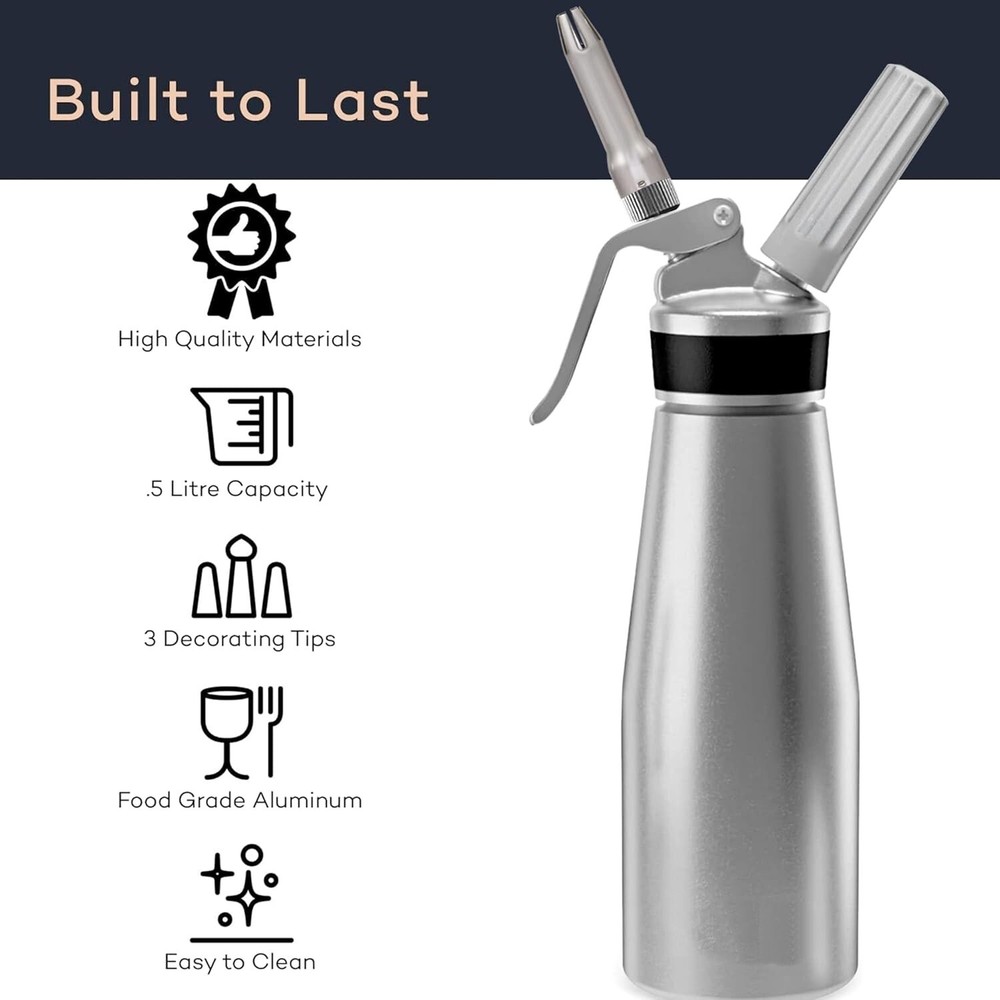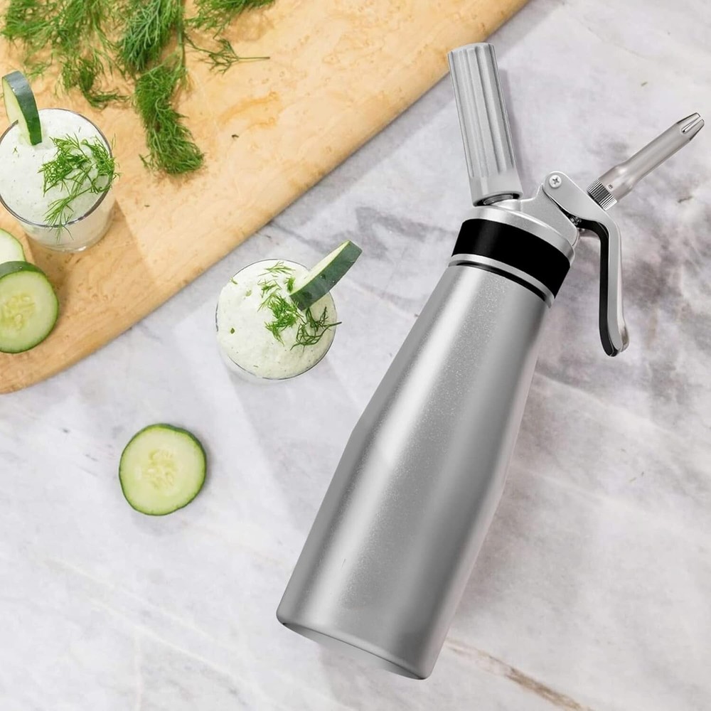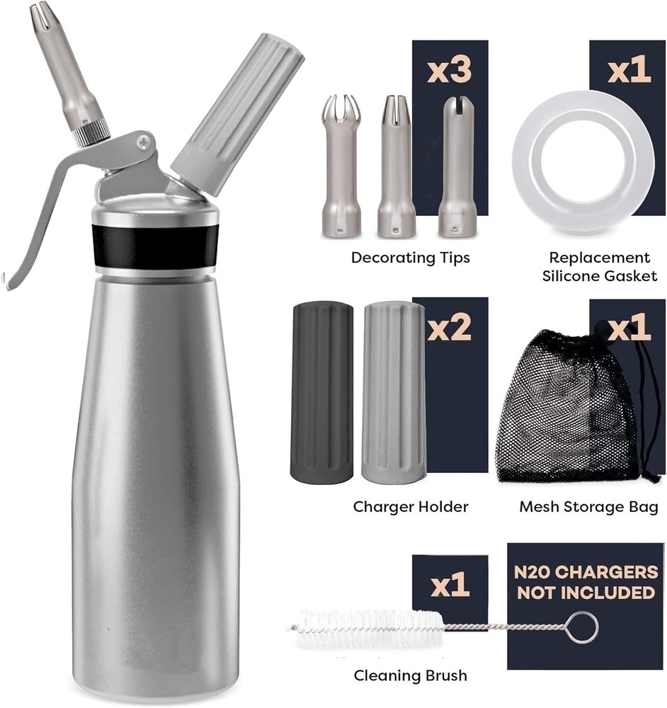 Batido de calidad profesional: Crea delicias artesanales personalizadas de forma saludable con la Batidora de Crema. Saca el chef que llevas dentro: Prepara sundaes de helado, ricos mousses de chocolate, crema batida de coco, lattes espumosos, refrescos y café frío con nitrógeno con este batidor de crema. Prepara fácilmente una deliciosa crema batida sin azúcar, sin carbohidratos y con calidad keto. Incluso puedes preparar huevos revueltos esponjosos y mantequilla casera. Recipiente de aluminio para crema batida resistente y duradero: Experimenta la sensación de resistencia con este recipiente y cabezal dispensador de aluminio. El fácil agarre con roscas reforzadas hace que nuestro dispensador de crema batida sea duradero para uso diario y comercial. El acabado premium negro satinado mantiene tu batidora de crema como nueva durante años. Usa las 3 boquillas de decoración para darle a tus tartas, pasteles, waffles y bebidas de crema batida una presentación profesional e inolvidable. Dispensador multiusos: Usa nuestros consejos y recetas para crear postres artesanales, crema keto, café frío con nitrógeno, coberturas saludables para crema batida y mantequilla sin conservantes, en solo minutos. Para la mantequilla, agita el dispensador de 25 a 30 veces, libera el N₂O, abre el dispensador y retira con una espátula. Compatible con todas las marcas de cargadores de crema de N₂O de 8 gramos (los cargadores de óxido nitroso no están incluidos). Fácil de limpiar y mantener: Después de usar, simplemente enjuaga el recipiente de fácil agarre y usa nuestro cepillo para las boquillas de decoración y el cabezal del dispensador. Guarda todos tus accesorios: Incluye 1 bote dispensador de batidor, 3 boquillas de plástico para decorar, 2 soportes de plástico para cargadores, una junta de silicona de repuesto, un cepillo de limpieza y una bolsa de malla para guardar. Los cargadores de crema de N₂O no están incluidos.
