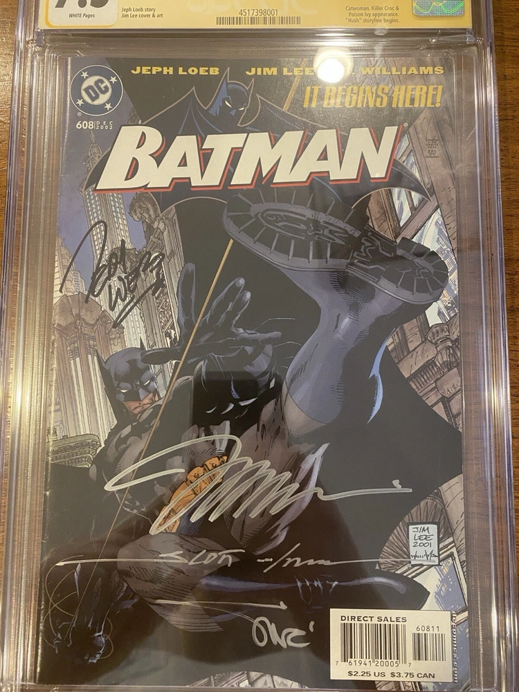 Batman 608 1st Printing Signed By Jim Lee Jeph Loeb Scott Williams Alex Sinclair 7.5 CGC Signature Series This is the first printing of the first issue of Jim Lee’s debut at DC Comics signed by the whole creative team on the project. All signatures were acquired at New York Comic Con 2024