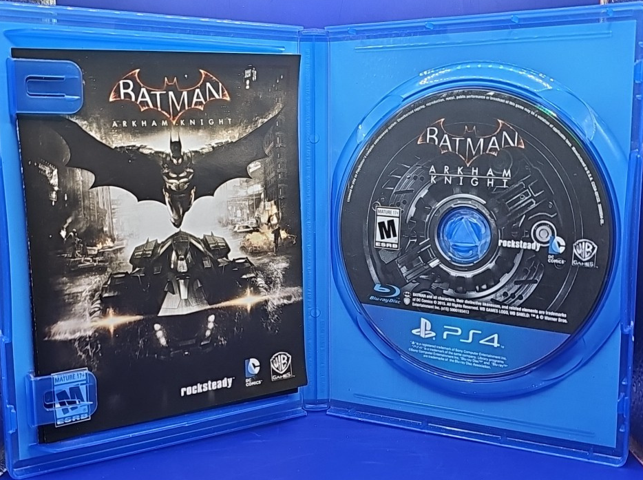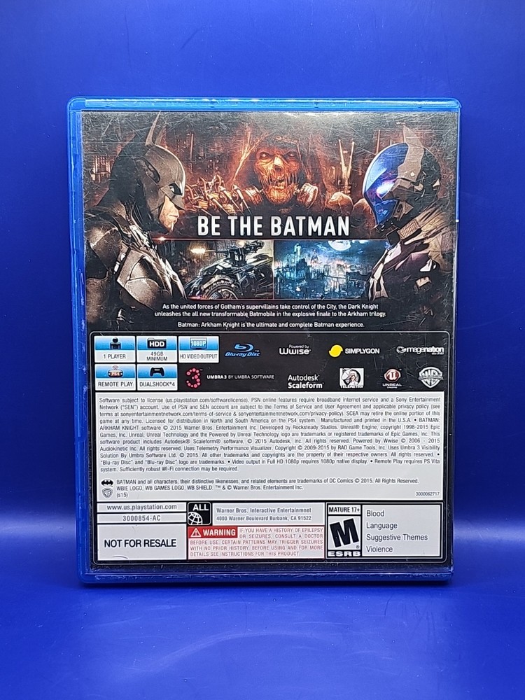 The product is a Sony PlayStation 4 game disc for "Batman: Arkham Knight" released in 2015 by Warner Bros. Games. This action-adventure game is rated M for Mature and includes bonus Scarecrow Nightmare missions. The game is designed for the NTSC-U/C (US/Canada) region and offers an immersive gaming experience on the PlayStation 4 platform. Perfect for fans of the Batman series, this game allows players to take on the role of the Dark Knight to combat villains in Gotham City.