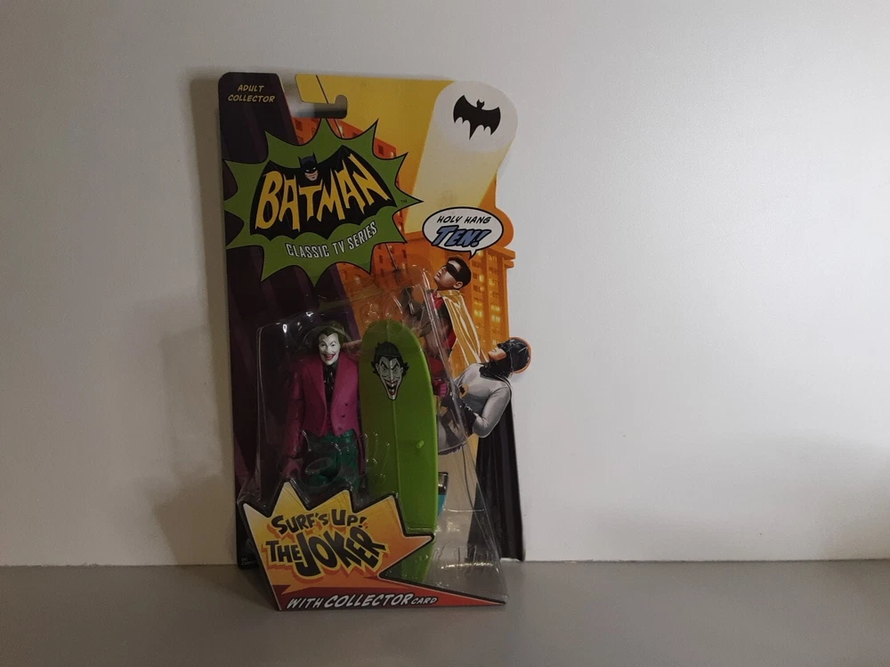 This Mattel Batman Classic TV Series Joker (Surf's Up) action figure is a must-have for any collector or fan of the iconic TV show. The figure is made to the likeness of the 1966 TV series actor Cesar Romero and comes in its original, unopened packaging as pictured. The collector's edition includes a trading card, surf board, display base, and figure. Get your hands on this unique piece of Batman memorabilia today! Ships from Dallas, Texas.