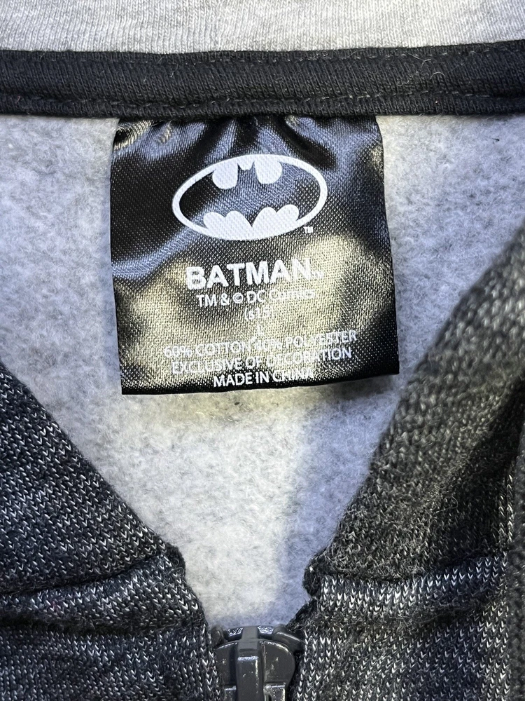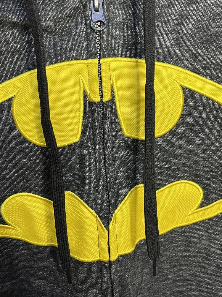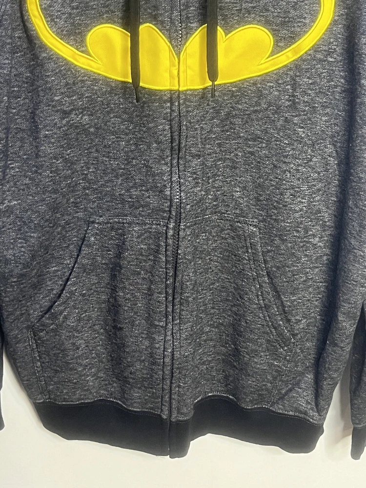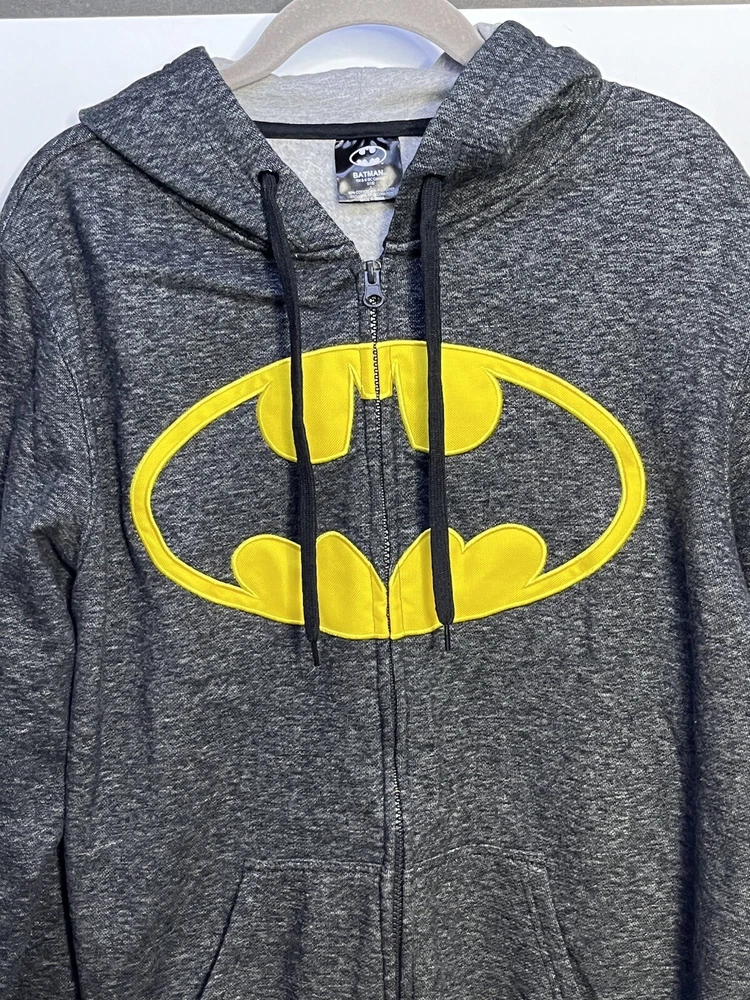 Batman hoodie jacket Men’s L Gray patch yello embroidered kangaroo pockets logo Full Zip Hoodie Good pre owned condition, little to no signs of wear. Measurements are in the photos. I discount shipping for multi item purchases. Thank you for supporting my small business.
