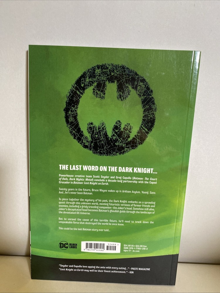 Dive into the gripping world of Gotham with Scott Snyder's "Batman: Last Knight on Earth." Published by DC Comics in 2021, this paperback or softback edition invites readers to experience a thrilling journey through the Modern Age of comics, featuring an impressive ensemble of characters from the DC universe. With a compelling storyline and the acclaimed artistry of Greg Capullo and Fco Plascencia, this book promises to be a captivating addition to any fan's collection. Explore the complexities of Batman's legacy as he faces off against iconic adversaries like the Joker and Lex Luthor in a story that spans the present and delves into the character's past. At 10.19 inches in length, 6.76 inches in width, and 0.36 inches in height, with a weight of just 0.84 ounces, this book is a comfortable fit for reading at home or on-the-go. Whether you're a longtime enthusiast or new to the realm of superheroes, this title is a must-have that promises to entertain and engage.
