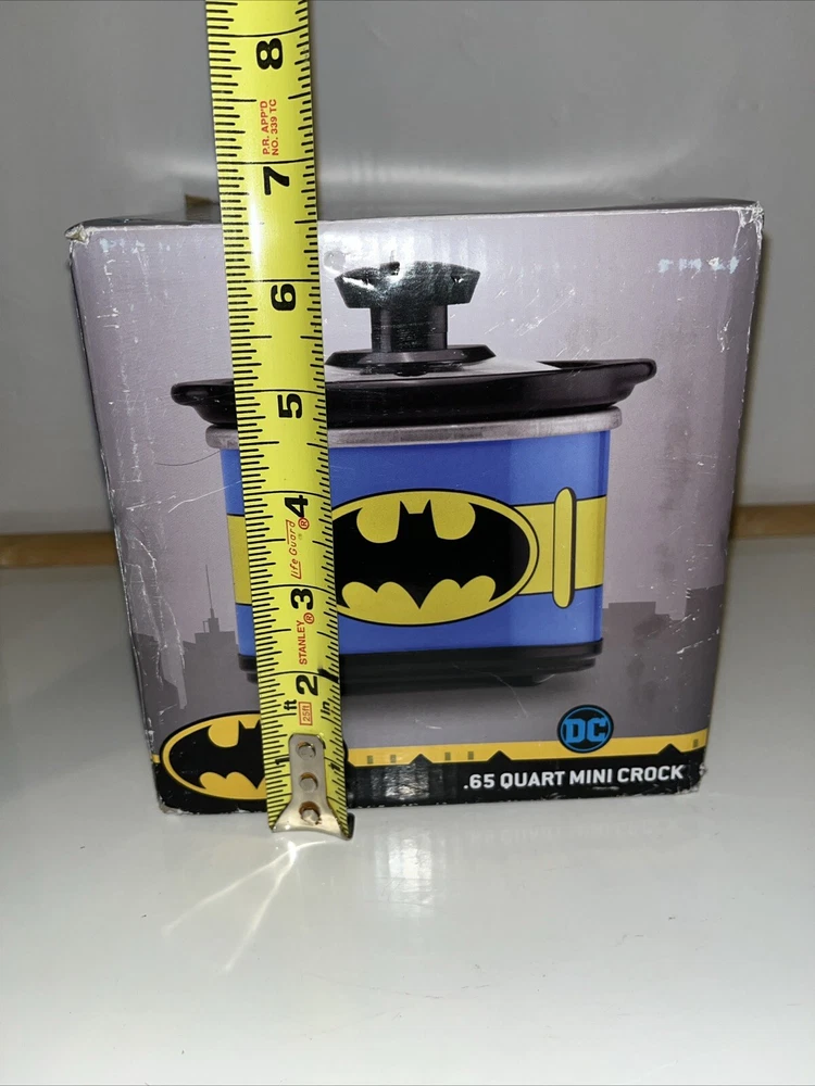 This Batman mini crock pot is so cool—perfect for small meals, dips, or keeping snacks warm! The .65-quart size is great for personal use, and the glass lid makes it easy to check your food. The stone crock heats evenly, and the DC Comics design is a fun touch for fans. The box has a slight crease, but the cooker itself is brand new and works perfectly. Super handy and stylish!