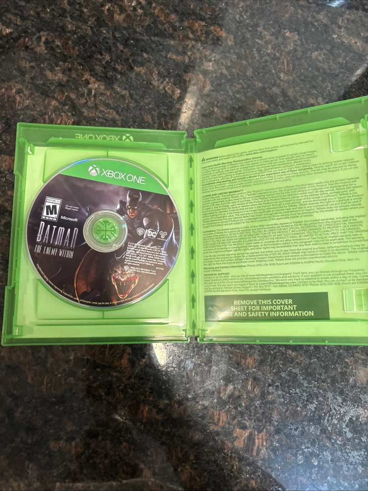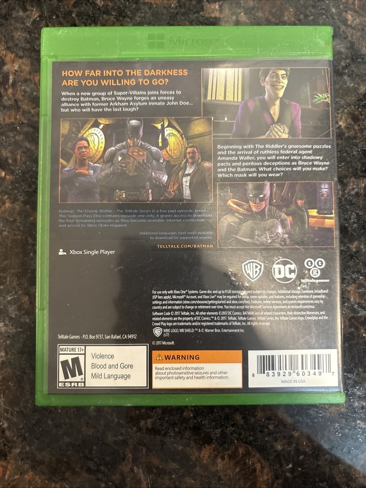 The product is Batman: The Enemy Within - The Telltale Series for the Microsoft Xbox One, released in 2017. This interactive, story-driven game is part of the popular Telltale Games series and is published by Warner Bros. Games. Set in a mature-rated crime and detective genre, players take on the role of Batman as they navigate through a series of challenging scenarios and make key decisions that impact the outcome of the game. With an engaging storyline and compelling characters, this game offers a unique and immersive gaming experience for fans of the Dark Knight. No booklet inside.