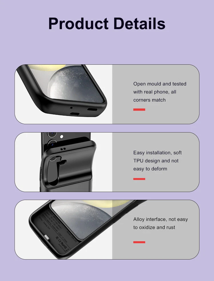 SAFE & SECURE SHOPPING 100% SATISFACTION GUARANTEED FAST SHIPPING Store Categories Store Categories Other You may also like 10W Wireless Car Charger Mount Phone Holder for iPhone 16 15 14 13 12 Pro Max 11 6.99 USD Free shipping 2x Wireless Magnetic Charger Dock For Samsung Galaxy Watch 5 Pro/6/5/4/3 Active2 5.99 USD Free shipping iPhone 16 - 16 Pro - Max External Battery Charger Case Power Bank Charging Cover 18.99 USD Free shipping For iPhone 16 15 14 13 12 X 20W Fast Charger Block USB Type C Wall Power Adapter 4.99 USD Free shipping 20W Magnetic Magsafe Fast Charging Charger Pad For iPhone 12 13 14 15 16 Pro Max 8.99 USD Free shipping Foldable MagSafe Magnetic Power Bank Battery Pack for iPhone 12 13 14 15 Pro Max 13.99 USD Free shipping USB Car Charger 2 Ports for iPhone & Samsung, Rapid Cigarette Lighter Adapter 4.49 USD Free shipping 100W 96W 2 Ports USB-C GaN PD Wall Charger Power Adapter for Macbook Pro / Air 15.99 USD Free shipping Battery Case for Samsung Galaxy S24 Ultra Extended Backup Battery Charging Cover Product Description About this item 【4500mAh Extra Power】: Elevate your Samsung Galaxy S24 experience with a rechargeable charger case featuring a robust 4500mAh Li-polymer battery pack. Bid farewell to low battery anxiety and awkward moments. (Press the power button for 3 seconds to initiate charging your Samsung Galaxy S24) 【Convenient, Easy to Use】: Simply slide your S24 into the battery charger case from the top, securing it onto the charging port. Perfect for quick power boosts in emergencies, during long shifts, commutes, travel, adventures, or when you want to avoid being tethered to an outlet. Stay covered in any situation. 【Full Protection & Bluetooth Supported】: Crafted with TPU and PC materials, this portable battery case for Samsung Galaxy S24 sits 0.05 inches higher than the phone screen, preventing scratches. Rest assured, this battery case does not impact your phone's Bluetooth function. 【Safe and Reliable】: Constructed from durable engineering materials, this battery case provides total protection against scratches, bumps, and drops. The integrated circuit design internally prevents short circuits or overtime charging. The external Samsung Galaxy S24 battery charging case is backed by a 12-month warranty, ensuring comprehensive support from our customer service team. 【LED Power Indicator】: Stay informed about your charging status with the four light indicators on the back of the Galaxy S24 Battery Charger Case. Easily monitor available charge levels: [0% - 25% - 50% - 75% - 100%]. The built-in switch allows convenient on/off control. Additionally, internal circuit protection ensures safety against overheating, overload, and short circuit issues. Specification: Suitable Model: for Samsung Galaxy S24/S24 Plus/S24 Ultra Battery Capacity: 4500mAh Battery Input: 5V/1.8A Battery Output: 5V/1.5A Package included: 1 x battery case cover About Us Payment Shipping Returns Contact Us About Us We pursuit 100% transactions satisfaction,We attach importance to every customer from around the world,Please buy with confident!if you have any issue,you can just give us a message,and we give you full resolve. We guarantee 100% customer satisfaction. We will offer professional product support:Product Inquiry,Aftersale Service,Shipping solution and so on.If you got question or problem,please just contact us by ebay message. Payment We can accept PayPal payment ONLY.Because we can't accept any other payment method.Hope understand. Shipping Item will be shipped within 1-3 business day after full payment is received. Delivery time depends on destination and other factors, if you still not received it in normal days. Please don’t worry, I hope you can give me a message before you do any action. Returns If the item is defect when you receive it or you are not satisfied with it, please return it within 30 days for a replacement or money back. But the items must be back in factory condition. Please contact us and double check the return address before you return it. Original and return shipping fee will not be refunded or reimbursed under all circumstances. You must agree and acknowledge this term if you bid for this item. Therefore, please do not complain about having to ship back at your own expense. Contact Us Work Time: Monday to Saturday If you have any questions, please feel free to email our service , and we will reply you ASAP. If no response within 24 Hours, please check the spam of mail box or kindly re-send it to us. Copyright © 2022 Tongtool