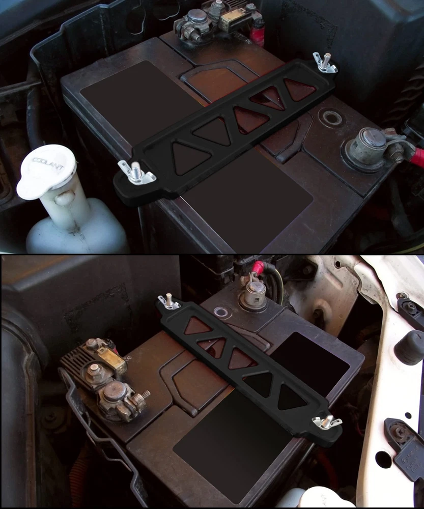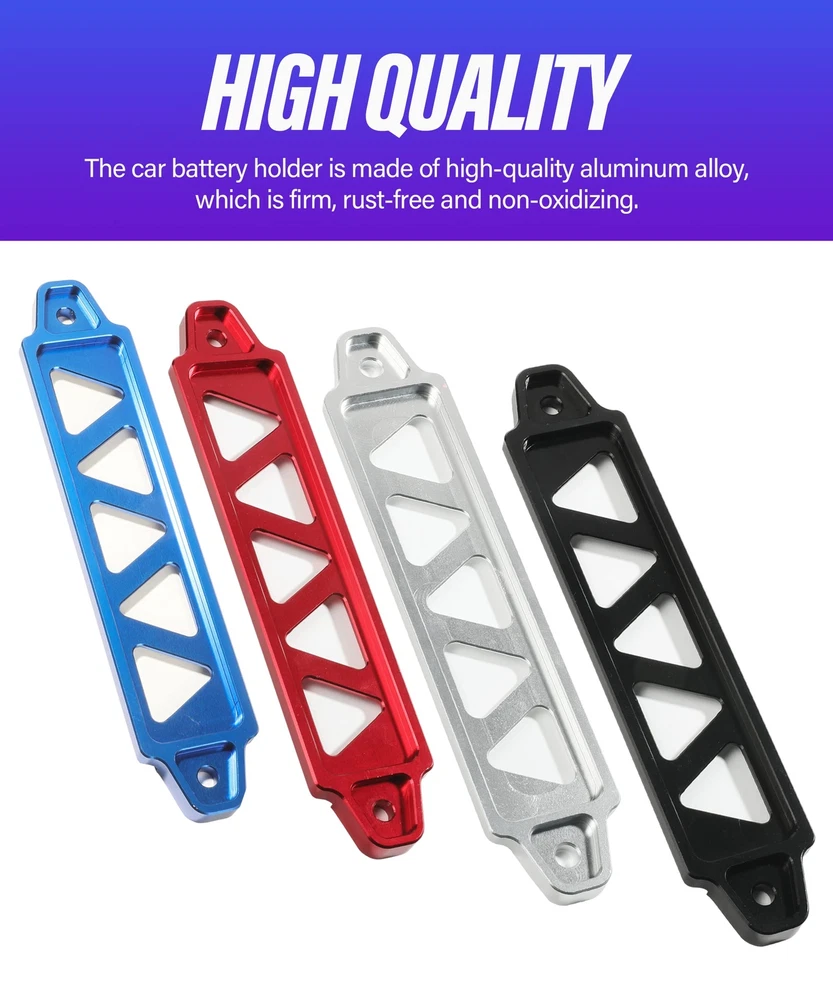 Battery Hold Down Bracket Holder [Package Includes] The package includes 1 battery mounting bracket, 2 10 inch J-shaped hooks, 2 sets of accessories (suitable for different installation types) -2 hexagonal and wing nuts, 2 rubber protective sleeves, 2 protective rubber washers, 2 spring lock washers, and 2 flat washers. [High Quality] The battery mounting bracket is made of high-quality aluminum alloy, which is sturdy, rust proof, and antioxidant. The side is designed with thickened aluminum alloy, which enhances the corrosion resistance and durability of the product. The surface of the bracket has undergone anodizing treatment, providing a long-lasting finish. [Size] The total length of this battery mounting bracket is 8.58 inches, and the distance between bolt centers is 7.48 inches. The bolt length is 250 millimeters and 10 inches. Please measure the diameter of the primary battery before purchasing to avoid purchasing products with incorrect dimensions. [Applicable] The battery fixing kit for automobiles is usually suitable for most groups 21, 21R, 22F, 22HF, 22R, 24, 24F, 24H, 24R, 24T, 25, 26, 26R, 26/70 27, 27F, 27H, 28, 29H, 30H, 31, 31A, 31T, 33, 34, 34R, 34/78, 35, 40R, 41, 42, 43, 46, 47, H6 (48), H8 (49), 85, 86, 90, 91, 92, 93, 94R, 95R, 96R, 97R, 98R, 99, 124, and 140R batteries. (Reminder: This type of fastening device is not suitable for some battery surfaces between raised ventilation caps) [Function] The battery fixing device aims to ensure that the battery is firmly fixed, with multiple colors available for selection, adding a beautiful and clean appearance to the engine compartment.