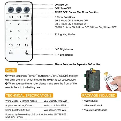 Menu 1. We require immediate payment. 2. We currently accept payment via eBay managed payments only. 3. Once payment is cleared, we will dispatch your shipment within 1-3 business days. Please refer to the "Shipping" tab for more information regarding shipping speed to your destination. Battery Operated Christmas Tree Lights with Remote Memory Timer Function, 33ft 100LED USB Christmas Lights 12 Lighting Modes for Christmas Outdoor Indoor Decor (Warm White to Multicolor) Product description 【Color Changing Christmas String Lights with MEMORY FUNCTION】Our upgraded Christmas lights color can fade between warm white and multicolor. You still can set warm white or multicolor separately (Both STEADY ON & FLASH Patterns) for variety of holidays or occasions. Our led Christmas lights with memory function will remember the last lighting patterns you set, no need to reset every time. 【REMOTE CONTROL & 12 MODES】Our 33FT 100 LED green wire string lights with remote control to modify 12 lighting patterns, set the timer and adjust brightness as well as turn on and off. Simply press the button on the battery box to select 12 lighting setting from COMB, Warm White Steady ON, Multicolor Steady ON, Color Cycle, Mixed Colors 1, Mixed Colors 2, Slo-Glo, Breathing, Warm White Slo-Glo, Multicolor Slo-Glo, Flash, In Wave. 【BATTERY POWERED & SUPPORT USB CHARGING】Our battery operated Christmas lights, 2 in 1 powered style, support USB or Battery powered (3xAA size, NOT INCLUDED). No wiring required, portable, easy to put or hang on wall, window, door, wrench, garland, tree, fence and anyw for decoration. 【DIMMABLE & 3 TIMER FUNCTIONS STRING LIGHTS】Our string lights with 4 levels brightness for various needs:100%, 75%, 50%, 25%. 3 Timer Functions: ①6H (6 Hours ON & 18 Hours OFF ) ;②8H(8 Hours ON & 16 Hours OFF);③ 6639H(6 Hours ON, 6 Hours OFF, 3 Hours ON, 9 Hours OFF). The timer allow you to keep the lights ON or OFF each day automatically to free your hands and avoid forgetting to turn off the lights. 【INDOOR OUTDOOR WATERPROOF CHRISTMAS LIGHTS】IP65 waterproof battery box and string lights, great for outdoor indoor decor, add charming glow to your garden, patio, lawn, porch, gate, yard, bedroom, home, kitchen decoration. PLEASE MESSAGE US IF YOU HAVE ANY OTHER QUESTIONS, AND MANY THANKS FOR READING ALL OF THIS. Copyright ©#. All Rights Reserved.