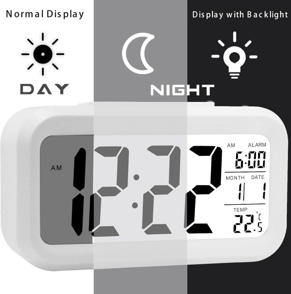 Digital Alarm Clock Battery Operated/Night Light/Indoor Temperature, Small Digit 【Larger Numbers】The digital alarm clock measures 5 1/4 (L) * 2 (W) * 3 (H) inches, small and light. The small clock face is utilized HD LCD screen, can be read easily 【Alarm Clock Battery Operated】This alarm clock is powered by 3 xAAA batteries only (not included), which can keep Constantly Big 4.5'' LED digit time display for more than 6 months. Battery operated (no cords) allows it to be used anywhere you need a clock 【Smart Nightlight 】The digital alarm clock features a night light ,this alarm clock can not only be used as a night light to help parents take care of their children better and makes the room cozy, but also make it easier to check the time in the dark 【Extra Loud Alarm Clock】 This alarm clock has a gradually faster beep noise which continues for 90 seconds. Before the alarm stops itself, top snooze button can be continually pressed to get an extra 8-minute nap.It doesn’t matter how much of a heavy sleeper you are 【Regular Features】Includes snooze time (5 minutes), 12/24 hour time format, calendar, and Indoor Temperature(°C or °F), easy for kids, teens to use, basic bedroom bedside table desk gift alarm clock 3.1 "h x 5.25 "h. Weight: 5.6 oz Item model number C-210-alarm clock Display Type Digital Product Dimensions 5.25"W x 3.1"H Special Feature Alarm, Temperature Display, Night Mode Number of Items 1 Power Source Battery Powered Color White-1 Mounting Type Tabletop Country of Origin China Style Small Digital Alarm Clock Item Weight 5.6 ounces Are Batteries Included No Operation Mode Atomic Frame Material Plastic Age Range (Description) Adult Shape Rectangular Clock Form Travel Alarm Clock Yes Indoor/Outdoor Usage Indoor
