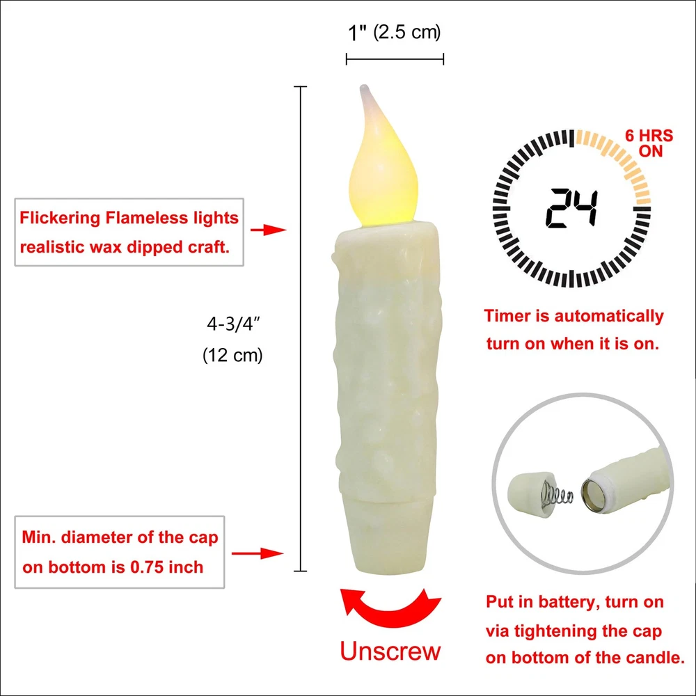 Flickering flameless lights bringing warm and pleasant to brighten sweet home. Decorative accents give you a cozy ambiance for any place you want, romantic and safe. Illuminate the fireplace mantel, countertop, bookshelf, tabletop, cabin, window with LED Flickering Flameless candles in candlestick. Great idea for home decorations, holiday decoration, Christmas, Thanksgiving, Halloween, New Year, Valentine's Day, dinner parties, wedding, birthday party, church, candle lights vigil, flower arrangement, other festival celebrate and more. Perfect gifts for family, friends, neighbors and acquaintances. CVHOMEDECO. have many years of hand dipped experience, welcome try and compare! Made of vintage-inspired wax hand dipped handicraft and classic textured finished. The drips down like a real candle and look amazing Measures of flameless candle is 4-3/4"L x 1"D, each battery operated candle uses 1 AA batteries ( Not included ), tighten or loose the cap on bottom of the battery operated candles for ON/OFF, timer setting the candle to stay on for 6 hours and then go off for 18 hours The base of flameless candles is tapered, perfectly fit any standard taper holder and taper accessories The farmhouse tapers candle use as a decorative accent piece for countertop, tables, shelves, walls, windows, candlesticks or any room. You're sure to find lots of uses for these charming handmade candles, whether you adorn a room, use as accents piece for any crafts projects or make them to your gifts. Primitives texture wax coating and flickering candlelight, offers a softly and warm light. Perfect for home decor, holiday décor, Christmas decor, Thanksgiving present, Halloween decor, New Year, Valentine's Day, dinner parties, weddings decor, birthday party, churches, candle light vigils, floral arrangements, other festival celebrate and more