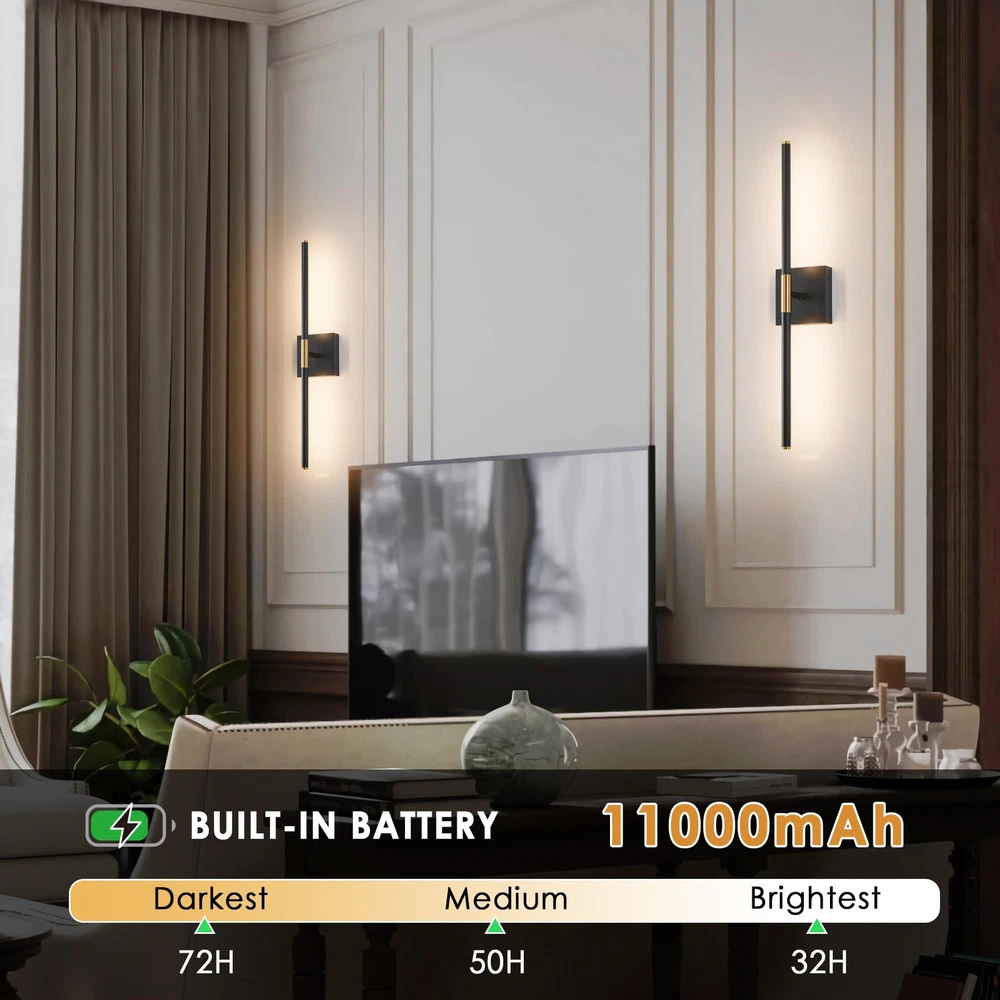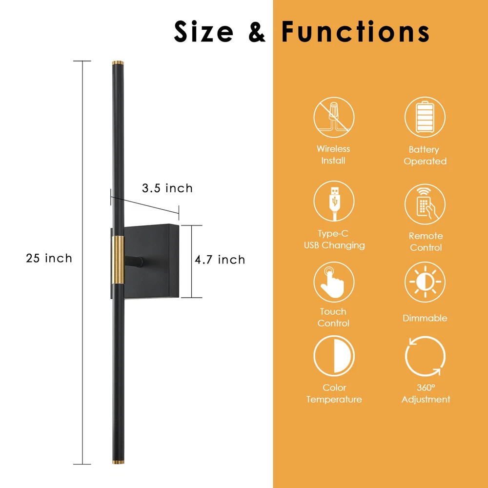 Wireless Battery Operated LED Brushed Gold Wall Lights Set of two 【Rechargeable Wall Sconce】With the 11000mAh battery, the lighting time can last for 24-60 hours on a full charge, The battery is rechargeable with USB charging cable(Suitable for Type-C port, charging plug excluded) 【Cordless Wall Lights】2 Pack black&gold wireless sconces, dimension: L25"*W4.3"*EXT3.5", Require no wiring and no electrician, It can be mounted on any wall you want to illuminate easily. 【Remote control & Touch Control】Battery-operated black&brushed brass sconces with a multi-function remote control, providing a variety of modes of choices to meet your different needs for lighting requirements. You can also manually touch the switch button to control the light. 【Kinds of Color Temperature with Stepless Dimming】Dimmable Wall Sconces, provide 3000K-6000K color temperature selection, which can meet your needs for different places. Stepless dimming, from sports mode to sleep modes just per your like. 【Wide Applications】These removable cordless sconces can be assembled in any corner of the home to provide fascinating lighting or used as emergency lighting during power outages. Ideal for living room, bedroom, corridors, hallway, stairway, entryway, dining room, office, dressing table, TV wall, and other places. It’s also perfect for being a holiday gift to deliver a convenient and warm lighting experience for your friends. 【3 Years Guarantee】We provide 3-year guarantee period for all of our products. You can contact us through Amzon for any problems that arise during usage.