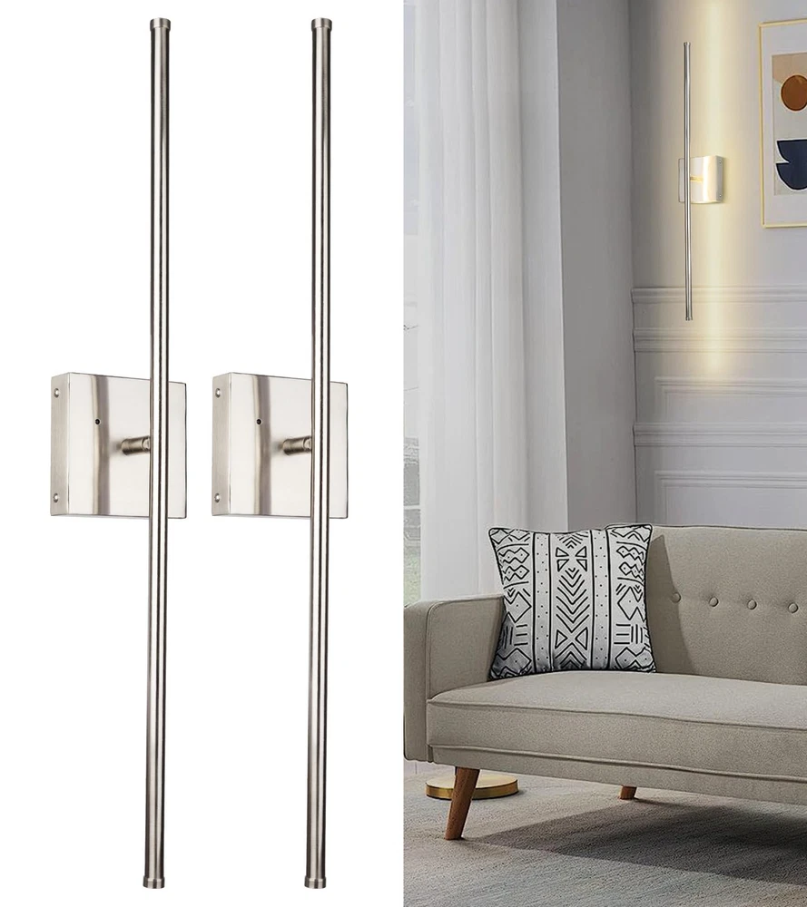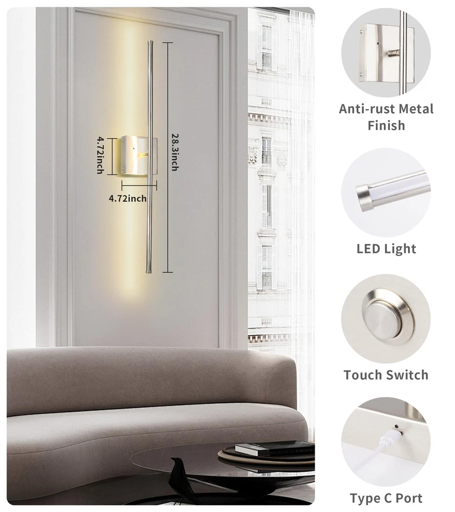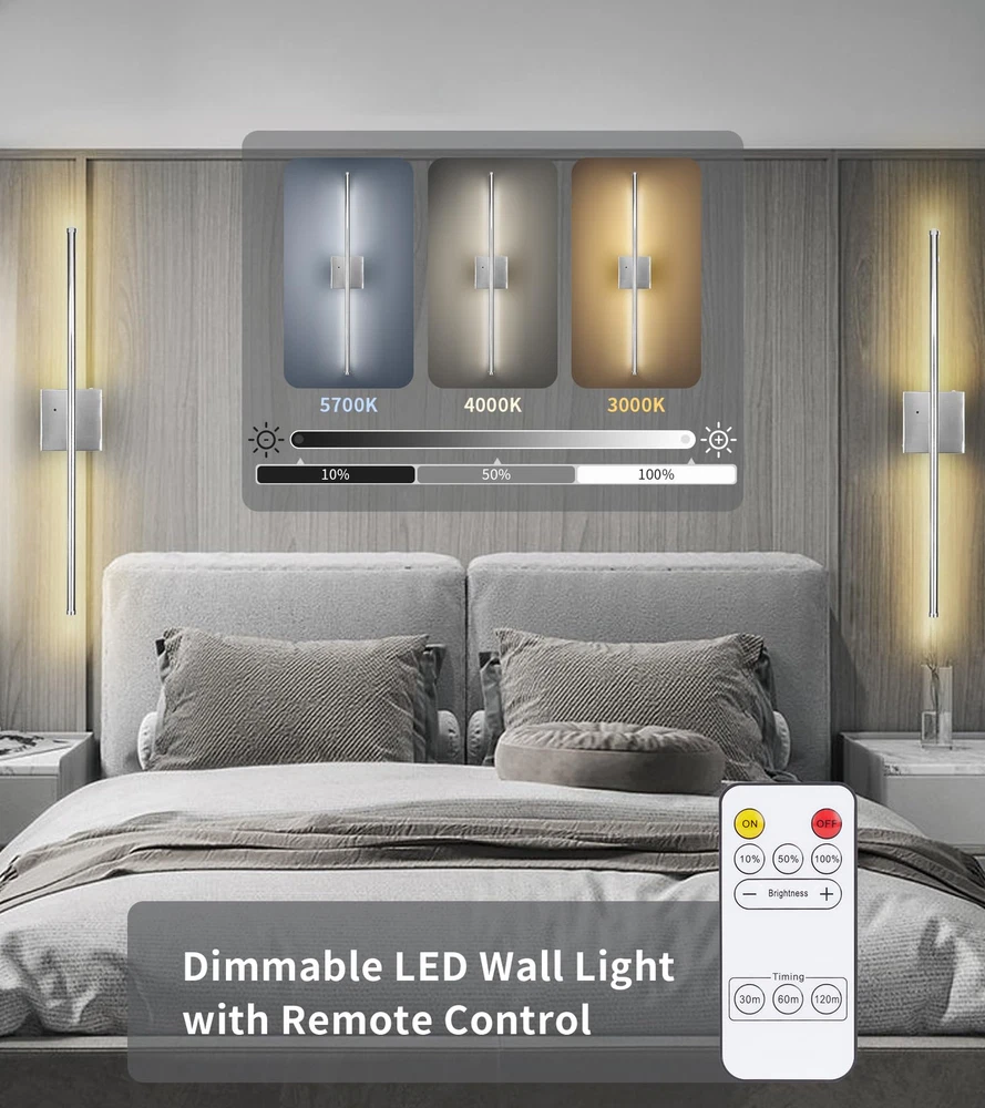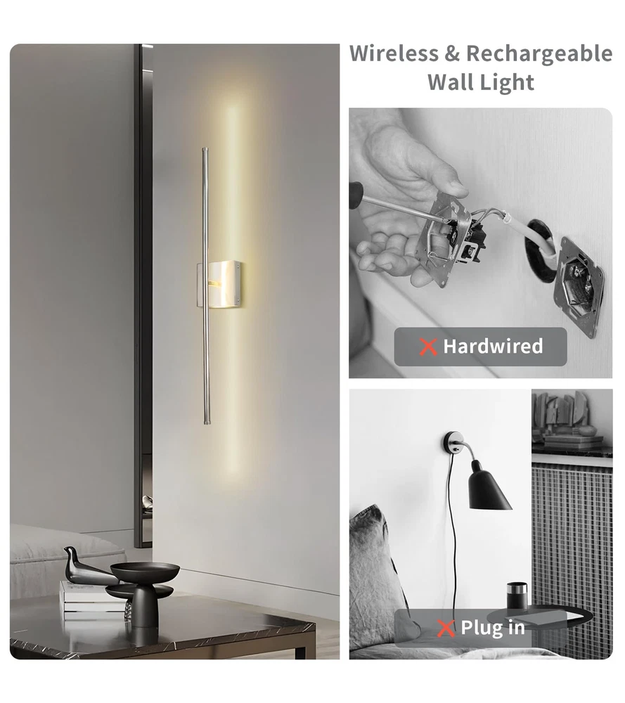 Wireless Wall Sconce: The wall light comes with a metal wall hanging, which can be easily accessed and removed, taken down for charging or repositioned only by fixing the wall hanging in place. No more wiring when installing the wall light. Dimmable LED Wall Lighting Fixture: The LED wireless wall sconce supports adjustable light color temperature and is dimmable. Through the remote control, you can adjust the brightness and darkness according to the needs of the environment, which is convenient and practical. Remote & Touch Control: Wireless wall sconce set of 2 with remotes, that can be on/off, the brightness adjusted, and timing via remote. The touch button can turn on/off and switch 3 different color temperatures of light. Battery Operated Wall Sconces: Modern Rechargeable Wall Sconces built-in 10000mAh battery lighting time up to 20-22h, Charging duration 5-6 hours. No wiring installation, including charging cable, and plug not included. Wide Application: Straight wall lamps with modern style and bright functionality, both as lamps and as decorative objects at the same time, which create a cozy and warm atmosphere, ideal for living room, bedroom, corridors, entryway, hallway, and dining room. Wireless Rechargeable wall sconces solve the inconvenience of installation while giving another option for home decor.