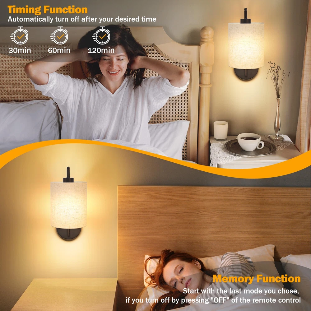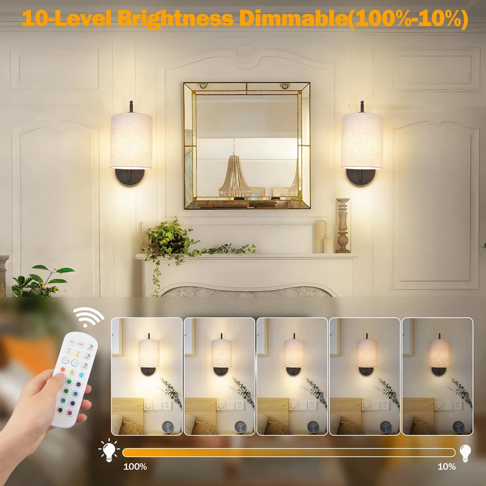 No Wiring Required & Easy to Install--No wiring and not hardwired requirement, these battery-operated wall lights come with everything you need to install. The rechargeable wireless sconces are especially useful during power outages or emergencies, providing reliable illumination when you need it most. Battery Operated Wall Sconces with Remote Control--Wireless wall light includes a USB rechargeable LED bulb, saving you the hassle of finding a compatible one. With a 2500mAh battery, these wall lamps can light up your space for 10-50 hours on a full charge. Enjoy the convenience of wireless control with the included remote, allowing you to turn the wall-mounted light on and off, adjust color temperature, and set brightness with ease. Dimmable Wall Light with Timer & Memory Function--This battery-powered wall lamp features a dimmable function that allows you to adjust the brightness in 10 levels, ranging from 100% to 10%. Additionally, the wall sconce includes a timer function that can be preset for 30, 60, or 120 minutes, ensuring they automatically turns off for added convenience and energy efficiency. The wall lantern also remembers your last setting, eliminating the need for reconfiguration. Rechargeable Bulbs Included--This 2-pack indoor cordless wall sconces come with two E26 bulbs with enhanced magnetic capabilities and detachable charging. Simply remove and charge them using the provided Type-C cable. The bulbs fully charge in about 4 hours and offer up to 50 hours of runtime. The LED bulb features 3 color temperatures (Warm, Warm White, and Daylight White), 12 RGB colors, and 2 dynamic modes, allowing you to create various atmospheres to suit your daily needs. Wide Application of Stylish Wall Lighting--Crafted from exquisite metal with a solid-hued metallic finish, this dimmable wall sconce features a simple design and a drum-shaped linen shade, offering a stylish aesthetic and warm glow. Perfect for bedrooms, living rooms, staircases, hallways, kitchens, and more, this wall mounted lamp complements any traditional decor or color scheme.