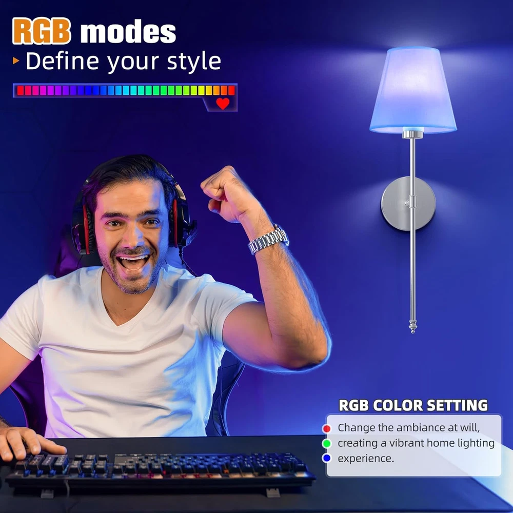 Type: Does not apply Item model number: SW013 Number of Light Sources: 2 Style: Modern Light fixture form: Sconce Specific Uses For Product: Bedroom, Entryway, Kitchen, Bathroom,Living Room, Hallway, Dining Brand: Does not apply Room Type: indoor gtin13: 7445036337387 Batteries Required?: No Switch Type: Push Button Wattage: 2.5 watts Special Features: 3CCT & 10 Colors, Timer, Memory functions, Battery powered & Wire Item Weight: 3.89 pounds Voltage: 3.7 Volts Shape: Round Product Dimensions: 4.7"L x 5.5"W x 24"H Included Components: 2 x Bulb, 2 x Remote Control, 2 metal lamp holders, 2 white ‎fabr Bulb Base: E26 Controller Type: Remote Control Finish types: Polished Assembly Required: Yes UPC: 7445036337387 Finish Type: Polished Color: Brushed Nickel Shade Material: Fabric Batteries Included?: No Mounting Type: Wall Mount Shade Color: White Light Source Type: LED Power Source: Battery Powered Unit Count: 2.0 Count Special Feature: 3CCT & 10 Colors, Timer, Memory functions, Battery powered & Wire Control Method: Remote Size: 24 inch Batteries: 4 Lithium Ion batteries required. Material: Metal Indoor/Outdoor Usage: Indoor Brightness: 300 Lumen Lighting Method: Adjustable Fixture Type: Non Removable