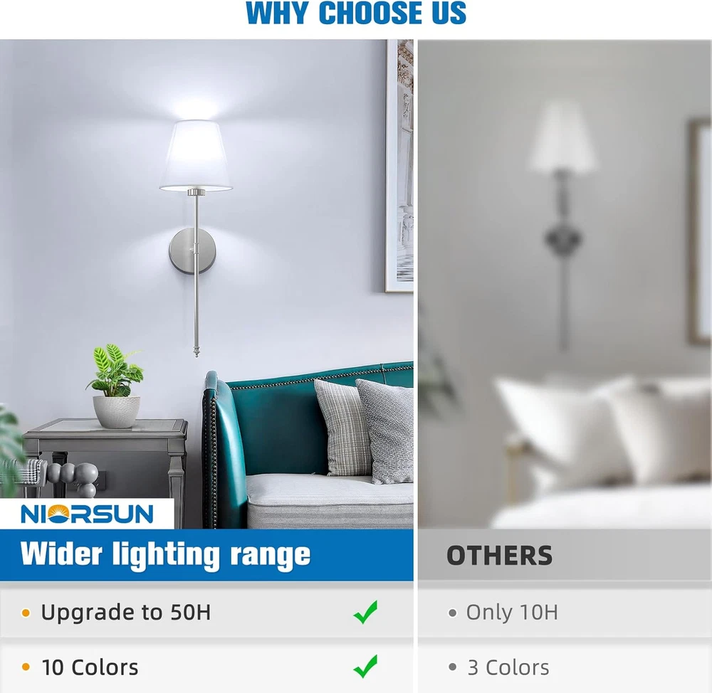 Store New Arrivals Add to Favorite View Feedback Contact Battery Operated Wall Sconce Set of 2,Brushed Nickel Rechargeable Wall Lights with 5200Mah Dimmable Detachable Bulbs and Remote, 10 Colors Wireless Sconces for Bedroom Living Room Hallway Description Item model number SW013 Light Source Type LED Style Modern Power Source Battery Powered Fixture Type Non Removable Number of Light Sources 2 Control Method Remote Batteries Included? No Lighting Method Adjustable Controller Type Remote Control Unit Count 2.0 Count Room Type indoor Assembly Required Yes Switch Type Push Button Product Dimensions 4.7"L x 5.5"W x 24"H Material Metal Batteries 4 Lithium Ion batteries required. Finish Type Polished Specific Uses For Product Bedroom, Entryway, Kitchen, Bathroom,Living Room, Hallway, Dining Room,Dressing tables,Mirror cabinets Included Components 2 x Bulb, 2 x Remote Control, 2 metal lamp holders, 2 white ‎fabric lampshades, 2 sets of screws Indoor/Outdoor Usage Indoor Brightness 300 Lumen Batteries Required? No Item Weight 3.89 pounds Light fixture form Sconce Special Features 3CCT & 10 Colors, Timer, Memory functions, Battery powered & Wireless, Dimmable(20%-100%) Special Feature 3CCT & 10 Colors, Timer, Memory functions, Battery powered & Wireless, Dimmable(20%-100%) Bulb Base E26 Shade Color White Mounting Type Wall Mount Color Brushed Nickel Wattage 2.5 watts Shape Round Voltage 3.7 Volts Shade Material Fabric Finish types Polished Size 24 inch 【Wireless & Easy to Install】NIORSUN wall sconces set of two battery operated comes with two 300 lumen, 5200 mAh E26 rechargeable bulbs. It can work 25H for highest brightness, 72H for low brightness fully charged.Our rechargeable wall sconce redefine convenience with their easy installation, no wiring required. With a sleek and contemporary design, these sconces effortlessly blend into any indoor space, providing both functionality and style. 【Dimmable & Color Customized】Customize your lighting experience with adjustable color temperatures ranging from 3000K to 6500K and five levels of brightness (20%-100%),as well as 10 RGB colors.Whether you need warm, cozy lighting or bright, energizing illumination, our sconces wall decor set of 2 offer a comprehensive range of lighting options. 【Timer & Memory Function】You can easily set a timer for the wall sconces set of two to automatically turn off after 1-8 hours, helping to preserve battery life and reducing unnecessary power consumption.What's even better, the wall sconces battery operated will remember your last color and brightness settings when powered off and on again,eliminates the hassle of reconfiguration. 【Remote Control & Easy operations】Wireless sconces set of 2 take full control of your lighting experience with the included remote. Easily customize brightness levels and light effects from the comfort of your couch or bed. With just a press of a button, you can create the perfect ambiance for any occasion, whether it's movie night or a cozy evening at home. 【Unique Design & Wide Application】The NIORSUN sconces wall lighting battery operated draws inspiration from classic candelabras, boasting a unique nickel-finished lamp frame and a white fabric cover. Crafted with premium matte metal materials and impeccable craftsmanship, this lamp epitomizes sophistication and quality,suitable for various spaces including dressing tables, mirror cabinets, bedrooms, hallways, entryways, living rooms, kitchens, and stairs. It's an ideal choice to enhance both the lighting and decor of your home. 【100% Satisfaction Service】We proudly stand behind all of our products 100% and offer a full 1-year service for our wall sconces. This will cover you if the sliver wall lights stop working or there are any defects within those 1 year. Product Description ABOUT US We offer the best prices around on high quality products. Our E-store includes media such as books, movies, music and games while offering electronics, toys, sporting apparel, clothing, tools, general home, garden items and more. SHIPPING We are always working hard to ensure your package arrives as soon as possible. Please understand that some factors like weather, high postal traffic, and the performance of shipping companies are outside of our control. We offer free shipping to the lower 48 states and ship within 2 business days of payment, usually sooner. We do not accept P.O. Boxes. Please provide a physical address. For shipping outside of the continental USA, we only use eBay's Global Shipping Program.The item is shipped to KY and then sent to the rest of the world. International customers are responsible for all duties and taxes. Continue to check out in order to calculate costs for shipping the item to your country. Messages regarding eBay's Global Shipping Program MUST be directed at eBay EXCLUSIVELY. RETURNS We offer a 30-Day Return Policy on items which you are not completely satisfied with. You have the option for a full-refund or an exchange of the item. No returns are available on items shipped outside of the USA. PAYMENT We accept PayPal. CONTACT US This page content is yet to come Please ad us to your favorite seller and visit again later Thank You CUSTOMER SATISFACTION We try our very best to make sure every customer is completely satisfied. If there's a problem, message us! We're happy to help. WE ACCEPT Copyright © 2021 AutoDS. | All Rights Reserved