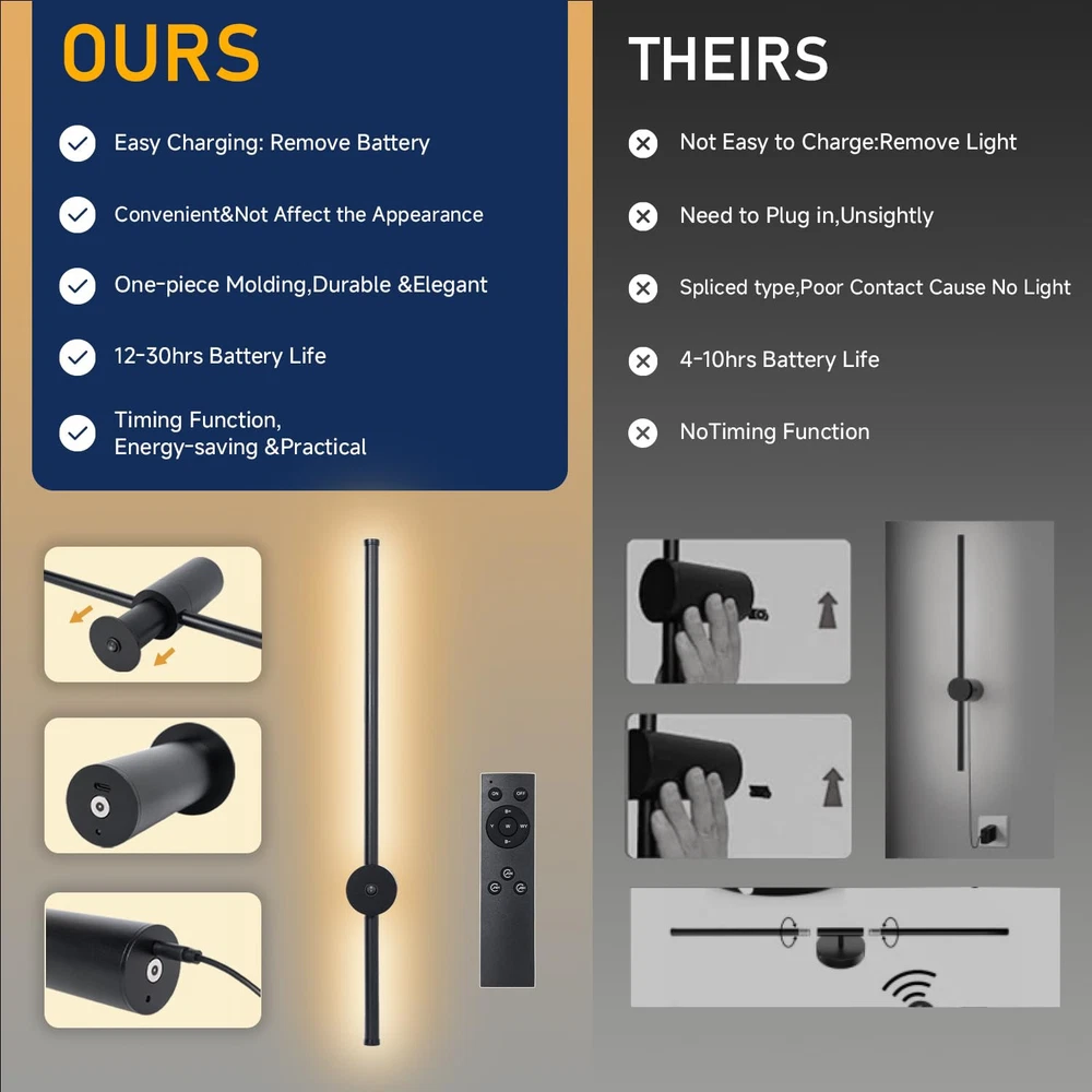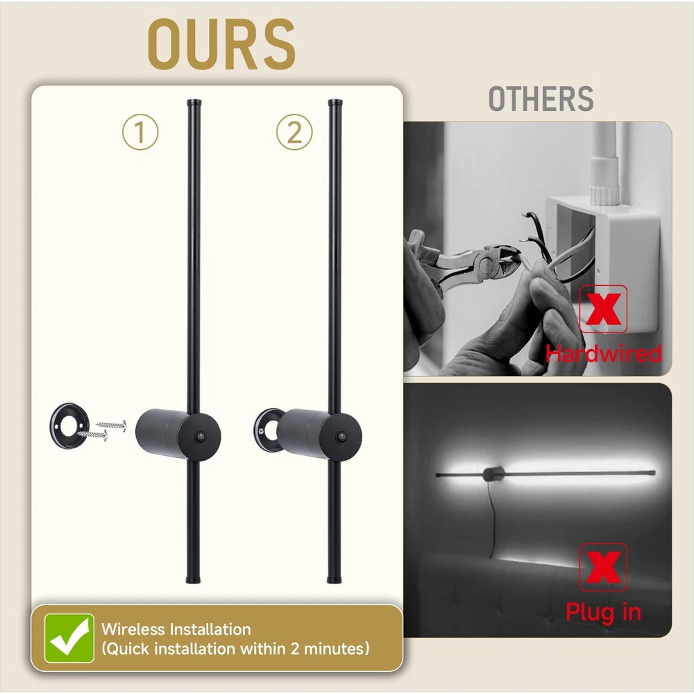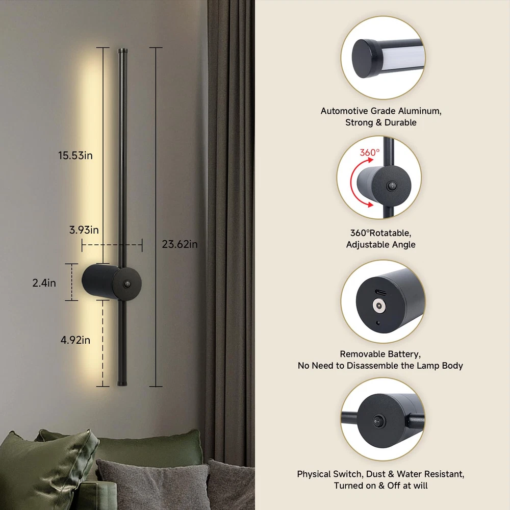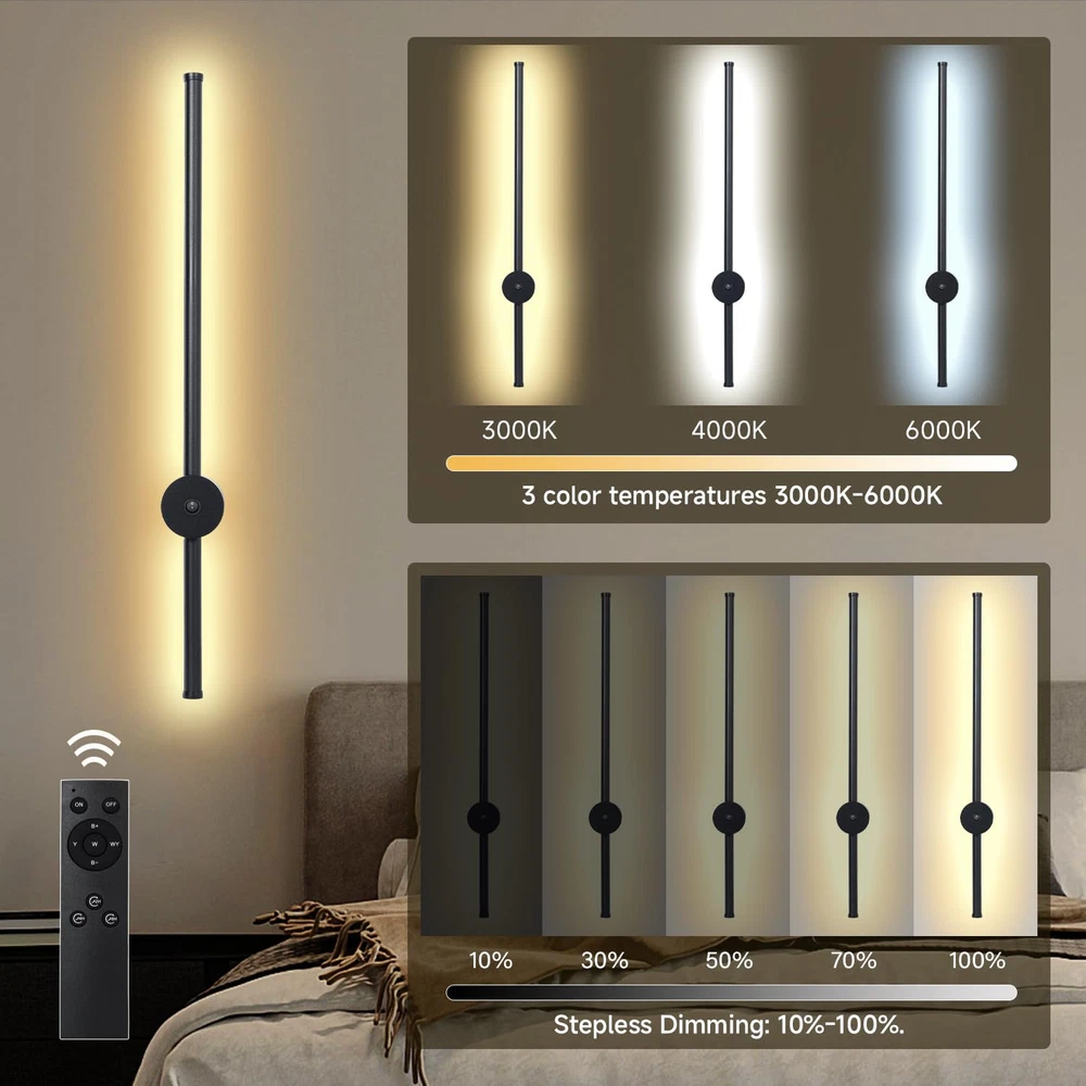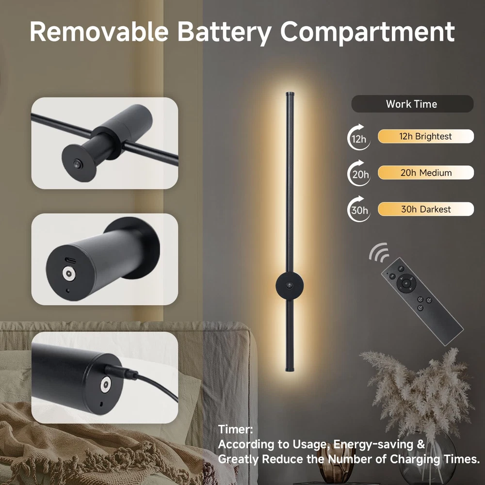 Easy No-Wire Setup & USB-C Fast Charging: Install these battery-powered wall sconces in minutes—no drilling or wiring required. The high-capacity battery recharges in under 4 hours via the included USB-C cable, delivering convenient, cable-free illumination perfect for renters, dorm rooms, or anywhere you need flexible lighting. Warm to Cool Lighting, Steplessly Dimmable: Customize your lighting ambiance with adjustable color temperature from a soothing 3000K glow to a crisp 6000K daylight tone. Smoothly dim brightness from 10% to 100% to suit any mood—ideal for reading, relaxing, highlighting décor, or creating an inviting atmosphere for guests. 360° Rotatable Design for Perfect Light Placement: Unlike limited-angle fixtures, our sconces rotate a full 360°, allowing you to direct light precisely where you need it. Brighten a dim hallway, spotlight artwork, or pivot the beam onto your bedside table for nighttime reading—all with a simple adjustment. Convenient Timer & Dual Control Options: Save energy and reduce battery wear with built-in 2H/4H/8H timer settings that automatically shut off the lights. Operate the sconces using the handheld remote or on-unit touch controls, with a memory function that recalls your last chosen settings for instant, personalized comfort. High-CRI LEDs & Modern Minimalist Aesthetics: Equipped with high-quality, high-CRI LEDs, these wall sconces provide eye-friendly illumination that accurately renders colors and details in your home. Their sleek, contemporary design complements any interior style—from cozy bedrooms and chic living rooms to elegant hallways—elevating both function and décor.