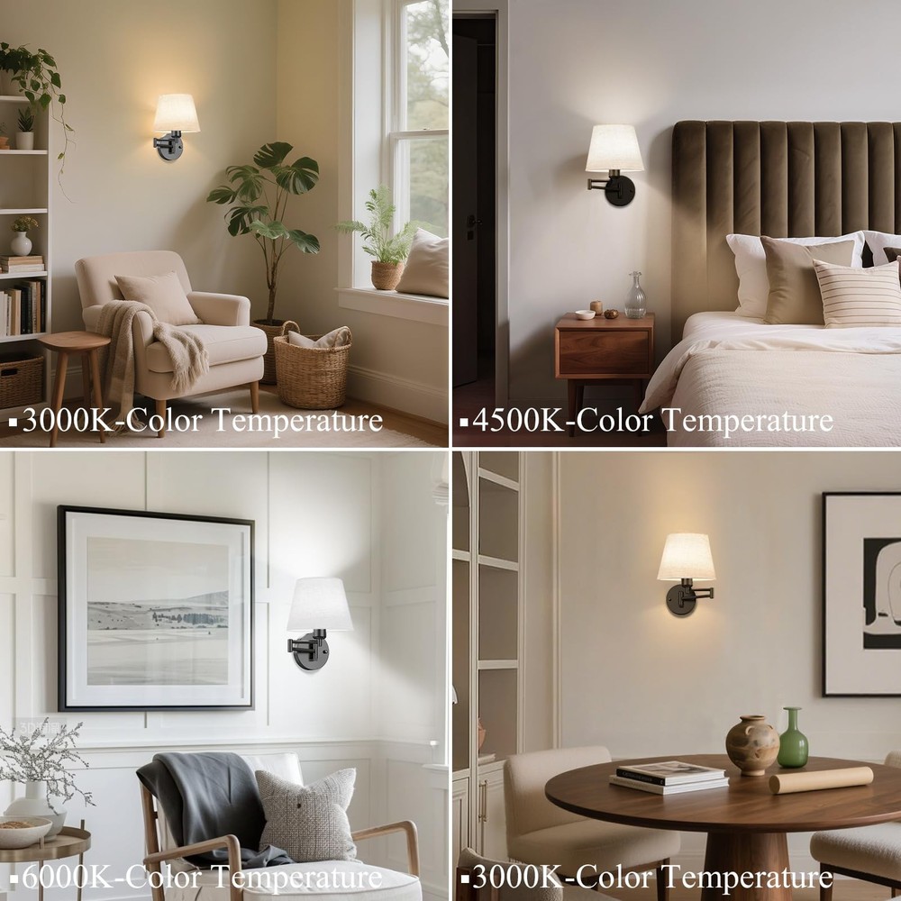 Battery Operated Wall Sconces Set of Two are wireless swing arm wall lights. Equipped with 10000mAh rechargeable bulbs, they offer long battery life. With RGB & 3 color temps, dimmable, they suit moods. The cordless swing arm adjusts flexibly. As wall decor, the black 2-piece set fits bedrooms, living rooms. Remote-controlled, Type-C charging, easy to install without wiring—practical and stylish. 【10000mAh Long-Lasting Wall Sconces】Each wireless wall sconces has a 10000mAh large-capacity removable, rechargeable bulb. Delivers up to 96 hours of continuous light at lowest brightness – no frequent recharging needed. Reliable backup during power outages. 【Multi-Functional RGB & Dimmable】The battery operated wall sconce feature 3 color temperatures plus 12 RGB hues suit mood or decor. 5-level brightness adjusts easily to fit any occasion. 【Flexible Swing Arm】The bedroom wall sconce swing arm can be adjusted 180 degrees left and right freely, and the two arms can rotate 360 degrees horizontally. It extends well, allowing you to freely adjust the lighting angle to meet your lighting needs. 【Modern High-End Style】This sconces wall decor set of 2, designed for bedrooms, living rooms, hallways and other indoor spaces, features a black lamp body with an exquisite design and a stylish fabric lampshade. It fits modern, classic and other styles, enhancing the look of these spaces and foyers alike. 【Remote Control: Effortless and Smart】Adjust brightness/color temp via remote from sofa/bed. Type-C charging, 30/60/120-min auto-shutdown, and last setting memory for hassle-free use. 【Easy Installation & After-Sales Guarantee】The rechargeable wall sconces set of 2 installs easily – no wiring/electricians needed. Fits old homes, rentals, dark corners. 2-year warranty; contact us anytime for issues, solutions within 24 hours.