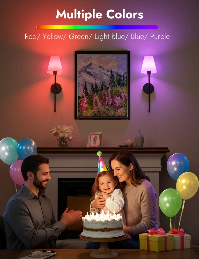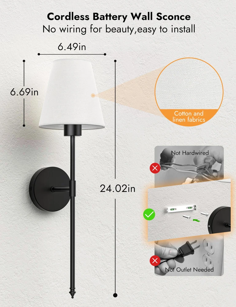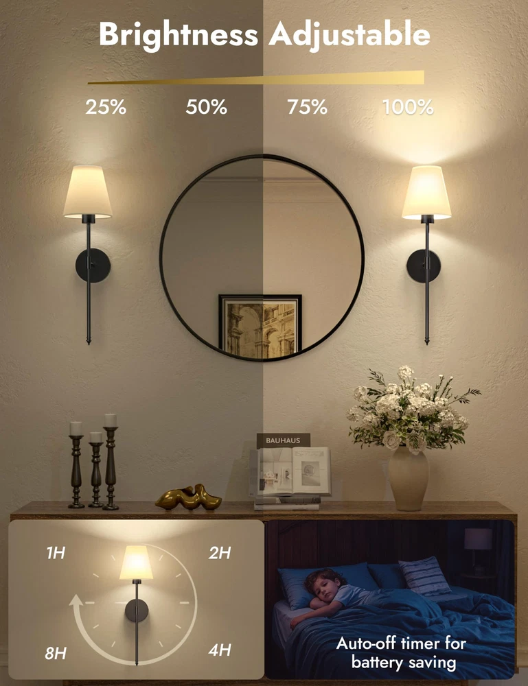 Battery Operated Wall Sconce Set of 2,Black Rechargeable Wall Lights with 5200mAh Dimmable Detachable Bulbs,10 Colors Wireless Sconces for Bedroom Living Room Hallway 【Wireless & Easy to Install】wireless sconces set of 2 are battery - powered, coming with two rechargeable 5200mAH LED bulb. Wall sconces set of two battery operated eliminating the hassle of wiring within the walls, conveniently for users who don't want to damage the wall surface and those without pre - installed electrical wiring, or renters. Sconces wall lighting battery operated are suitable for bedroom, living room, hallway, bathroom, kitchen, and stairway etc, creating an elegant and stylish atmosphere for your indoor space. 【9 Lighting Colors】Our battery powered sconces set of 2 offers diverse lighting options. It has three color temperatures: 3000K creates a cozy and inviting atmosphere, 4000K provides a clear and natural illumination, and 6000K is bright and energetic. There are also six RGB colors to switch between. Whether for a party or daily use, you can easily customize the lighting to suit different moods and occasions. With the black sconces wall decor set of 2, creating the perfect lighting environment is a breeze. 【Dimmable & Energy Saving】300 Lumen/5200 mAH. The battery powered wall sconce offers four brightness levels: 25%, 50%, 75%, and 100%. Customize the light according to your needs and desired atmosphere. Whether for a relaxing night or tasks, switch between settings easily. The working time of the black wall lights battery operated depend on brightness. It lasts 72 hours at the lowest brightness and 25 hours at the highest. 【Timer and Memory Function】You can easily set a timer for wall lamps battery operated to automatically turn off after 1 to 8 hours. This helps extend the battery life and reduces unnecessary power consumption. Even better, when you turn off and then turn on this rechargeable wall sconces set of 2 again, it will remember the color and brightness settings you last used, eliminating the hassle of re - configuration. 【100% Satisfaction Service】: We proudly stand behind all of our products 100% and offer a full 2-year service for our rechargeable wall lights. This will cover you if the wireless lights for wall indoor stop working or there are any defects within those 2 years. 【100% Satisfaction Service】We proudly stand behind all of our products 100% and offer a full 2-year service for our wall sconces. This will cover you if the black wall lights stop working or there are any defects within those 2 years.