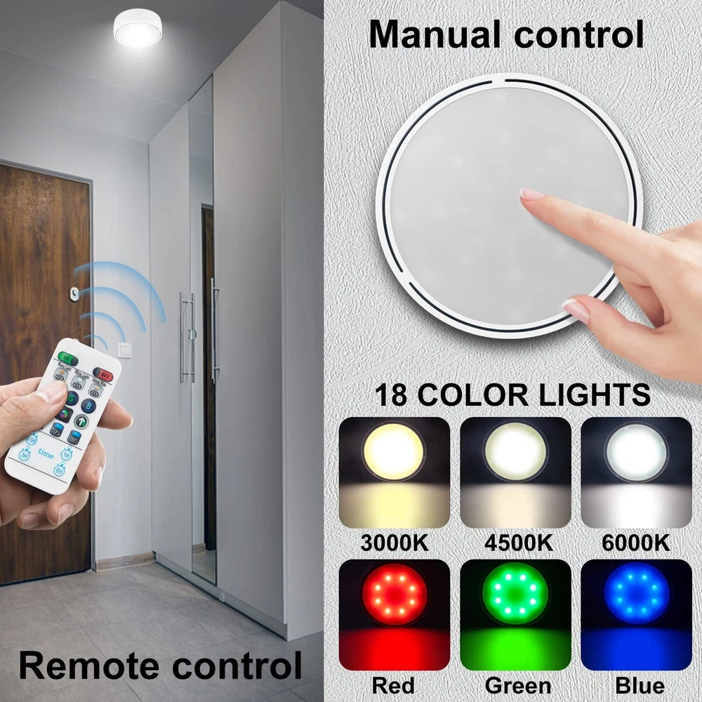 More Details *Size: 5.4"L x 5.4"W x 2"H * Material: ABS * 300 Lumens, 3000K/4500K/6000K, DC 5V, LED lifespan is 80,000 Hours. * The remote control can operate the light within 10 feet. * Powered by 3pcs D-Cel batteries (not included) or 5V/2A DC USB power cord(included, 10ft), and each set of batteries’ run time is 50-80 hours. * Choose a color from the 18 colors by pressing a corresponding color button. Set brightness and color-changing modes at dynamic mode / jump/ breath/ colorful rotation / gradient / solid color rotation. * Can be used anywhere like elder's room, kid's room, bathroom, hallway, wedding, party decoration, etc. Packing List - 1 x Ceiling Light - 1 x Remote Control - 1 x 10ft DC Power Cord - 4 x Screw Hardware - 3 x Plastic Anchor - 6 x Wire Clip - 1 x User Manual [Timer Function] -- You can set the shower light to turn off automatically in 0.5/1/3/6 hours by pressing the timer buttons on the remote, save energy and prolong battery life. [Brightness Dimmable] -- Press the dimmer buttons on the remote to adjust the brightness of the ceiling light to 30%, 70%,100%. [2 Power Supply Modes] -- The 5.4" puck light can be powered by 3pcs D-Cell batteries (not included), very long lasting, or you can use 5V/2A DC USB(included) to power it directly. [Super Bright] -- Each night light is 300 lumens, very bright, and there are 3 color temperatures for your choice, you can set it to warm white(3000K), natural white(4500K) or cool white(6000K). [5 Lighting Modes & 18 Colors Changing] -- The mood light has 18 color choices and 5 lighting modes, you can change the colors freely or set them jump or rotate. [Easy Installation] -- Very easy to mount with provided screws, no additional wiring is needed. Good choice for your bedroom, bathroom, hallway, corridor, bedside, closet, shower, stairway, closet, pantry, living room, kitchen, laundry room, etc.
