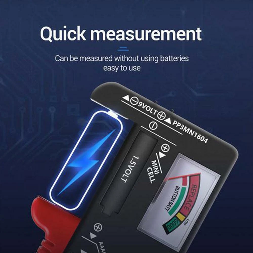 Description Universal Button Battery Checker Tester AA AAA C D 9V Don't for Guess Which Batteries to Keep and Which to throw Away, Place your battery between the two points of the battery tester, and the easy-to-read display will tell you instantly whether you have a dud, or if you can eke out another few minutes of battery life. Checks power level of all 1.5V & 9V batteries Easy to read, colour coded meter indicates power level Tests 1.5V miniature cells Three result: red=replace, yellow=low power, green=good If needle does not move,check that battery is touching both contacts before assuming that it is completely dead. The battery tester may be used to test the following sizes: 1.5V: AAA,for HP16, MN2400, R03 AA, HP7, MN1500, UM3 C, HP11, MN1400, SP11, LR14, UM2 D, HP2, MN1300, SP2, R20,UM1 9V: PP3, MN1604, 6F22, 006P NOTE: The battery tester is activated by the battery being checked. Keep test times as short as possible, to avoid unnecessary battery drain. Color: Black Item size: 110*59*25mm Note:AAA battery not include Packing content: 1 x Battery Tester