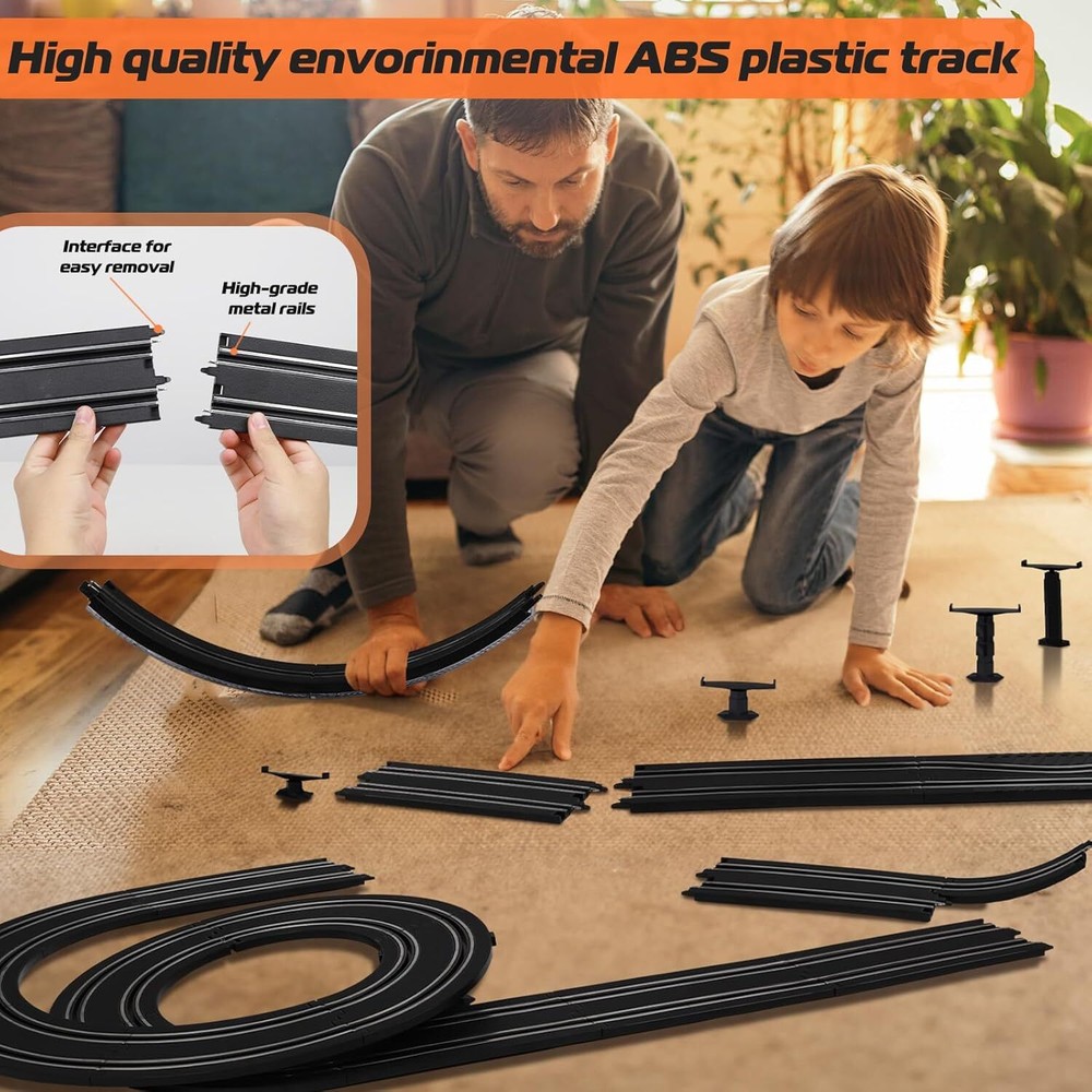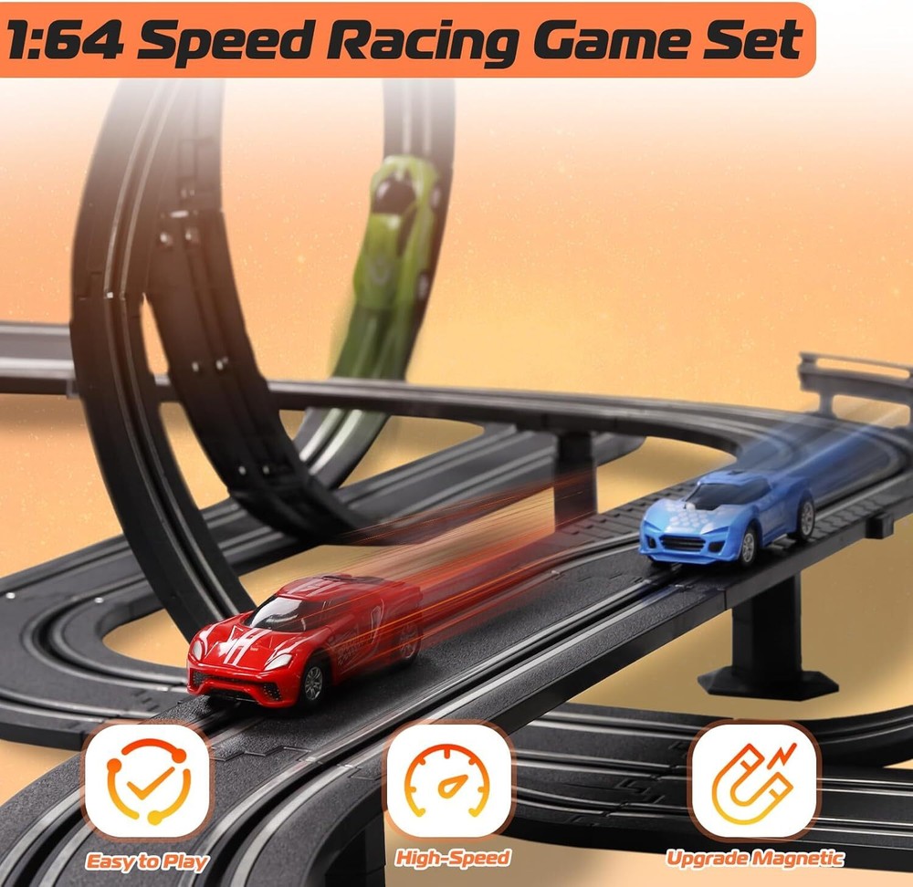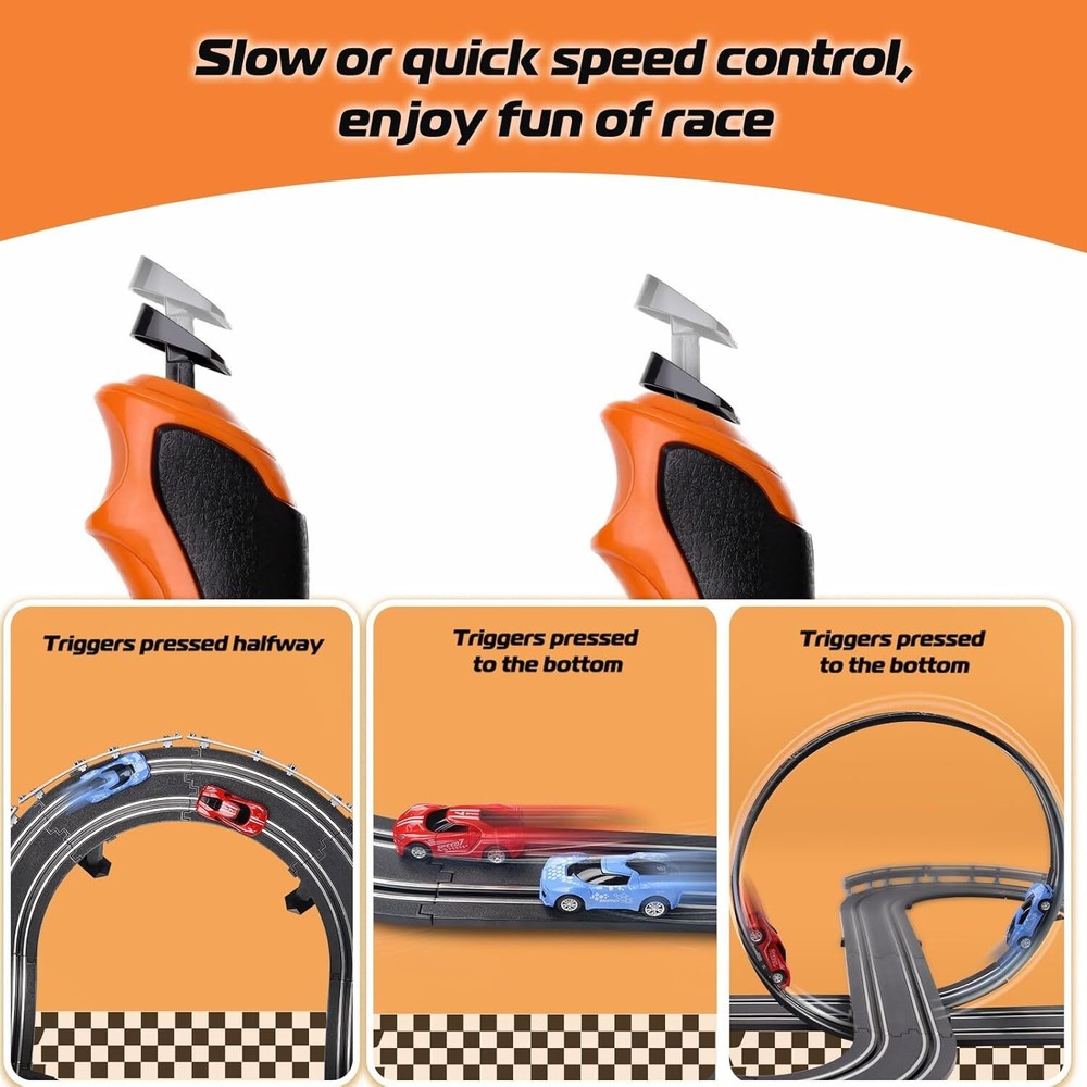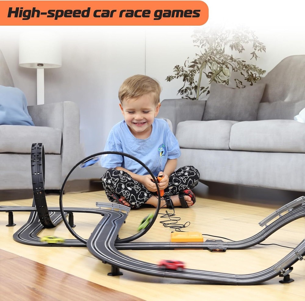 Slot Car Race Track Set, Battery or Electric Race Car Toys for 3 4 5 6+ Year Old Brand TooLion Product Dimensions 263 x 12 x 4 inches Item Weight 4.61 pounds Country of Origin China Item model number A64-20A Manufacturer recommended age 36 months - 12 years Manufacturer TooLion Features Fast & Entertaining Slot Car Race Track: The slot cars goes perfectly and kids just hold the triggers and they'd go forever. To improve the kid's game experience, controllers allow the them to select slow or quick speed control. Dual hand controllers are ideal for family who have 2 kids age 3+ and above. Dual Race Track & Twice the Fun: The slot car race comes with 4 colors race cars, 2 race track, 2 remote controls and a variety of racing tracks, including simple straight track, S-shaped track and exciting 360 rotating circular track. So much fun playing the race with it, a best toys for boys 4-6. Perfect Gifts for Boys Girls: Car toy is suitable for children's day, New Year and birthday gifts. It can train hand and eye coordination, enhance children’s friendship. Good toys for 3 4 5 6 7 8 9 10 11 12 years old, a great gifting option to teens who are into racing. Durable & Easy to Assemble:The slot race track is made of enviromental abs plastic materials that are non toxic and safe for children. 23 FT extra length track design, easy to assemble that older kids can do it themselves with adults accompany for enhancing hands-on skills. Extra Long Tracks: 23FT track length, which is longer than most other products. A variety of racing tracks, including simple straight track, S-shaped track and exciting 360 rotating circular track. This exciting racing game is suitable for girl boys 4 -7 years old and up. Our Business 100% Customer Satisfaction We go above and beyond to ensure you receive the best level of service. Returns We want you to be happy with your purchase, however in the rare occasion that you are not, please let us know and we will contact you to arrange either a collection or a refund. Please CONTACT US before leaving any negative feedback and we will promptly sort out any issue with your order. 6218892