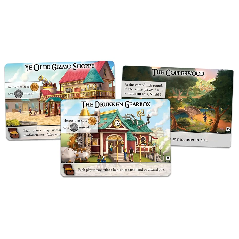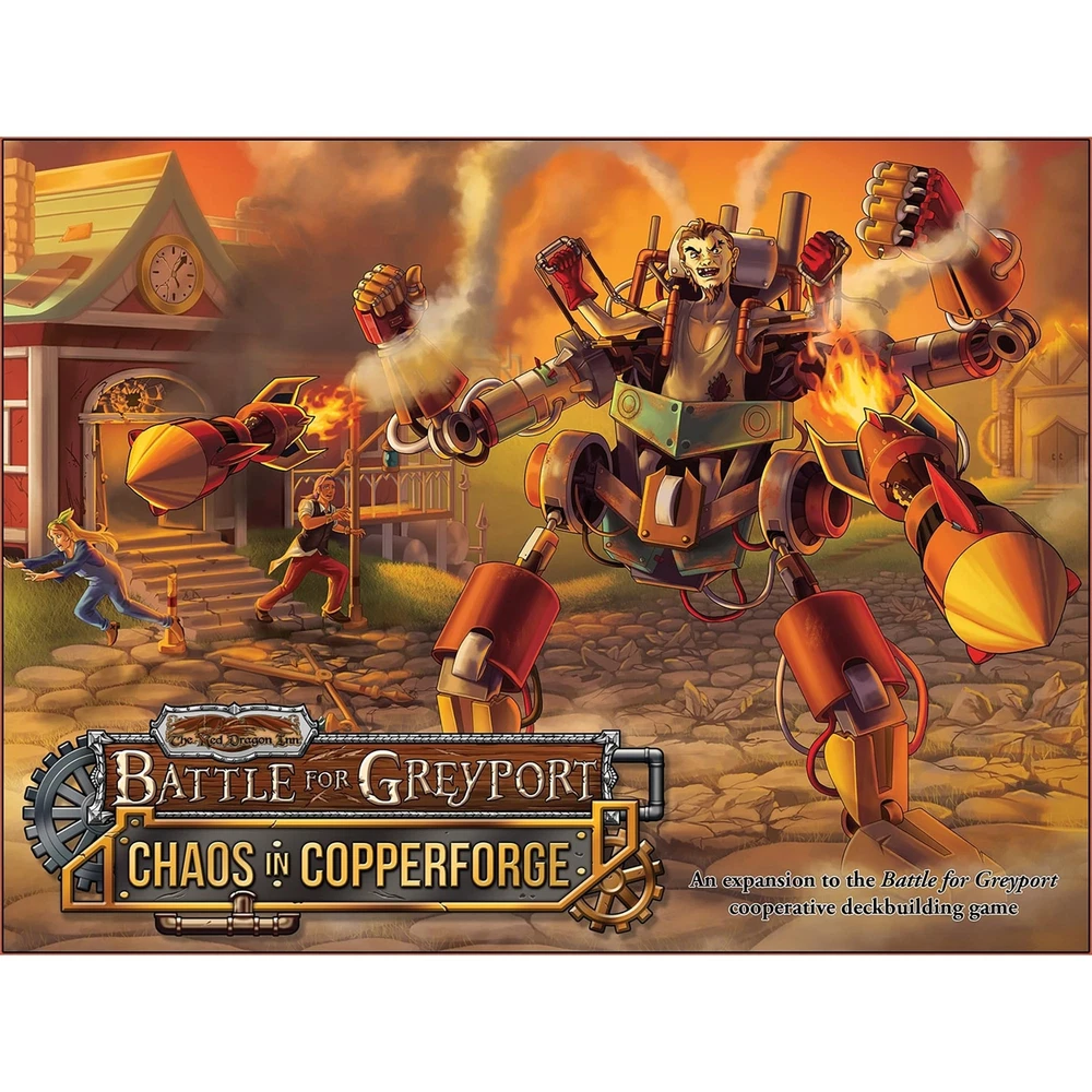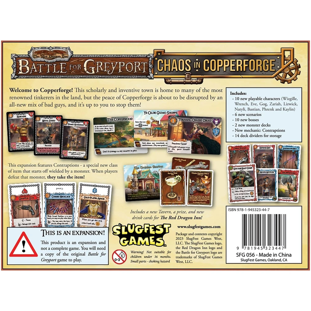 BATTLE FOR GREYPORT CHAOS IN COPPERFORGE - Copperforge is a Gnomish city, and the center of arcano-mechanical invention in the world of the Red Dragon Inn. It’s Wizgille the Tinkerer’s hometown, and normally it’s the picture of peace and prosperity (minus a few ordinary, non-malicious explosions, of course). Unfortunately, there are new and nefarious bad guys bringing all the cogwheel-ed chaos you can imagine to town! Dinglehoppers and whatzits are plentiful in Copperforge, and that means that it’s not just the heroes who are going into the fray well-equipped! Contraptions begin play attached to monsters, enhancing them with new or stronger abilities. When a monster with a Contraption is defeated, that Contraption becomes a resource for the heroes instead, to be played like an item card. In this expansion to the cooperative deckbuilding adventure game The Battle for Greyport, you’ll be able to protect the landmarks of a whole new city, halt a train heist, and KO steampunk-flavored mecha pilots. New Scenarios, new Bosses, and new Monsters are all a part of the techno-magical package! EXPANSION: Battle for Greyport base game required to play. WELCOME TO COPPERFORGE: Includes a new Tavern, a prize, and new drink cards for The Red Dragon Inn! Cooperative deckbuilding game based in the world of The Red Dragon Inn. UPGRADE THE DANGER WITH CONTRAPTIONS: A special new class of item that starts off wielded by a monster. When players defeat that monster, they take the item! ADD 10 NEW PLAYABLE CHARACTERS to your game of Battle for Greyport! Wizgille, Wrench, Eve, Gog, Zariah, Lizwick, Natyli, Bastian, Phrenk and Kaylin join the fray! EXPANSION: This product is an expansion and not a complete game. You will need a copy of the original Battle for Greyport game to play.