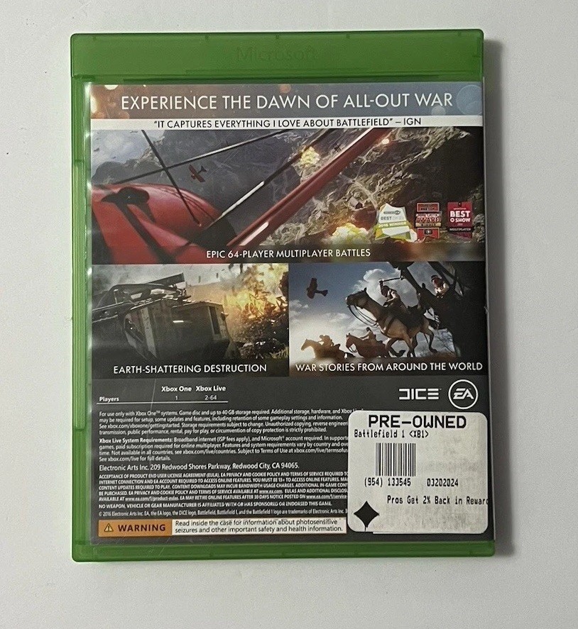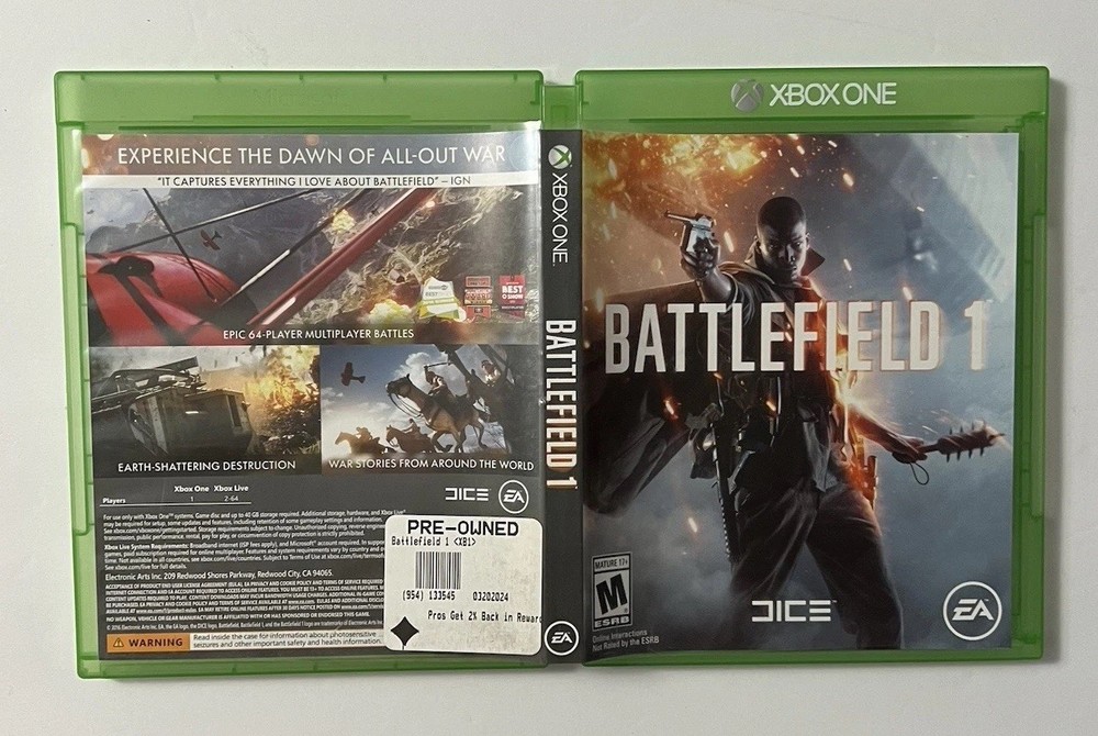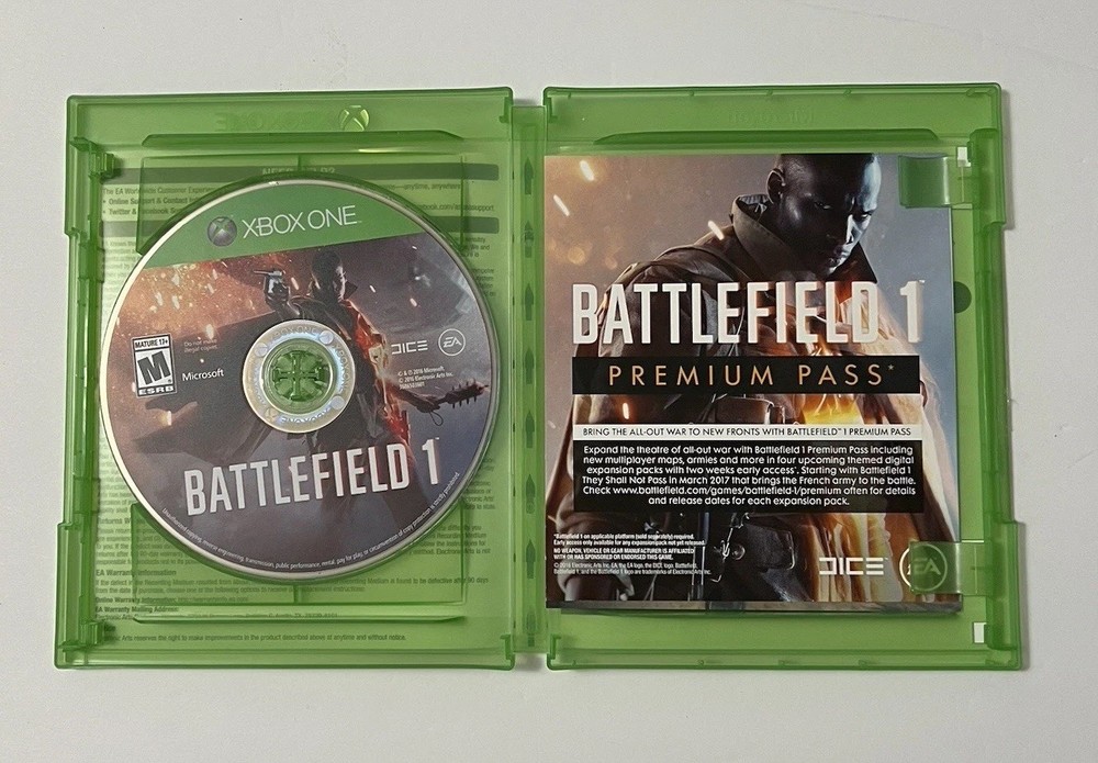 Item Condition Description (Very Good) Item is in very good condition. Disc shows minimal signs of wear and has been tested and works perfectly. Case and artwork are in great shape. Please see photos for more details on condition. ⸻ Listing Description Immerse yourself in the epic battles of Battlefield 1 for Microsoft Xbox One (2016). This complete copy includes the original case, artwork, and disc, all in very good condition. Details: • Platform: Xbox One • Release Year: 2016 • Genre: First-Person Shooter / Action • Condition: Very Good • Complete In Box (CIB) • Tested and fully functional Join massive multiplayer battles or experience an engaging single-player campaign set during World War I. Ships fast and securely — buy with confidence!