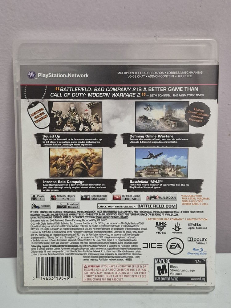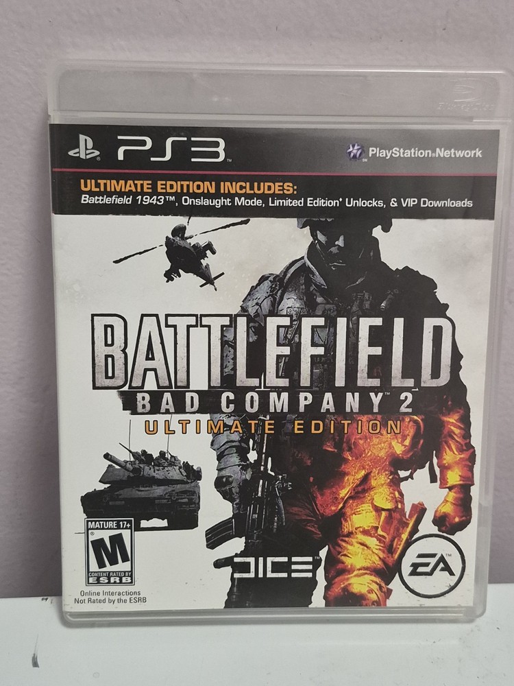 Up for sale is a complete-in-box (CIB) copy of Battlefield: Bad Company 2 Ultimate Edition for the Sony PlayStation 3. This "Ultimate Edition" includes the standard game plus additional bonus content. What’s Included: Original PS3 Game Disc (Tested & Working) Original Plastic Case with Cover Art Official Instruction Manual Condition: Disc: Very good condition, tested and plays perfectly. Manual/Inserts: Includes the original manual and Ultimate Edition inserts. (Note: DLC codes are likely already redeemed). Case: Good condition with normal shelf wear. Shipping: Ships securely in a bubble mailer via USPS Ground Advantage.