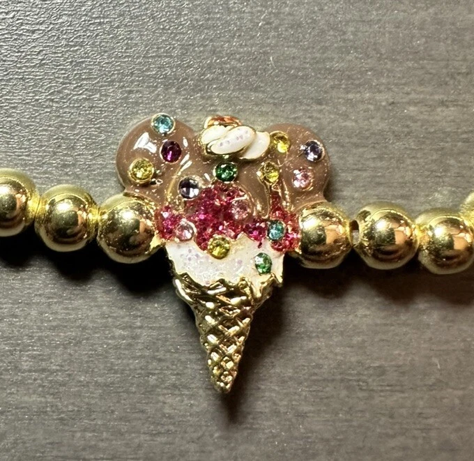 The Baublebar x Disney Mickey Mouse Ice Cream Gold Bead Pisa Stretch Bracelet is a contemporary Disneyana jewelry piece from 2024. It features a playful Mickey Mouse theme with an ice cream design, crafted by Baublebar in collaboration with Disney. The bracelet is adorned with gold beads and has a stretch design for easy wearing.