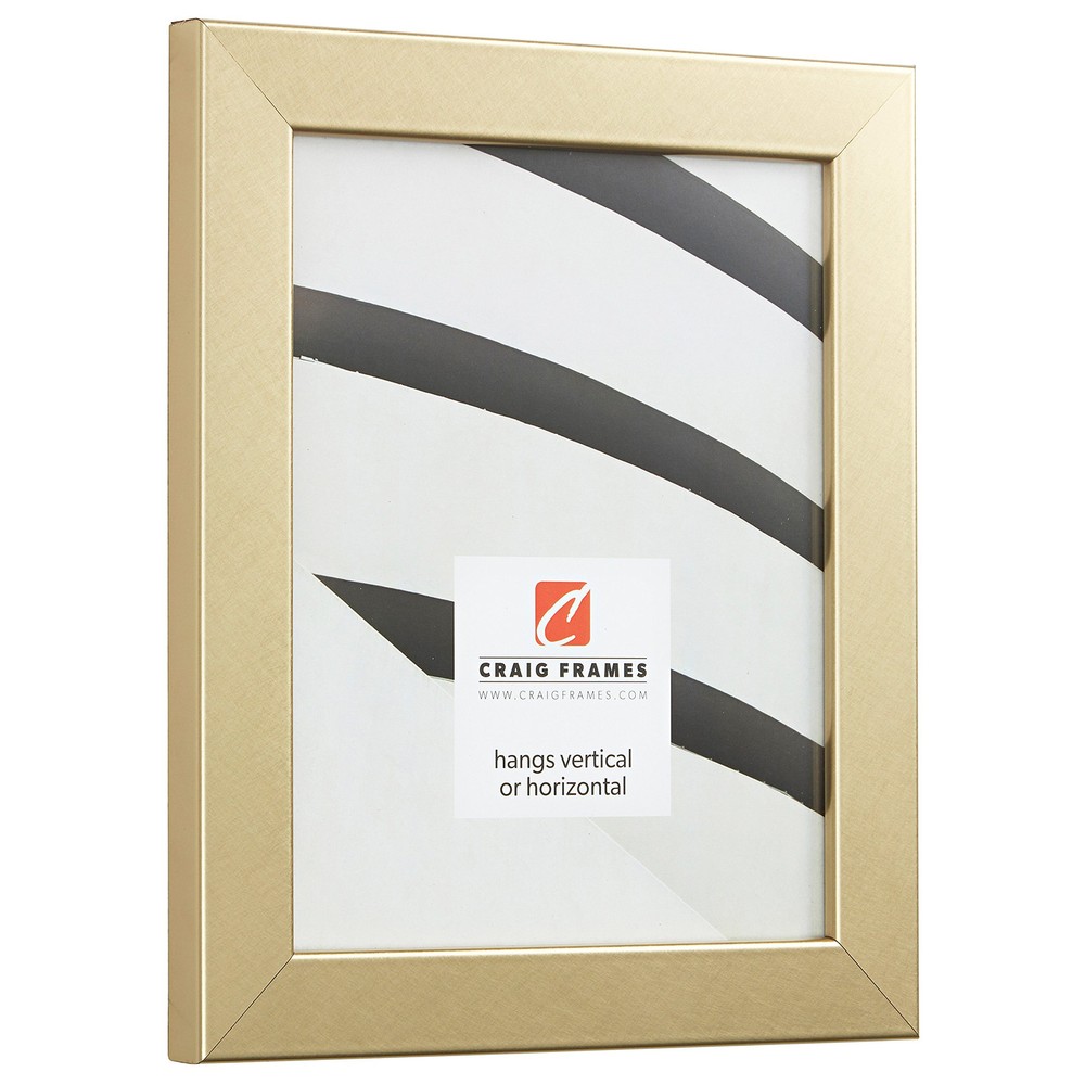 With clean rectilinear lines and a square profile, the Bauhaus 125 picture frame is ideal for most modern decor needs. Featuring molding with a composite wood core encased within a laminate wrap, this sleek 1.25 inch wide picture frame molding comes finished in Brushed Gold. With some smooth white matting you can elevate your prints to the next level. Sharp and bold, the Bauhaus 125 Brushed Gold picture frame is the perfect touch of modern. Modern style; brushed gold appearance; smooth laminate wrap finish (NOT ACTUAL METAL) Frame includes: clear acrylic facing, rigid cardboard backing and wire hanging hardware kit (some assembly required) Frame holds a 14 by 18-Inch photo/print/poster (viewable area reduced by .25 inches on each side due to frame lip) Frame moulding is 1.25 inches wide; solid MDF construction Frame is designed for WALL HANGING only (hanging hardware allows for portrait or landscape orientation)