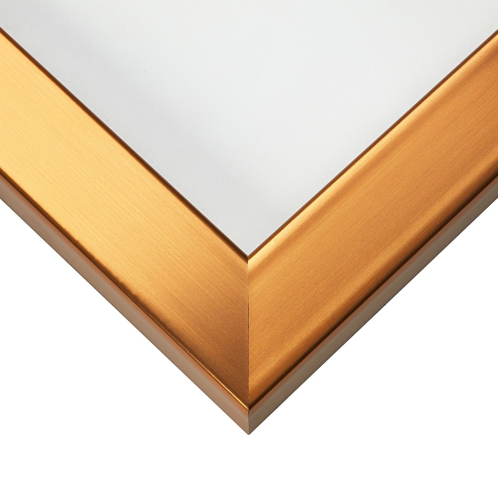 Modern style; stainless brass with copper tones; smooth laminate wrap finish (NOT ACTUAL METAL) Frame includes: glass, rigid black backing and pre-attached stamped hanging hardware Frame holds a 8 by 12-Inch photo/print/poster (viewable area reduced by .25 inches on each side due to frame lip) Frame moulding is 1.25 inches wide; solid MDF construction Frame is designed for WALL HANGING only (hanging hardware allows for portrait or landscape orientation)