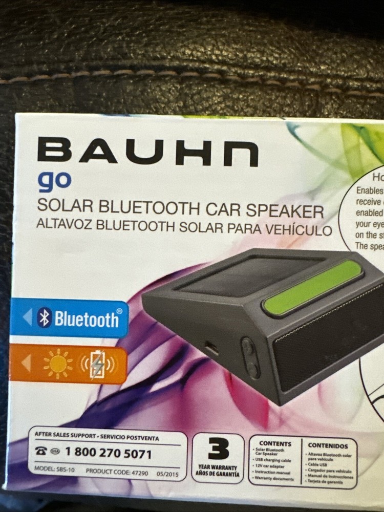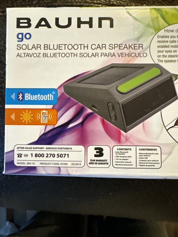 This is a new Bauhn Go solar Bluetooth car speaker. It features a solar panel that allows you to charge the speaker using solar energy. The speaker is designed to be portable and easy to use, making it perfect for outdoor activities or travel. With its Bluetooth connectivity, you can easily connect the speaker to your device and enjoy your favorite music on the go. The speaker also includes a variety of features, such as a built-in microphone and hands-free calling, that make it a versatile and convenient accessory for any driver.
