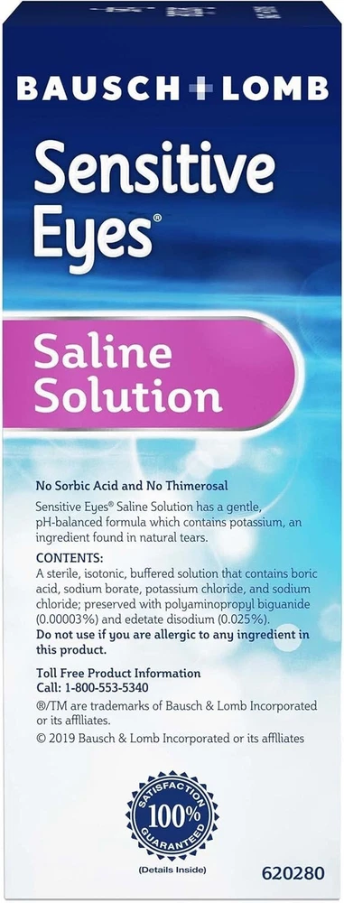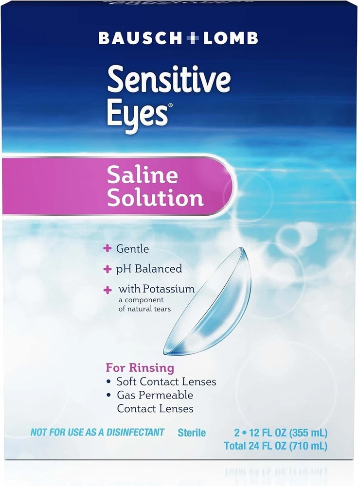 Product Description Pack of two, 12 fluid ounce (Total of 24 fluid ounce). From the manufacturer Sensitive Eyes Saline Solution Bausch + Lomb Sensitive Eyes saline solution removes loosened debris and traces of daily cleaner when used as a rinse after cleaning. It can also be used to rinse lens cases and as a final (pre-inserting) lens rinse after chemical (not heat) and hydrogen peroxide disinfection. Rinsing After Cleaning After cleaning, rinse lenses thoroughly with Sensitive Eyes Saline Solution by holding the lens between the forefinger and thumb or placing it in the palm of the hand. Direct a steady stream of Sensitive Eyes Saline Solution onto each side of the lens for 5 seconds, or until all traces of the cleaner are removed. Rinsing After Chemical Disinfection (Including hydrogen peroxide systems) Clean, rinse and disinfect your lenses as directed by your eye care practitioner. Before inserting your lenses, rinse them thoroughly with Sensitive Eyes Saline Solution.