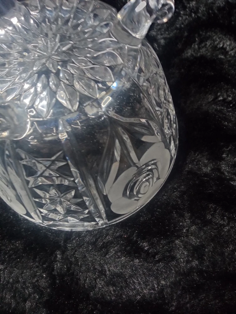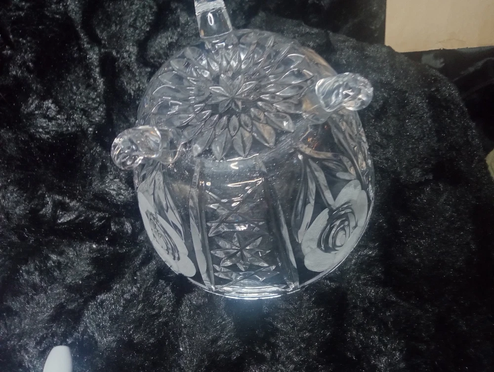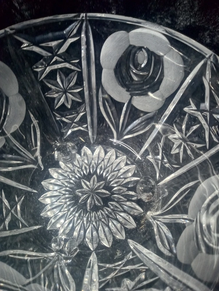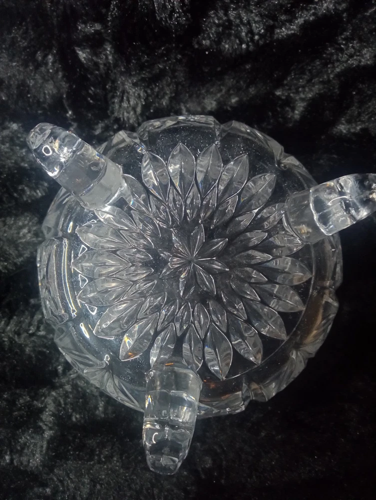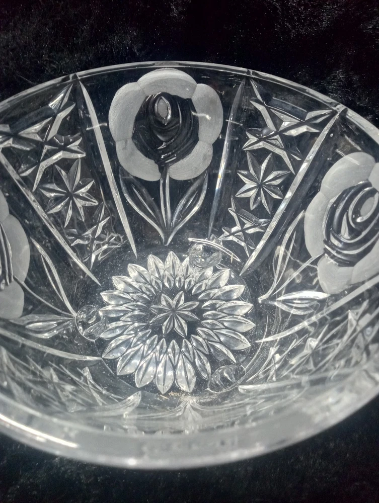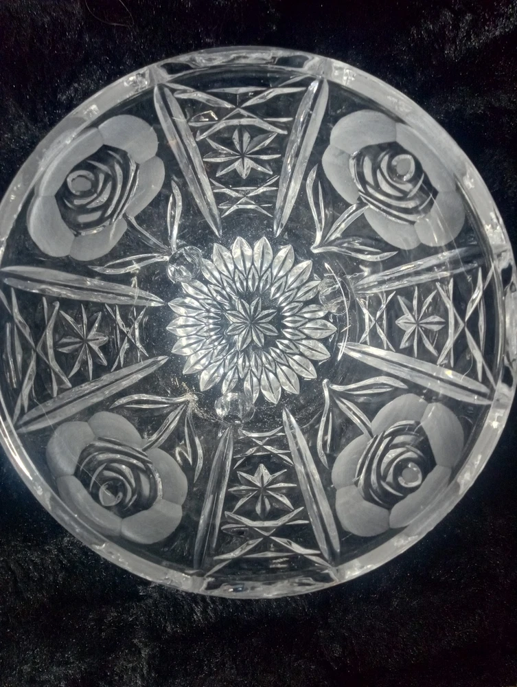 This vintage Bavarian Crystal candy serving dish is a three-footed bowl with a round shape and clear color. It features an art deco style with roses etched on the frosted finish. The bowl is from 1946 and made of crystal in Germany. It is 6.25 inches in diameter, 4.5 inches in height, and weighs 1.12 lbs. Ideal for all occasions, this footed/pedestal bowl is a unique collectible piece with German/Barvarian cultural influences. A1-03