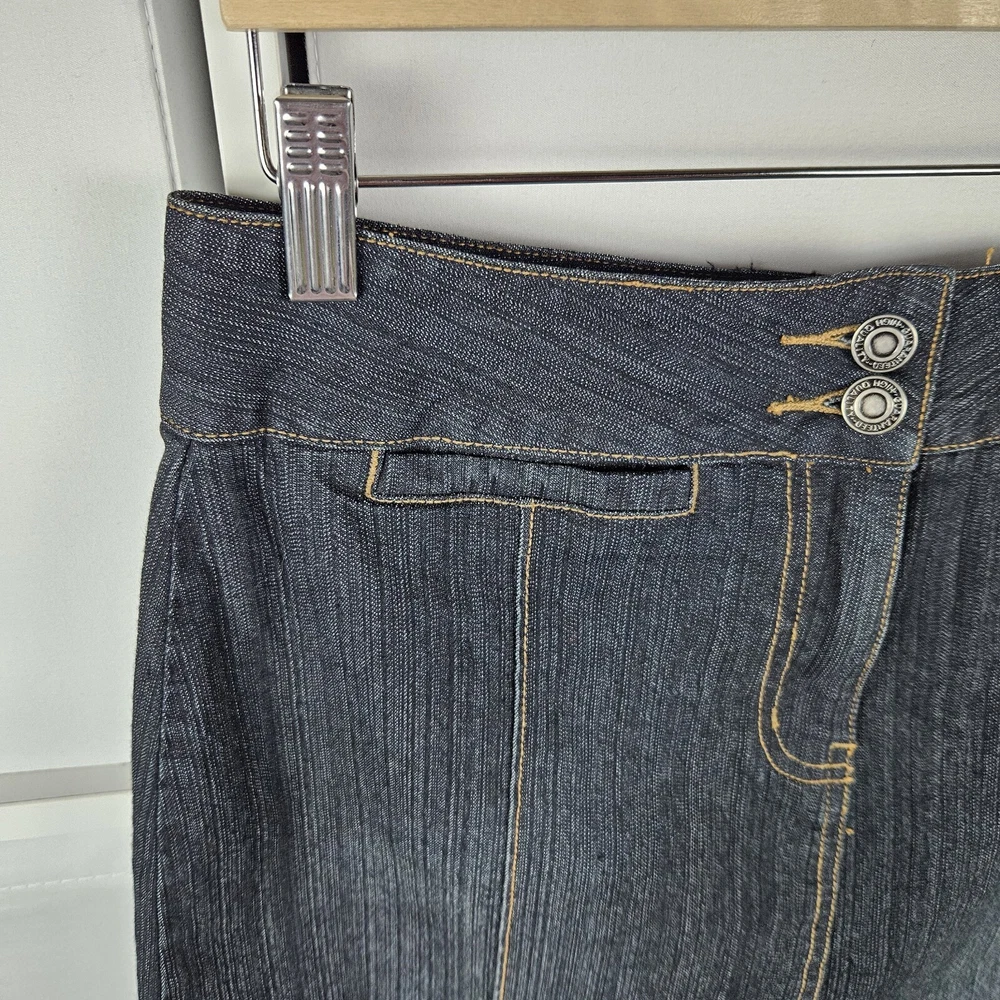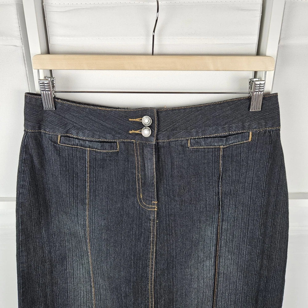 Bay Trading denim skirt, size 12. Dark blue colour. A-line, pencil style. Knee length. Panelled design. Vintage Y2K skirt. In very good used condition. Approximate Measurements in inches: Waist: 15.5 Length: 25