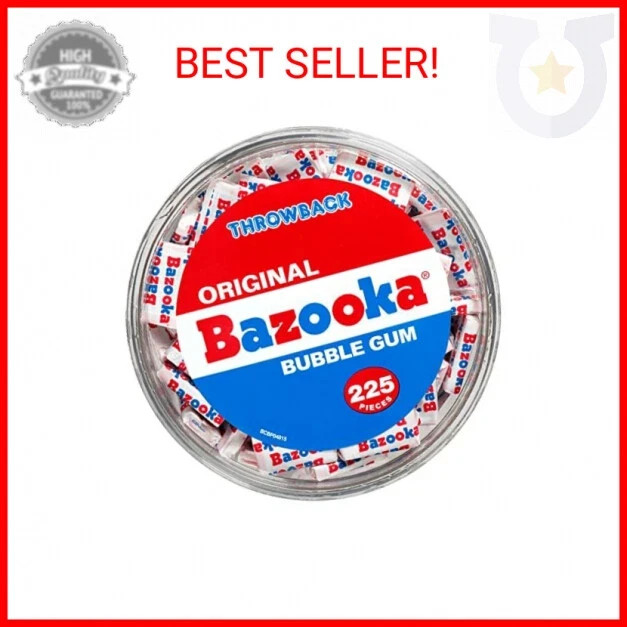 Bazooka Bubble Gum Individually Wrapped Pink Chewing Gum in Original Flavor - 225 Count Bulk Candy Tub - Fun Old Fashioned Candy for Kids BULK BUBBLE GUM: Unwrap the fun with Bazooka's iconic pink chewy bubble gum in bulk ORIGINAL BUBBLE GUM FLAVOR: Contains 225 individually-wrapped Bazooka bubble gum pieces in the signature original bubble gum flavor OLD FASHIONED CANDY: The bulk tub is designed as a throwback to the brand's classic old fashioned packaging. Makes a great retro gift for loved ones VINTAGE COMICS AND GAMES: Unwrap each piece for fun comics and puzzles as well as digital codes that unlock fun videos and games online SHELF STABLE GUM FOR ALL AGES: Perfect chewy bubble gum treat to have around the house for kids and the whole family to enjoy. Or bring as a snack or concession to your next event, because Bazooka Bubble Gum is loved by fans worldwide